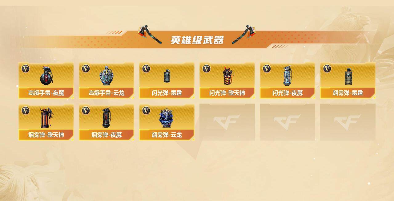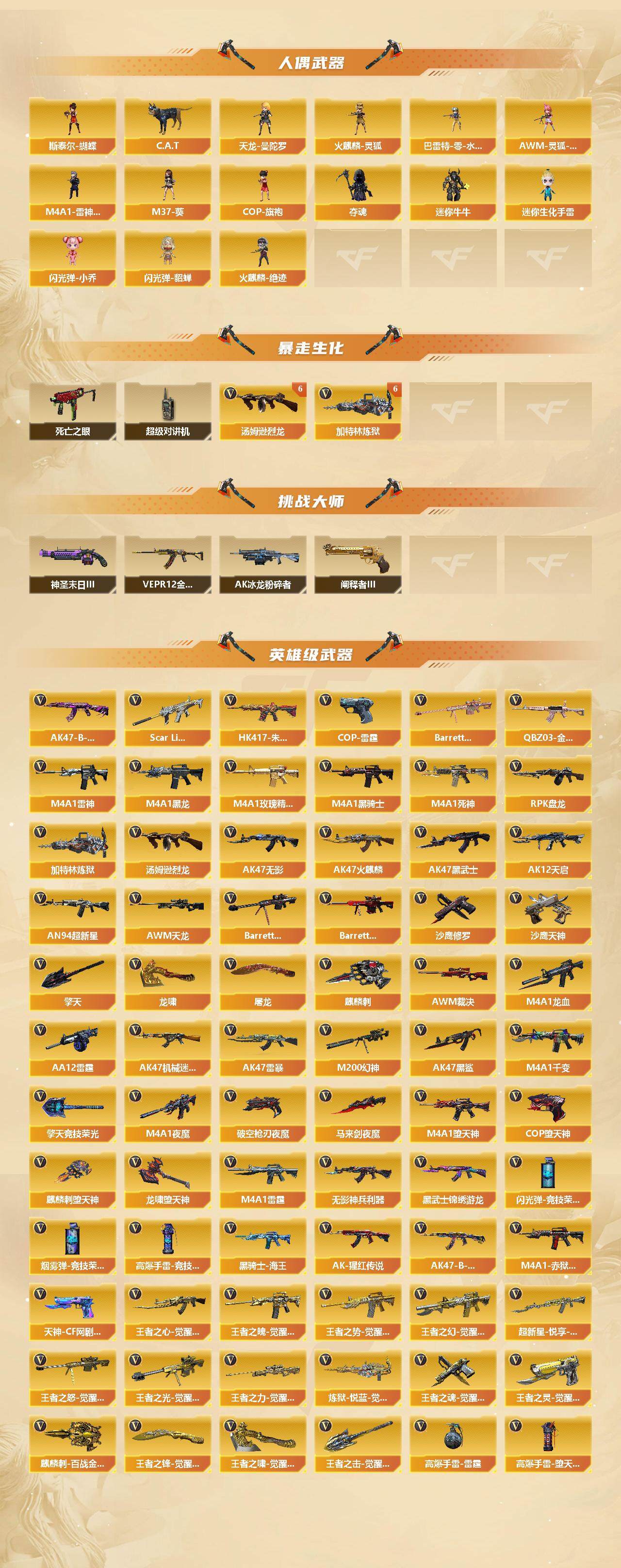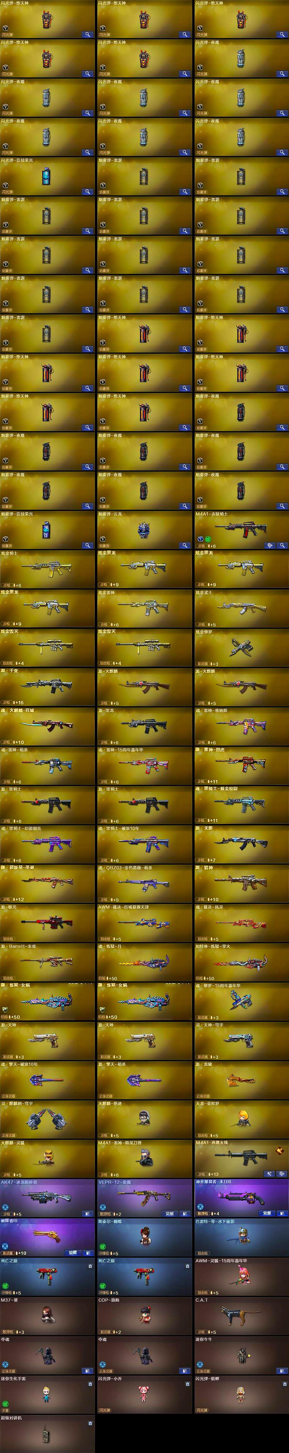 【热门武器】:QBZ03-金色蔷薇*2,Scar Light-白虎,HK417-朱雀,M200-幻神,死亡之眼*2,金色小号,C.A.T,M4A1-黑骑士*3,汤姆逊-烈龙*8,RPK-盘龙*4,加特林-炼狱*6,斯泰尔-蝴蝶,火麒麟-绝迹,COP-堕天神*2,沙鹰-修罗*6,金刚伞