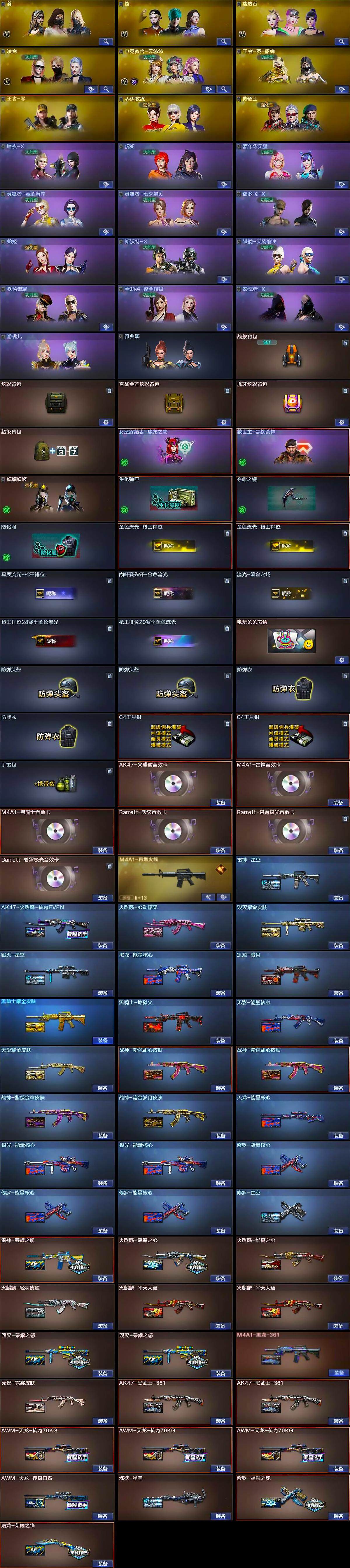 - [11687976]总资产:349.6M 1干员外观 8传说枪械 哈夫币:61.104K 可二次 可修改实名 优质装备:顶级安全箱(3x3) 烽火地带段位:黄金 全面战场段位:军士长 传说武器皮肤:AK-12突击步枪-夜鹰,SMG45冲锋枪-骑士,93R-捞点薯条,AWM狙击步枪-捞点薯条,腾龙突击步枪-捞点薯条,CAR-15突击步枪-阿米娅,复合弓-黑-天际线,M4A1突击步枪-阿米娅 史诗武器皮肤:AUG突击步枪-蝮蛇,Ash-12战斗步枪-守夜人,AS Val突击步枪-尖端治疗,SG552突击步枪-尖端治疗,PKM通用机枪-荒野求生,SG552突击步枪-深海恐惧,AKM突击步枪-林中猎手,SR-3M紧凑突击步枪-荒野求生,M1014霰弹枪-林中猎手,PTR-32突击步枪-英雄,SVD狙击步枪-荒野求生,M250通用机枪-囚徒,腾龙突击步枪-无垢,MP7冲锋枪-无垢,PSG-1射手步枪-无垢,QBZ95-1突击步枪-曙光,沙漠之鹰-曙光,S12K霰弹枪-曙光,PKM通用机枪-英雄 干员外观:蜂医-送葬人·无题密令(S5)