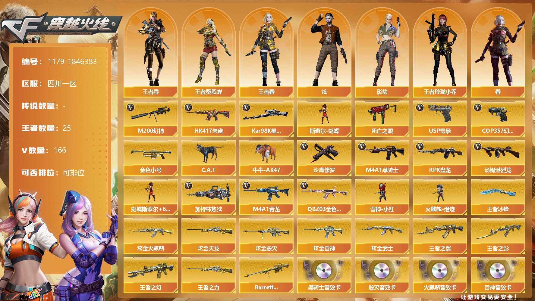 [14986193]四川一区-166V-25王者-6炫金 【热门武器】:QBZ03-金色蔷薇,HK417-朱雀,M4A1-青龙,M200-幻神,死亡之眼,Kar98K-星神,金色小号,C.A.T,牛牛-AK47,M4A1-黑骑士*3,汤姆逊-烈龙*6,RPK-盘龙*4,加特林-炼狱*3,斯泰尔-蝴蝶,雷神-小红,火麒麟-绝迹,USP-雷暴,COP 357-幻灵*2,沙鹰-修罗*4 【王者炫金武器】:王者之幻,王者