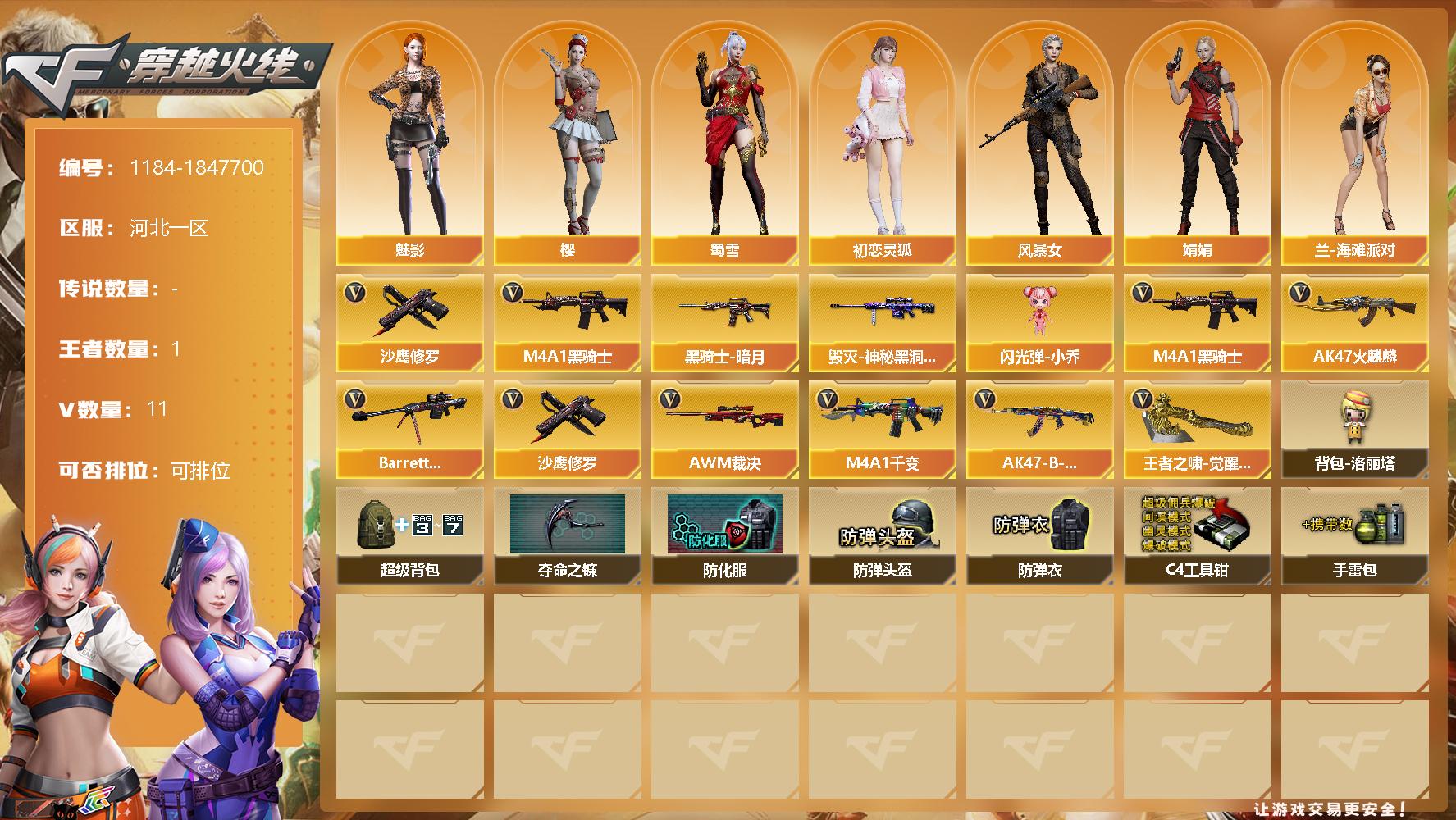 [14986479]河北一区-11V-1王者-0炫金 【热门武器】:M4A1-黑骑士*2,沙鹰-修罗 【皮肤】:毁灭-神秘黑洞皮肤,黑骑士-暗月 【角色】:樱,魅影,初恋灵狐,风暴女,娟娟,兰-海滩派对,灵狐者-七夕宝贝,龙儿,龙儿-小淘气,潘多拉-甜心教官,潜龙队-X,斯沃特-X,蜀雪 【人偶武器】:闪光弹-小乔 【英雄级武器】:M4A1-千变,AK47-火麒麟,M4A1-黑骑士*2,AK47-B-战神,Bar