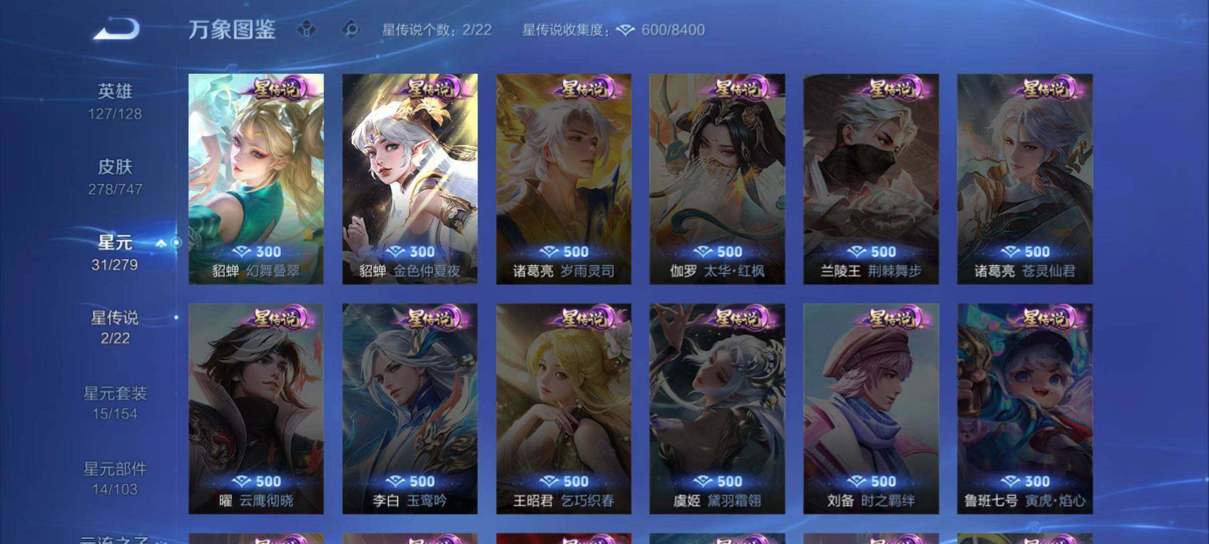 【限定皮肤】:白起狰,蒙犽顽岩魄,蔡文姬夏日便利店,大乔绒语心约,虞姬夏日便利店,姜子牙天穹之誓,狄仁杰阴阳师,赵云皇家上将,妲己时之彼端,嬴政优雅恋人,庄周高山流水,高渐离死亡摇滚,高渐离玩趣恶龙,白起夜都怪侠,芈月重明,夏侯惇朔风刀,甄姬游园惊梦,曹操烛龙,典韦穷奇,马可波罗暗影游猎,狄仁杰魔术师,狄仁杰万华元夜,达摩沙漠行僧,项羽海滩派对,老夫子醍醐杖,貂蝉逐梦之音,程咬金演武夺筹,兰陵王金庭之子,牛魔御旌,李元芳银河之约,虞姬霸王别姬,虞姬启明星使,钟馗驱傩正仪,杨玉环遇见飞天,雅典娜黎明之约,蔡文姬繁星吟游,太乙真人饕餮,太乙真人华丽摇滚,鬼谷子原初探秘者,苏烈千军破阵,百里玄策原初追逐者,弈星混沌棋,梦奇顽趣,沈梦溪星空之诺,明世隐疑决卦,裴擒虎李小龙,狂铁御狮,盾山御銮,猪八戒西部大镖客,上官婉儿梁祝,嫦娥拒霜思,蒙犽狂想玩偶喵,鲁班大师探海日志,艾琳流音漫舞,妲己灵卜魔法,鬼谷子天穹祈灯,沈梦溪龙舞盛年,鲁班七号蔬乡物语,刘邦剑破天穹,周瑜熔金海岸