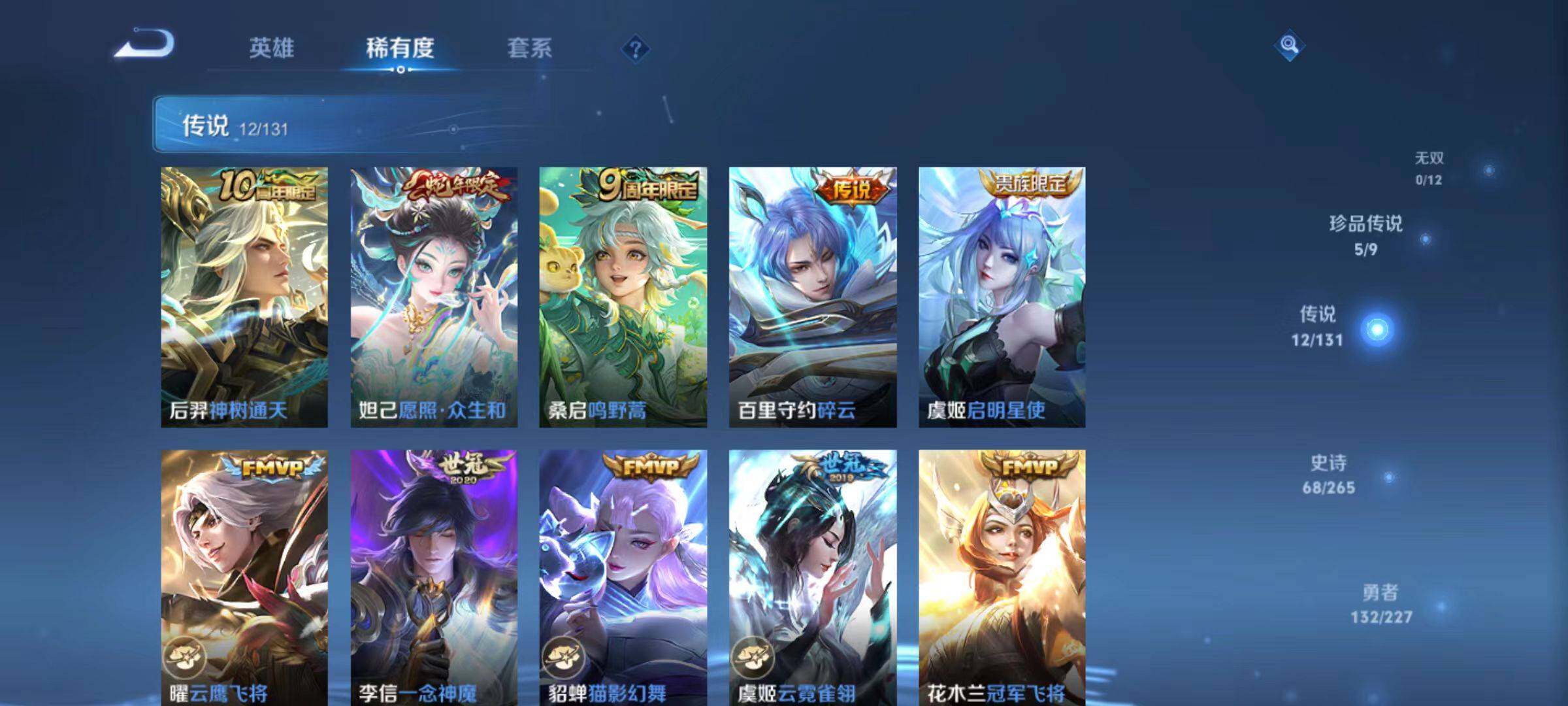 【传说皮肤】:后羿神树通天,妲己愿照众生和,桑启鸣野蒿,百里守约碎云,虞姬启明星使,曜云鹰飞将,李信一念神魔,貂蝉猫影幻舞,虞姬云霓雀翎,花木兰冠军飞将,梦奇胖达荣荣,貂蝉仲夏夜之梦