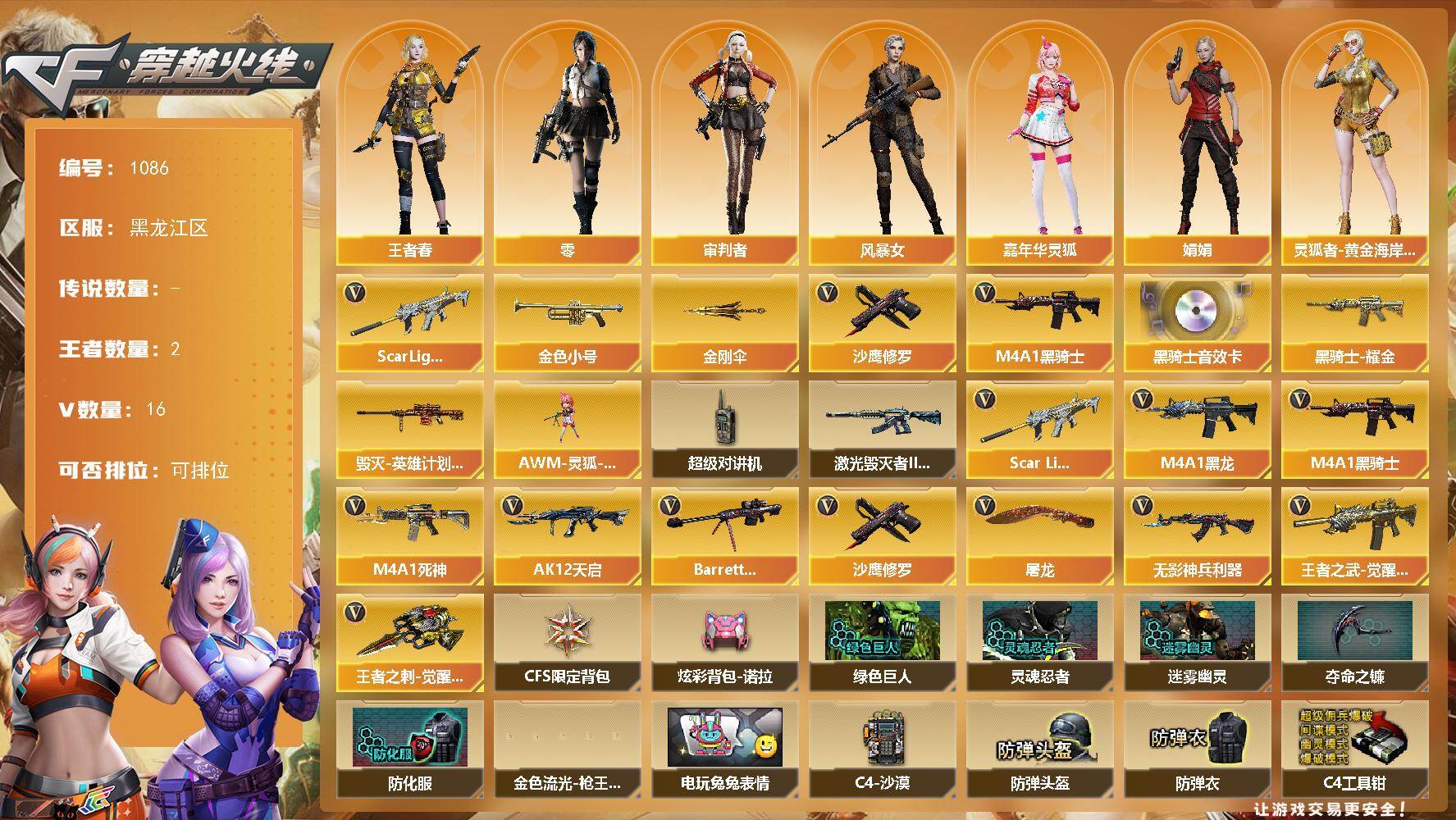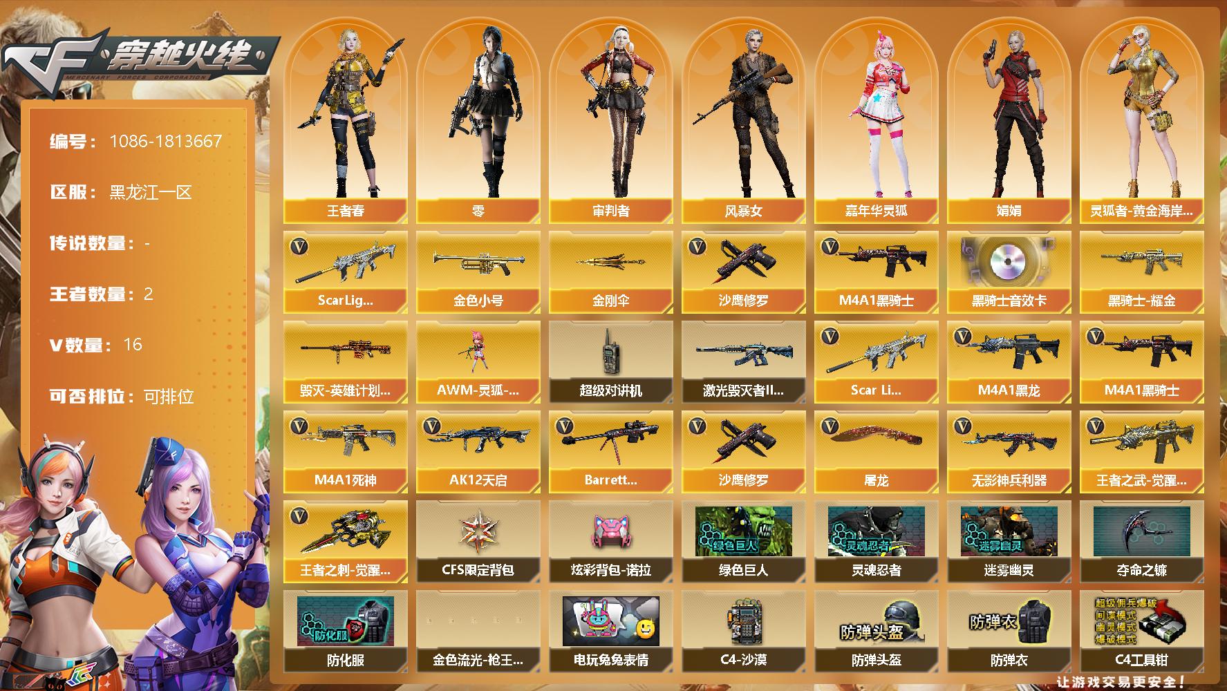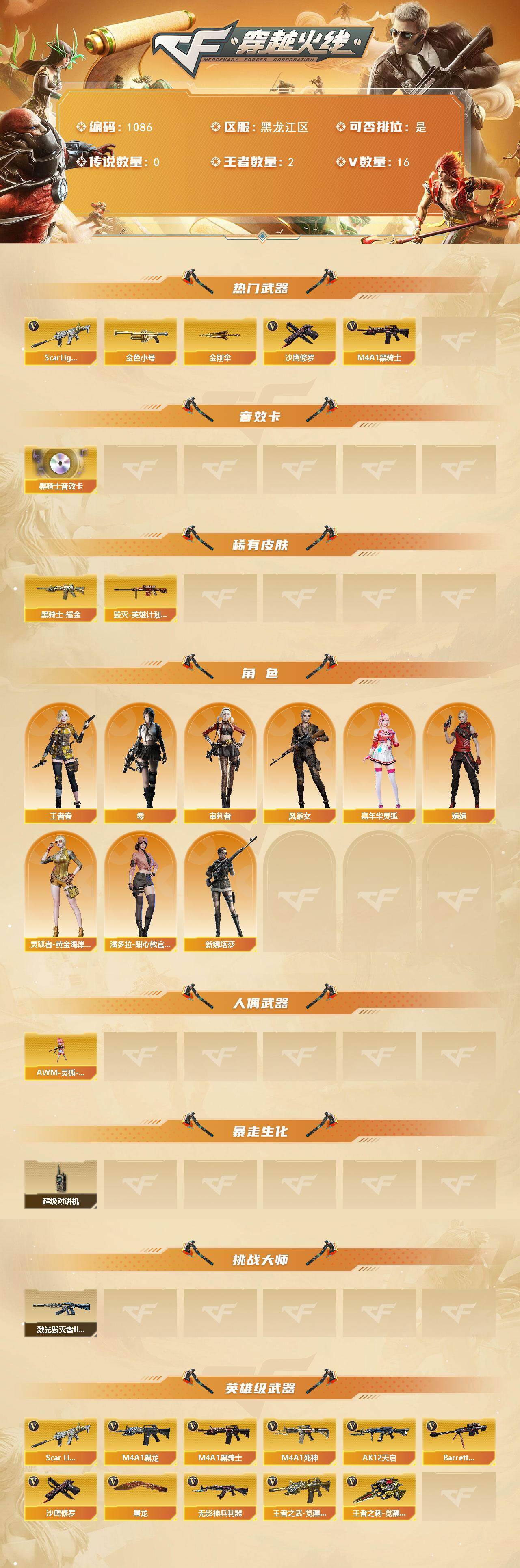 [14989604]黑龙江区-16V-2王者-0炫金 【热门武器】:Scar Light-白虎,金色小号,M4A1-黑骑士,沙鹰-修罗,金刚伞*2 【音效卡】:M4A1-黑骑士音效卡 【皮肤】:毁灭-英雄计划 皮肤,黑骑士耀金皮肤 【角色】:零,审判者,王者春,风暴女,嘉年华灵狐,娟娟,灵狐者-黄金海岸,潘多拉-甜心教官,新娜塔莎 【人偶武器】:AWM-灵狐-15周年嘉年华 【暴走生化】:超级对讲机 【挑战大师】