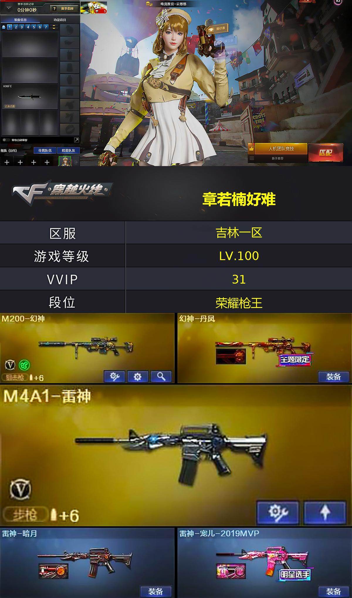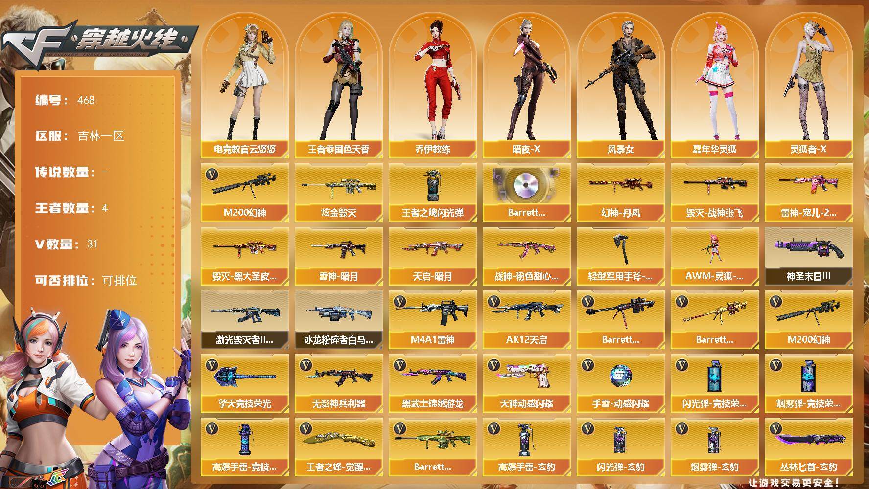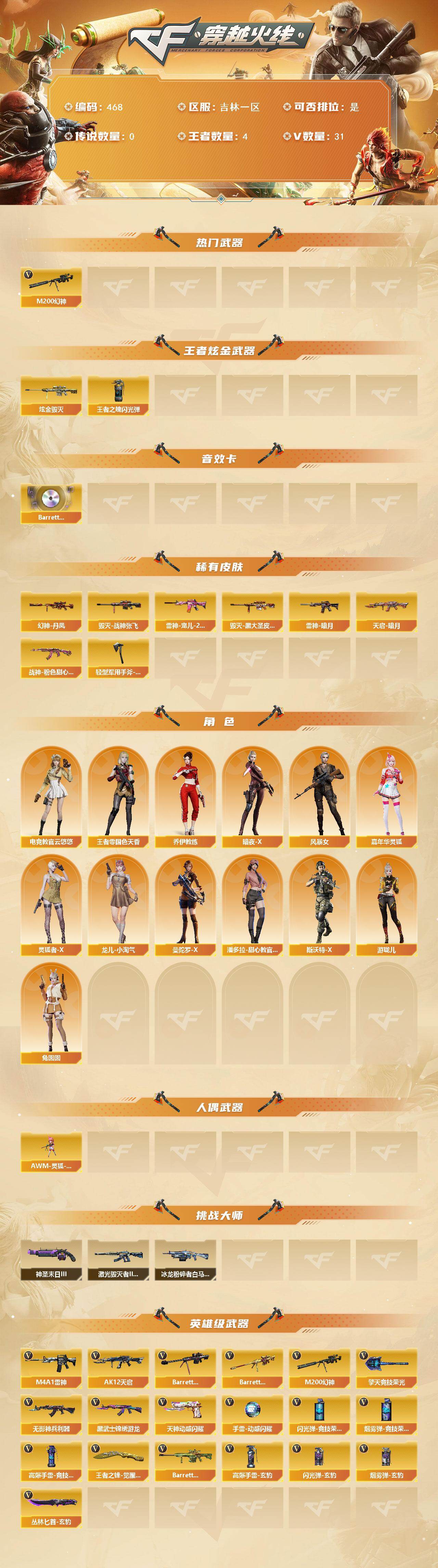[14989728]吉林一区-31V-4王者-1炫金 【热门武器】:M200-幻神 【王者炫金武器】:炫金毁灭,王者之魄闪光弹*2 【音效卡】:Barrett-碧霄极光音效卡 【皮肤】:幻神-丹凤,雷神-暗月,雷神-宠儿-2019MVP,毁灭-战神张飞,毁灭-黑大圣皮肤,天启-暗月,战神-粉色甜心皮肤,轻型军用手斧-再燃火线 【角色】:电竞教官-云悠悠,王者-零-国色天香,乔伊教练,暗夜-X,风暴女,嘉年华灵狐,灵狐者-X,龙儿-小淘气,曼陀罗-X,潘多拉-甜心教官,斯沃特-X,兔囡囡,游珑儿 【人偶武器】:AWM-灵狐-15周年嘉年华 【挑战大师】:冰龙粉碎者-白马银枪,激光毁灭者III-白马银枪,神圣爆裂者-末日III 【英雄级武器】:M4A1-雷神,AK12-天启,无影-神兵利器,黑武士-锦绣游龙,Barrett-毁灭,M200-幻神,Barrett-朱雀,天神-动感闪耀,擎天-竞技荣光,王者之锋-觉醒版,丛林匕首-玄豹,高爆手雷-竞技荣光,手雷-动感闪耀,高爆手雷-玄豹*3,闪光弹-竞技荣光*2,闪光弹-玄豹,烟雾弹-竞技荣光,烟雾弹-玄豹*3,Barrett-碧霄极光 【道具】:BS战队炫彩背包,CFS限定背包,全能枪王背包,超级背包,绿色巨人,灵魂忍者,迷雾幽灵,夺命之镰,防化服*3,金色流光-枪王排位*2,星辰流光-枪王排位,枪王排位28赛季金色流光,EP战队名片,C4-红龙,防弹头盔*3,防弹衣*3,C4工具钳*3,手雷包*3 【特殊枪械】: