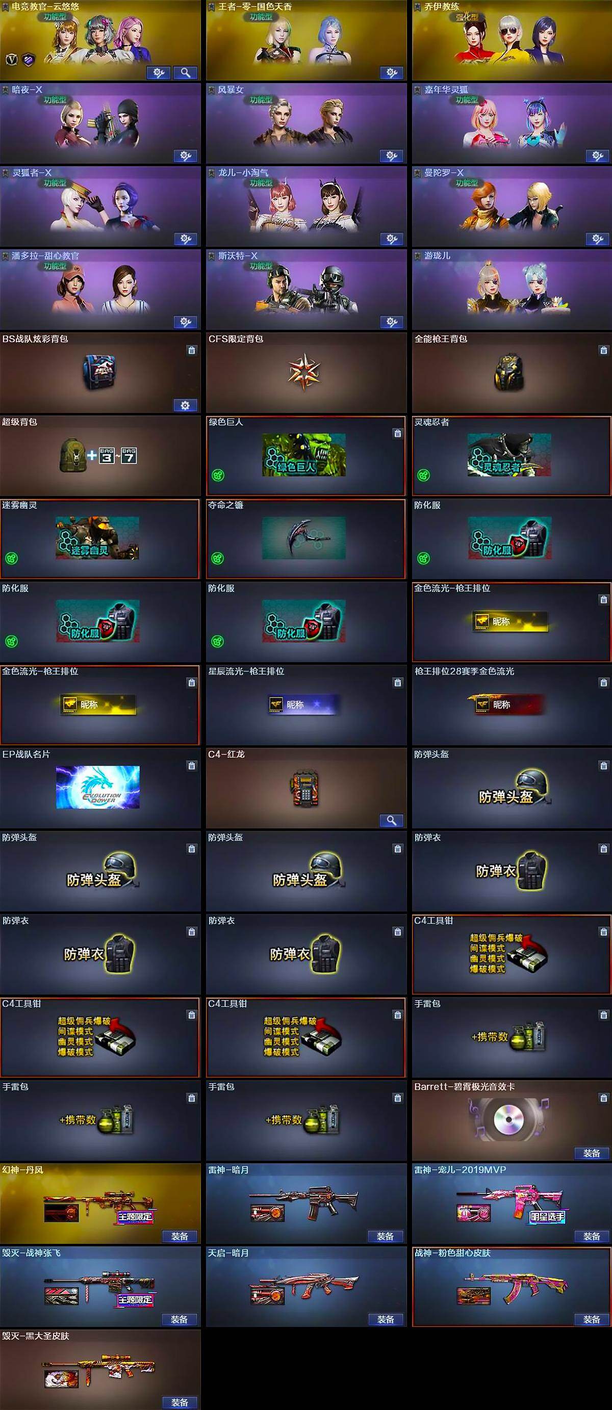 【道具】:BS战队炫彩背包,CFS限定背包,全能枪王背包,超级背包,绿色巨人,灵魂忍者,迷雾幽灵,夺命之镰,防化服*3,金色流光-枪王排位*2,星辰流光-枪王排位,枪王排位28赛季金色流光,EP战队名片,C4-红龙,防弹头盔*3,防弹衣*3,C4工具钳*3,手雷包*3