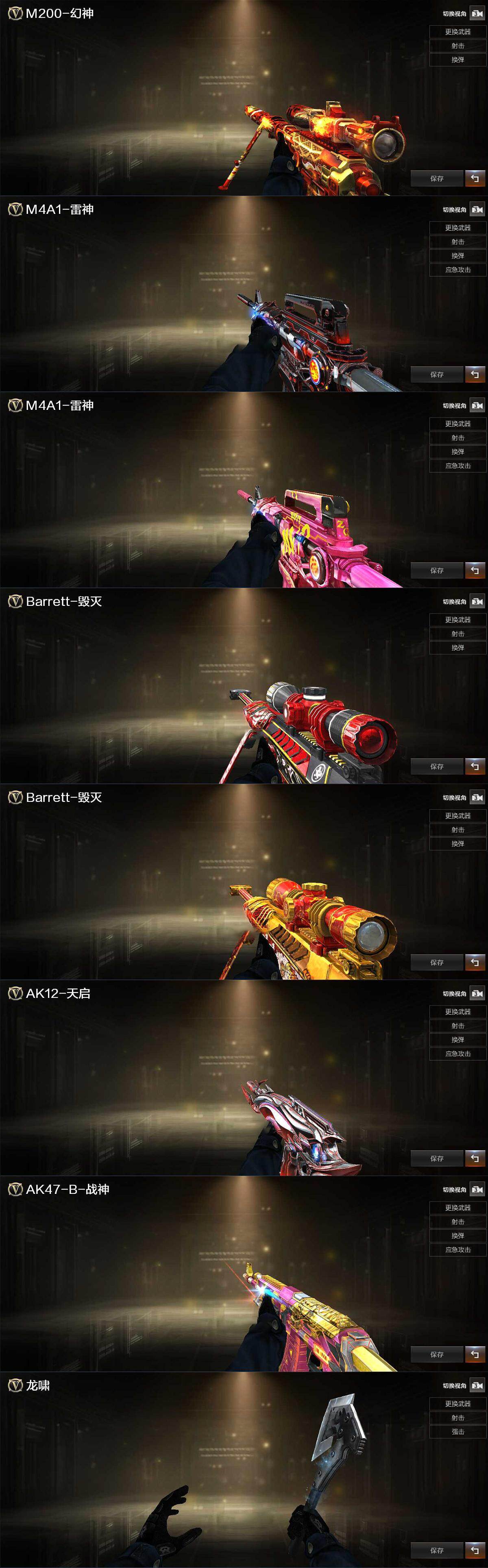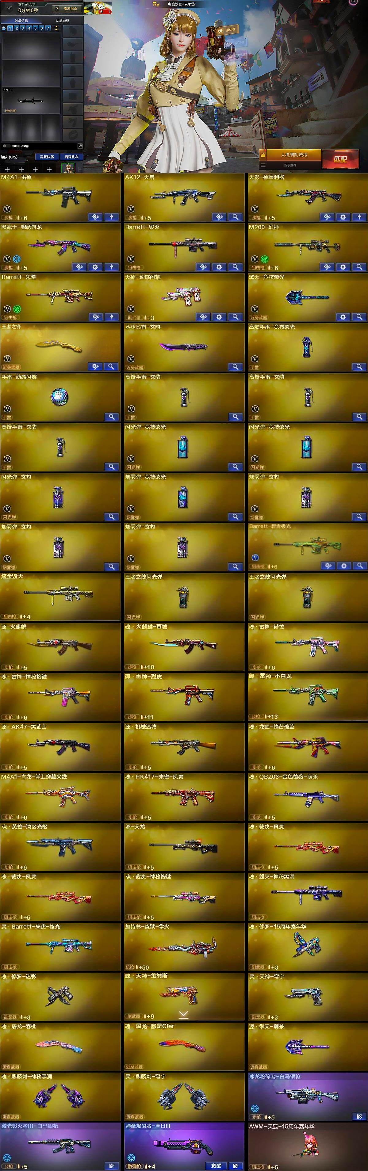【英雄级武器】:M4A1-雷神,AK12-天启,无影-神兵利器,黑武士-锦绣游龙,Barrett-毁灭,M200-幻神,Barrett-朱雀,天神-动感闪耀,擎天-竞技荣光,王者之锋-觉醒版,丛林匕首-玄豹,高爆手雷-竞技荣光,手雷-动感闪耀,高爆手雷-玄豹*3,闪光弹-竞技荣光*2,闪光弹-玄豹,烟雾弹-竞技荣光,烟雾弹-玄豹*3,Barrett-碧霄极光