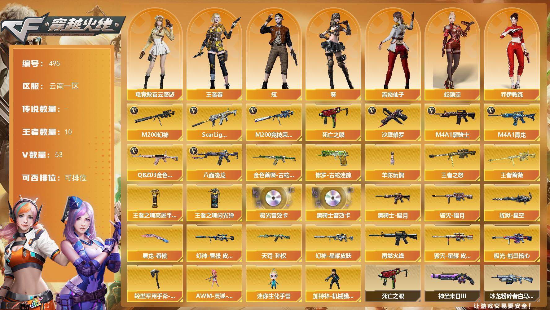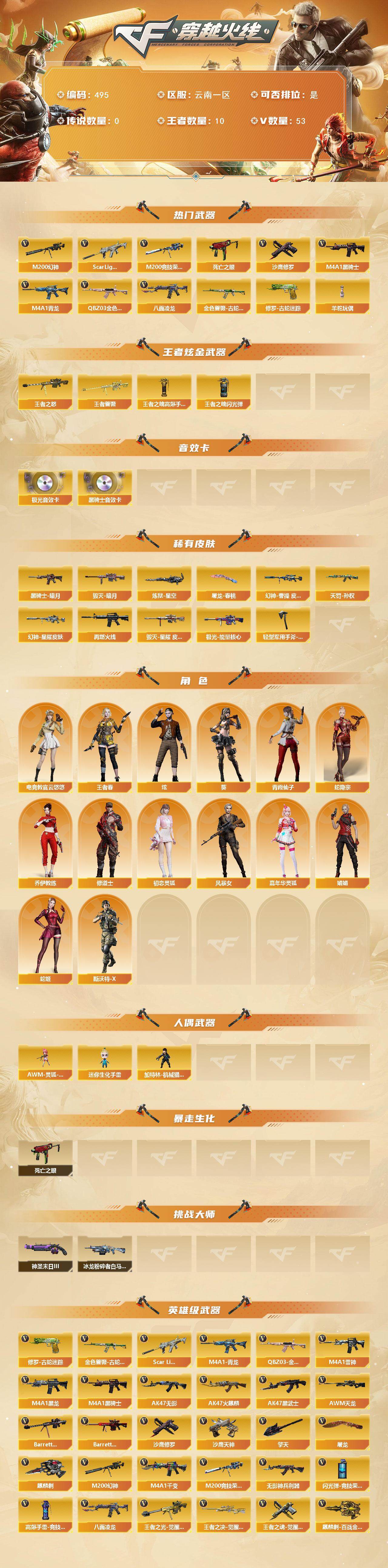[14990304]云南一区-53V-10王者-0炫金 【热门武器】:QBZ03-金色蔷薇,Scar Light-白虎,M4A1-青龙,M200-幻神,金色蔷薇-古蛇迷踪,修罗-古蛇迷踪,M200-竞技荣光,八面凌龙,死亡之眼*3,M4A1-黑骑士,羊驼玩偶,沙鹰-修罗 【王者炫金武器】:王者之怒,王者蔷薇,王者之魄高爆手雷,王者之魄闪光弹*2 【音效卡】:M4A1-黑骑士音效卡,Barrett-极光音效卡 【皮肤】:幻神-星耀 皮肤,幻神-曹操 皮肤,M4A1-再燃火线,毁灭-暗月,毁灭-星耀 皮肤,黑骑士-暗月,天罚-孙权 皮肤,极光-能量核心,炼狱-星空,屠龙-春桃 皮肤,轻型军用手斧-再燃火线 【角色】:葵,炫,电竞教官-云悠悠,王者春,蛇隐宗,乔伊教练,修道士,初恋灵狐,风暴女,嘉年华灵狐,娟娟,青霞仙子,蛇姬,斯沃特-X 【人偶武器】:加特林-机械猎手,AWM-灵狐-15周年嘉年华,迷你生化手雷 【暴走生化】:死亡之眼*3 【挑战大师】:冰龙粉碎者-白马银枪*2,神圣爆裂者-末日III 【英雄级武器】:M4A1-千变,AK47-火麒麟*2,M4A1-黑龙,M4A1-雷神,M4A1-黑骑士,AK47-无影,AK47-黑武士,M4A1-青龙,Scar Light-白虎,无影-神兵利器,八面凌龙,金色蔷薇-古蛇迷踪,QBZ03-金色蔷薇,AWM-天龙,Barrett-毁灭,Barrett-极光,M200-幻神,M200-竞技荣光,王者之光-觉醒版,王者之决-觉醒版,沙鹰-修罗,沙鹰-天神*3,王者之魂-觉醒版,修罗-古蛇迷踪,屠龙,擎天,麒麟刺*3,麒麟刺-百战金芒,王者之锋-觉醒版,高爆手雷-雷霆*4,高爆手雷-雷暴,高爆手雷-幻灵,高爆手雷-竞技荣光,高爆手雷-古蛇迷踪,闪光弹-雷霆*4,闪光弹-雷暴,闪光弹-竞技荣光,烟雾弹-雷霆*4,烟雾弹-古蛇迷踪 【道具】:CFS限定背包,古蛇迷踪炫彩背包,炫彩背包,百战金芒炫彩背包,超级背包,女皇终结者-魔龙之吻,绿色巨人,灵魂忍者,迷雾幽灵,夺命之镰,防化服*3,金色流光-枪王排位*2,星辰流光-枪王排位,枪王排位28赛季金色流光,枪王排位29赛季金色流光,古蛇迷踪打击特效,蛇隐宗表情,萌萌小葵表情,EP战队名片,EP战队喷图,防弹头盔*4,防弹衣*4,C4工具钳*4,手雷包*4 【特殊枪械】:1白虎,1黑骑士
