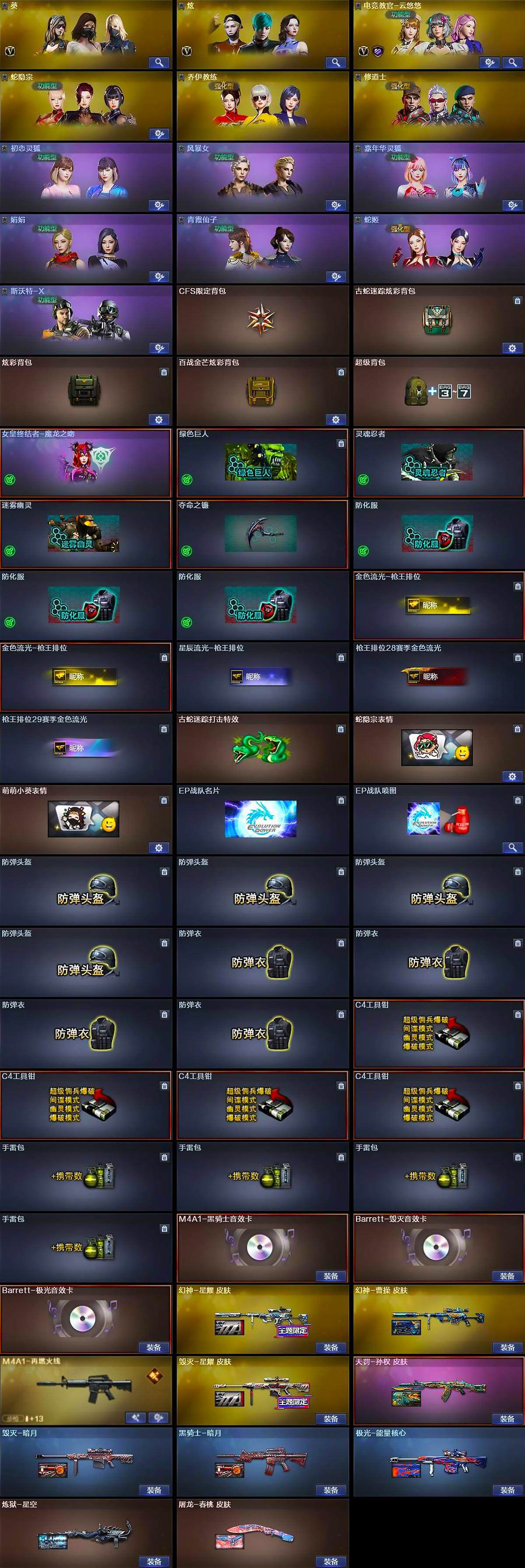 【道具】:CFS限定背包,古蛇迷踪炫彩背包,炫彩背包,百战金芒炫彩背包,超级背包,女皇终结者-魔龙之吻,绿色巨人,灵魂忍者,迷雾幽灵,夺命之镰,防化服*3,金色流光-枪王排位*2,星辰流光-枪王排位,枪王排位28赛季金色流光,枪王排位29赛季金色流光,古蛇迷踪打击特效,蛇隐宗表情,萌萌小葵表情,EP战队名片,EP战队喷图,防弹头盔*4,防弹衣*4,C4工具钳*4,手雷包*4