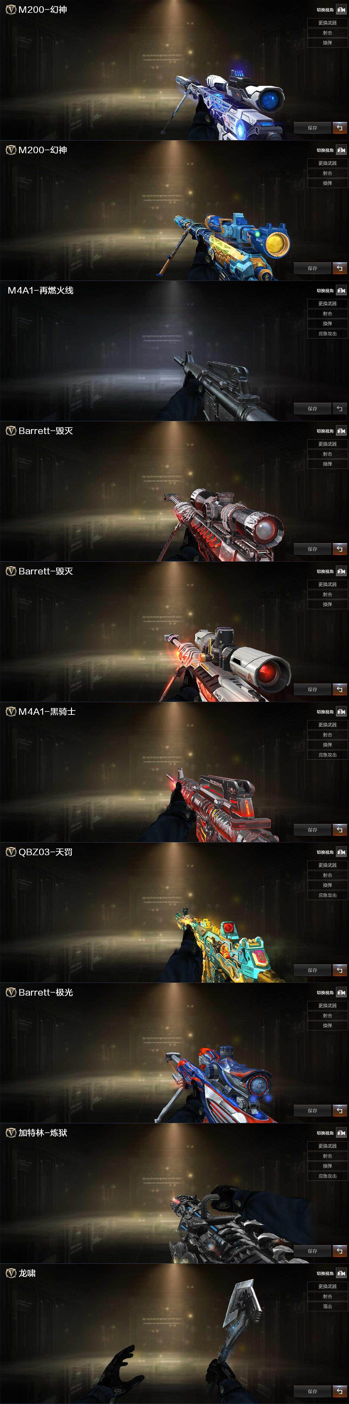 【热门武器】:QBZ03-金色蔷薇,Scar Light-白虎,M4A1-青龙,M200-幻神,金色蔷薇-古蛇迷踪,修罗-古蛇迷踪,M200-竞技荣光,八面凌龙,死亡之眼*3,M4A1-黑骑士,羊驼玩偶,沙鹰-修罗