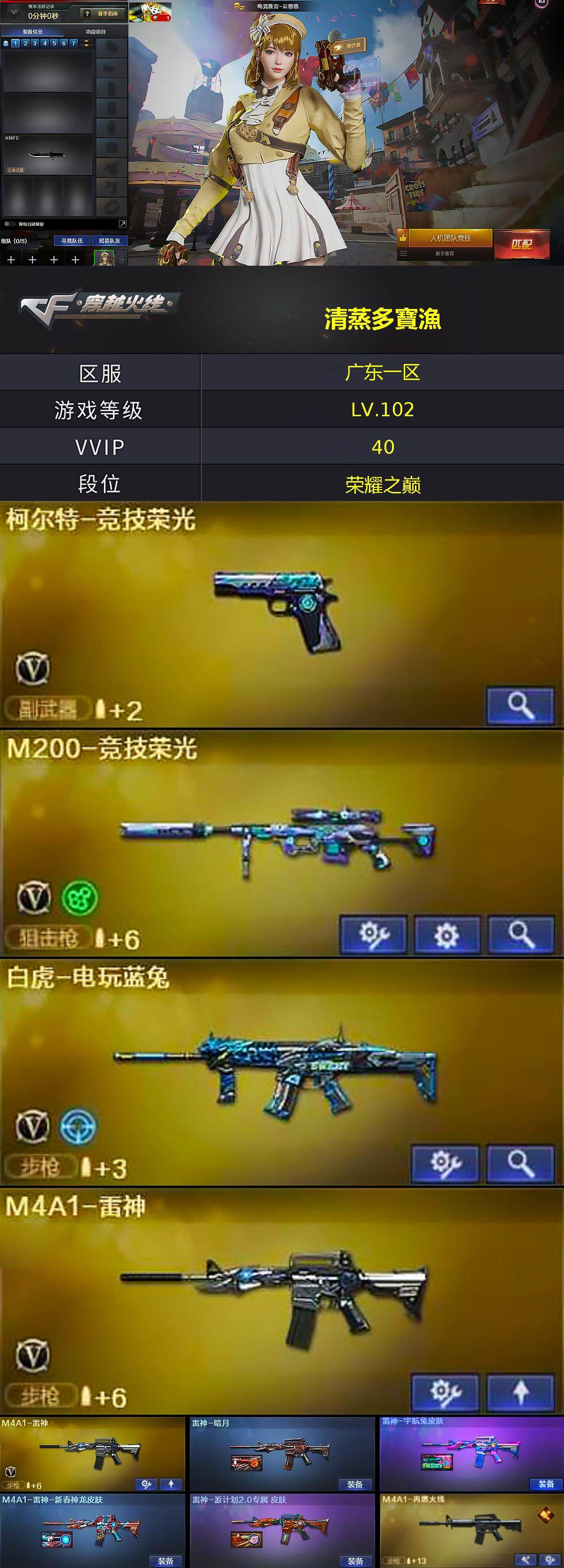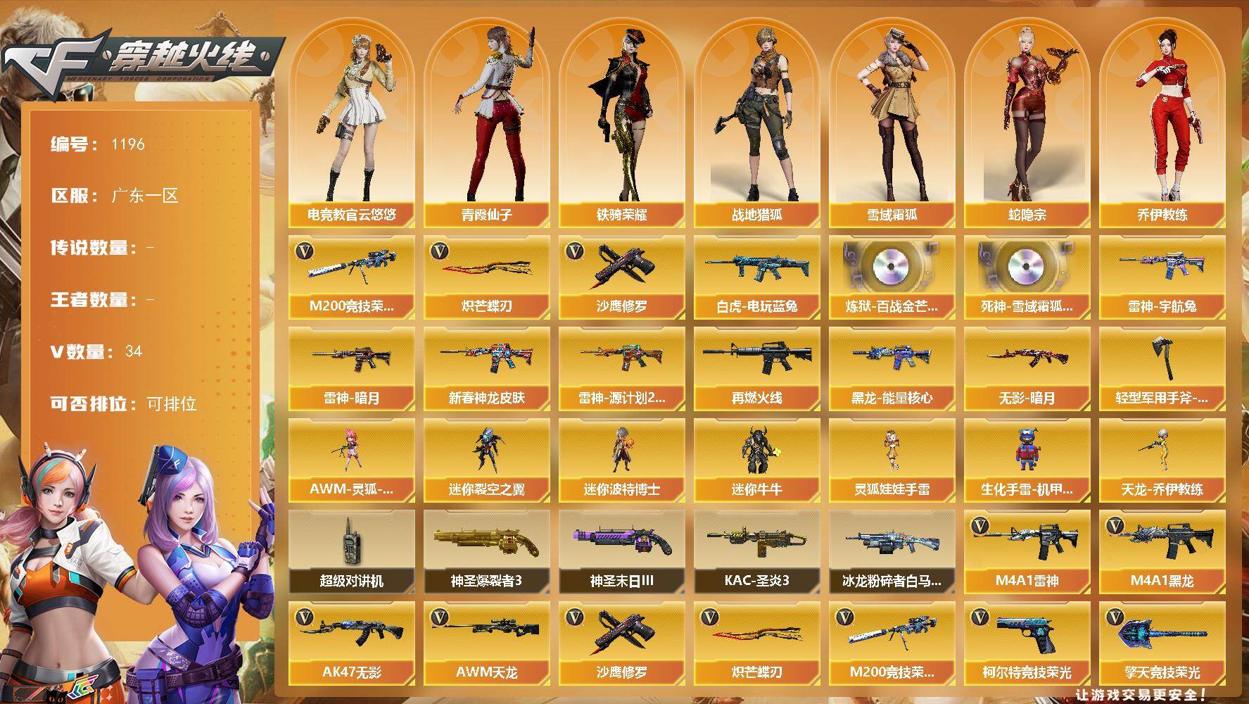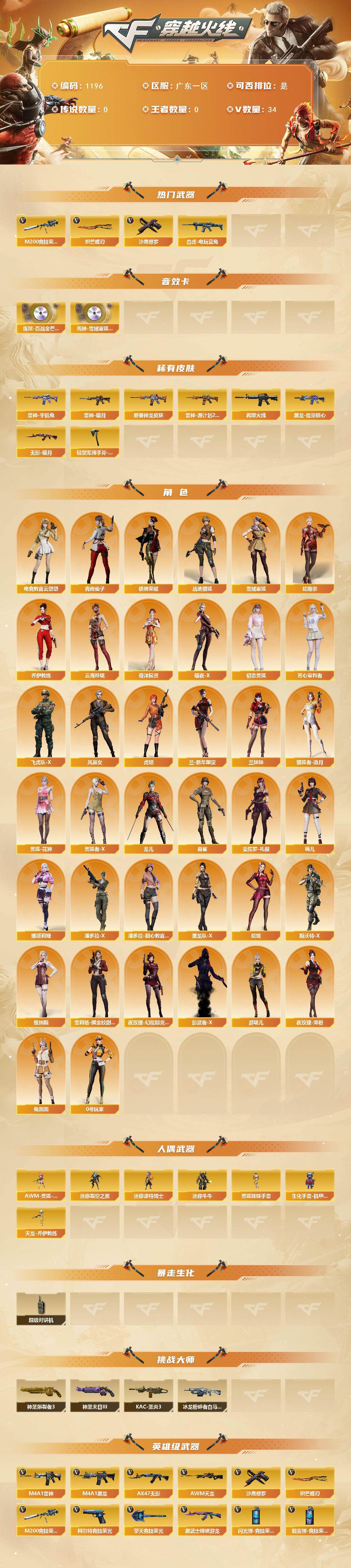 [14990626]广东一区-34V-0王者-0炫金 【热门武器】:M200-竞技荣光,白虎-电玩蓝兔,沙鹰-修罗,炽芒蝶刃 【音效卡】:炼狱-百战金芒-庆典舞曲音效卡,死神-雪域霜狐-怀旧音效卡 【皮肤】:雷神-暗月,雷神-宇航兔皮肤,M4A1-雷神-新春神龙皮肤,雷神-源计划2.0专属 皮肤,M4A1-再燃火线,黑龙-能量核心,无影-暗月,轻型军用手斧-再燃火线 【角色】:电竞教官-云悠悠,战地猎狐,雪域霜狐,蛇隐宗,奇洋探员,乔伊教练,云海玲珑,暗夜-X,初恋灵狐,芳心审判者,飞虎队-X,风暴女,虎妞,兰-新年限定,兰妹妹,猎狐者-追月,0号玩家,灵狐-花神,灵狐者-X,龙儿,麻雀,曼陀罗-礼服,萌儿,娜塔莉娅,潘多拉-X,潘多拉-甜心教官,潜龙队-X,青霞仙子,蛇姬,斯沃特-X,铁骑荣耀,兔囡囡,维纳斯,雪莉杨-摸金校尉,夜玫瑰-幻能朋克,夜玫瑰-宠粉,影武者-X,游珑儿 【人偶武器】:天龙-乔伊教练,AWM-灵狐-15周年嘉年华,迷你裂空之翼,迷你波特博士*2,迷你牛牛,生化手雷-机甲核心,灵狐娃娃手雷*2 【暴走生化】:超级对讲机 【挑战大师】:神圣爆裂者III,冰龙粉碎者-白马银枪*2,KAC-圣炎切割者III,神圣爆裂者-末日III 【英雄级武器】:M4A1-黑龙,M4A1-雷神*2,AK47-无影,黑武士-锦绣游龙,超新星-热带奇洋,死神-雪域霜狐,黑骑士-海王,白虎-电玩蓝兔,AWM-天龙,M200-竞技荣光,炼狱-百战金芒,沙鹰-修罗,柯尔特-竞技荣光,擎天-竞技荣光*2,炽芒蝶刃,龙啸-热带奇洋,麒麟刺-百战金芒,高爆手雷-竞技荣光*2,手雷-热带奇洋,高爆手雷-古蛇迷踪,闪光弹-竞技荣光,烟雾弹-竞技荣光*3,烟雾弹-古蛇迷踪,M4A1-赤狱骑士,M4A1-苍鸣雷神,AWM-昌龙,Barrett-碧霄极光 【道具】:CFS限定背包,云山科技背包,亚洲杯纪念炫彩背包,奇洋探员-海龟背包,沙漠龙背包-猛男专属,炫彩背包,热带奇洋炫彩背包,牛魔王背包-至尊黄金,百战金芒炫彩背包,超级背包,雪域霜狐炫彩背包,哔哩哔哩名片,圣拳猎手-炽雪,女皇终结者-魔龙之吻,救世主-黑桃战神,黄金生化钩,绿色巨人,灵魂忍者*2,变异宝贝,迷雾幽灵*2,生化弹匣,夺命之镰,防化服*3,金色流光-枪王排位,星辰流光-枪王排位,巅峰赛先锋-金色流光,流光-鎏金之域,流光-再燃火线,枪王排