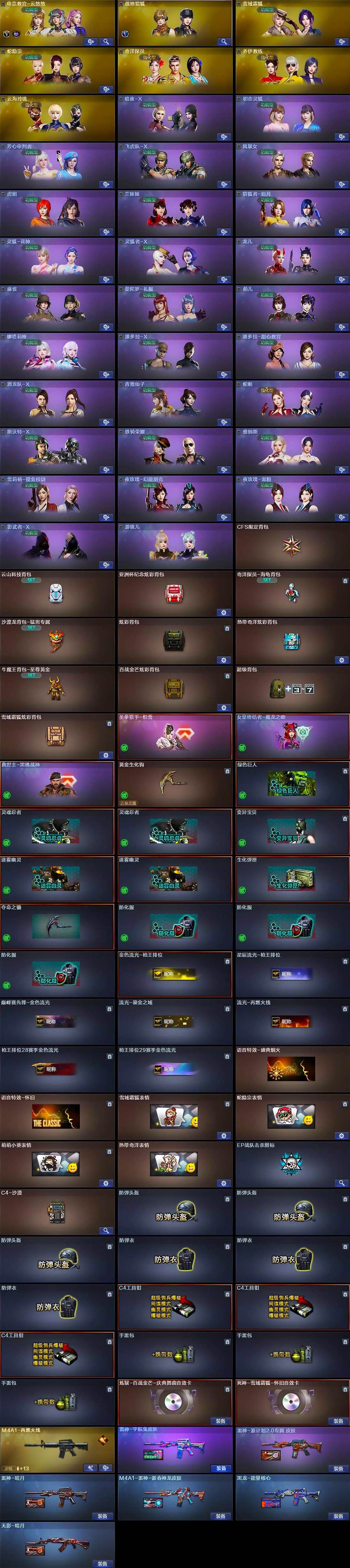 【道具】:CFS限定背包,云山科技背包,亚洲杯纪念炫彩背包,奇洋探员-海龟背包,沙漠龙背包-猛男专属,炫彩背包,热带奇洋炫彩背包,牛魔王背包-至尊黄金,百战金芒炫彩背包,超级背包,雪域霜狐炫彩背包,哔哩哔哩名片,圣拳猎手-炽雪,女皇终结者-魔龙之吻,救世主-黑桃战神,黄金生化钩,绿色巨人,灵魂忍者*2,变异宝贝,迷雾幽灵*2,生化弹匣,夺命之镰,防化服*3,金色流光-枪王排位,星辰流光-枪王排位,巅峰赛先锋-金色流光,流光-鎏金之域,流光-再燃火线,枪王排