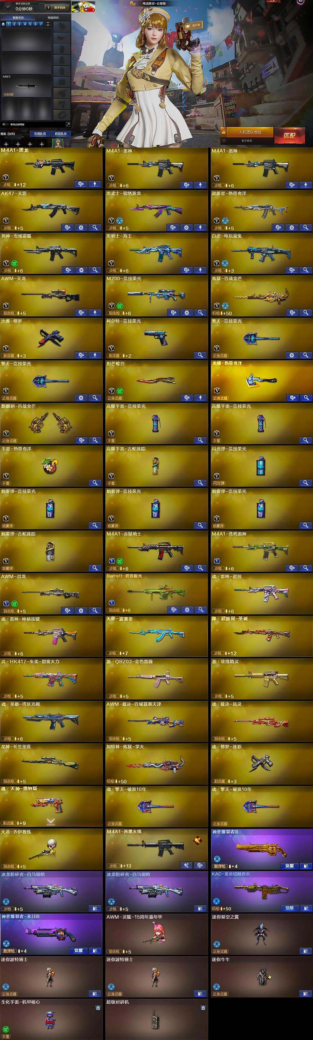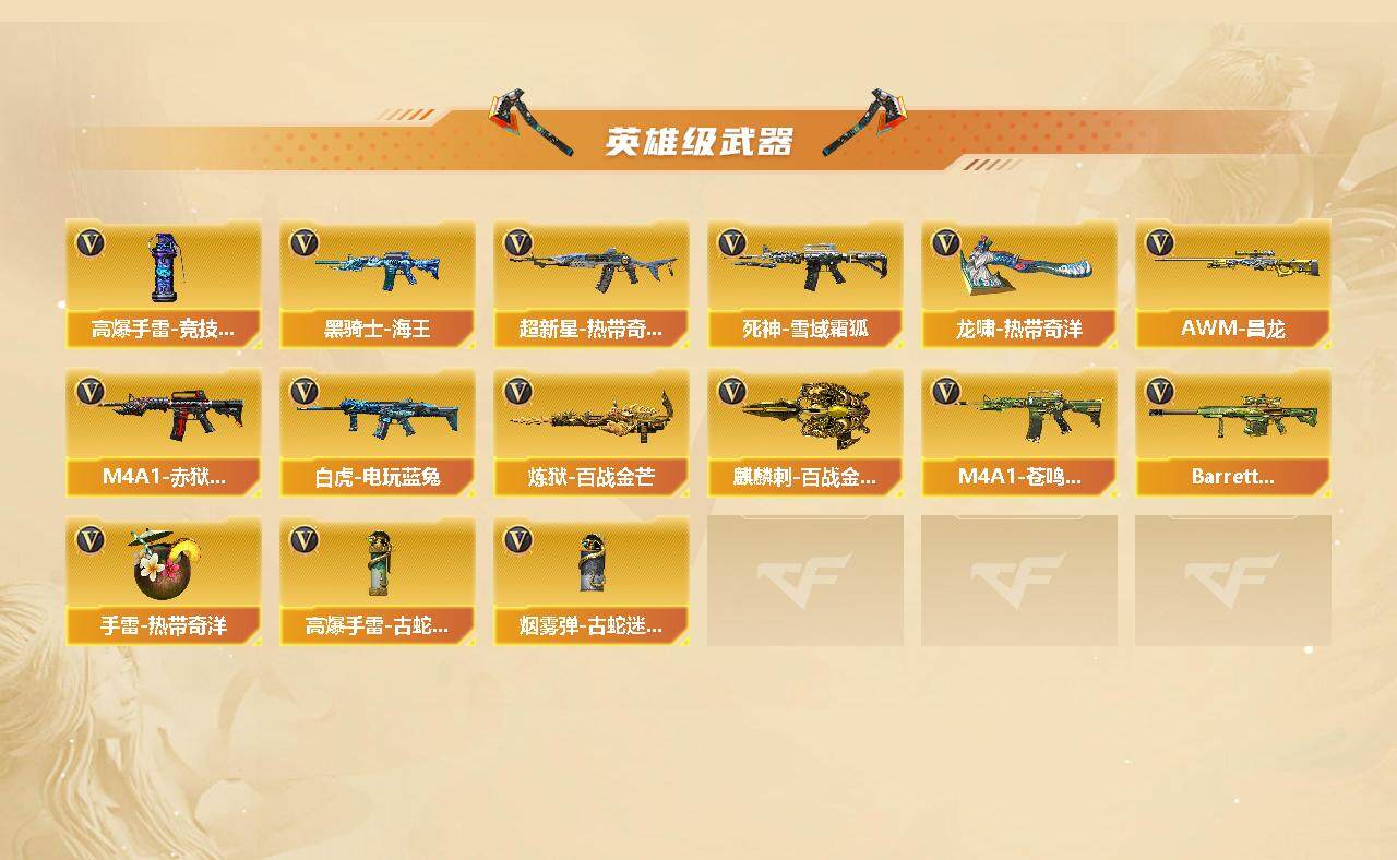 【英雄级武器】:M4A1-黑龙,M4A1-雷神*2,AK47-无影,黑武士-锦绣游龙,超新星-热带奇洋,死神-雪域霜狐,黑骑士-海王,白虎-电玩蓝兔,AWM-天龙,M200-竞技荣光,炼狱-百战金芒,沙鹰-修罗,柯尔特-竞技荣光,擎天-竞技荣光*2,炽芒蝶刃,龙啸-热带奇洋,麒麟刺-百战金芒,高爆手雷-竞技荣光*2,手雷-热带奇洋,高爆手雷-古蛇迷踪,闪光弹-竞技荣光,烟雾弹-竞技荣光*3,烟雾弹-古蛇迷踪,M4A1-赤狱骑士,M4A1-苍鸣雷神,AWM-昌龙,Barrett-碧霄极光
