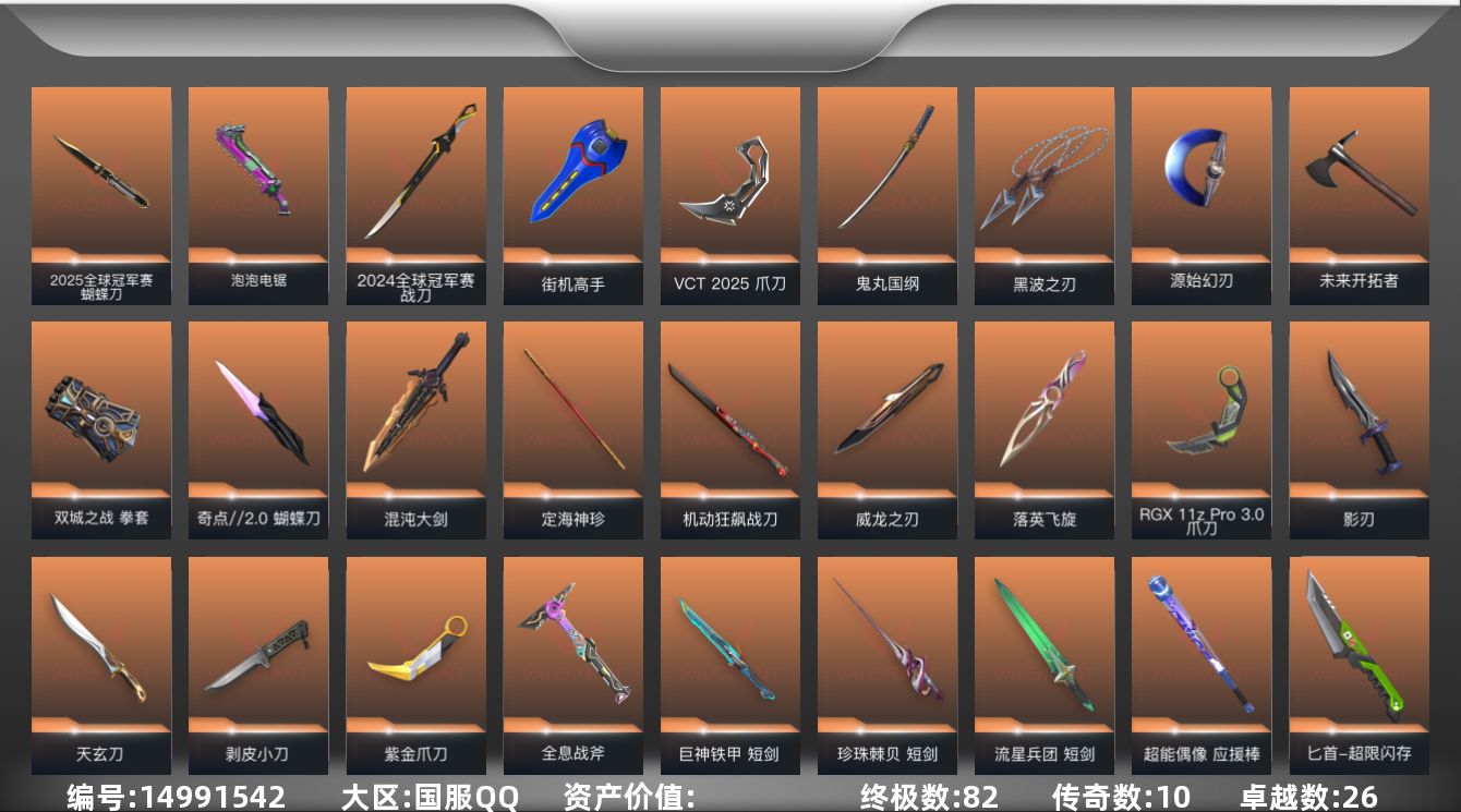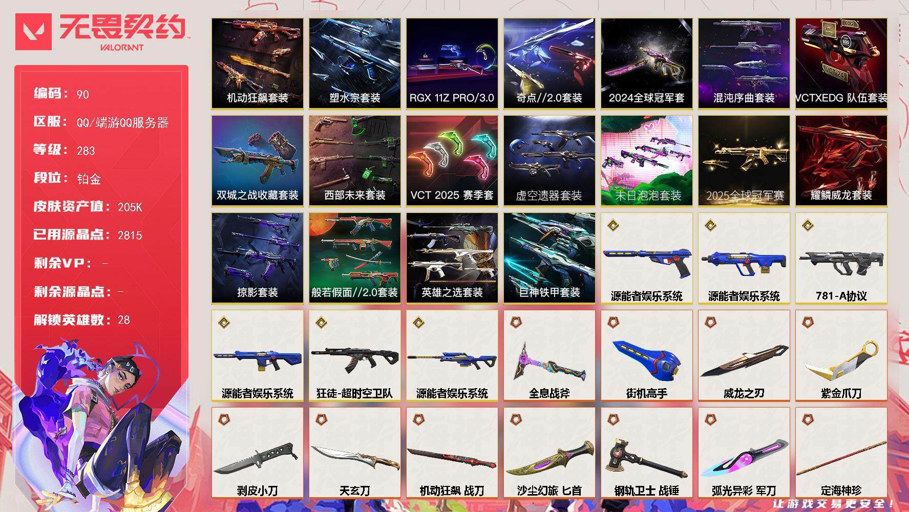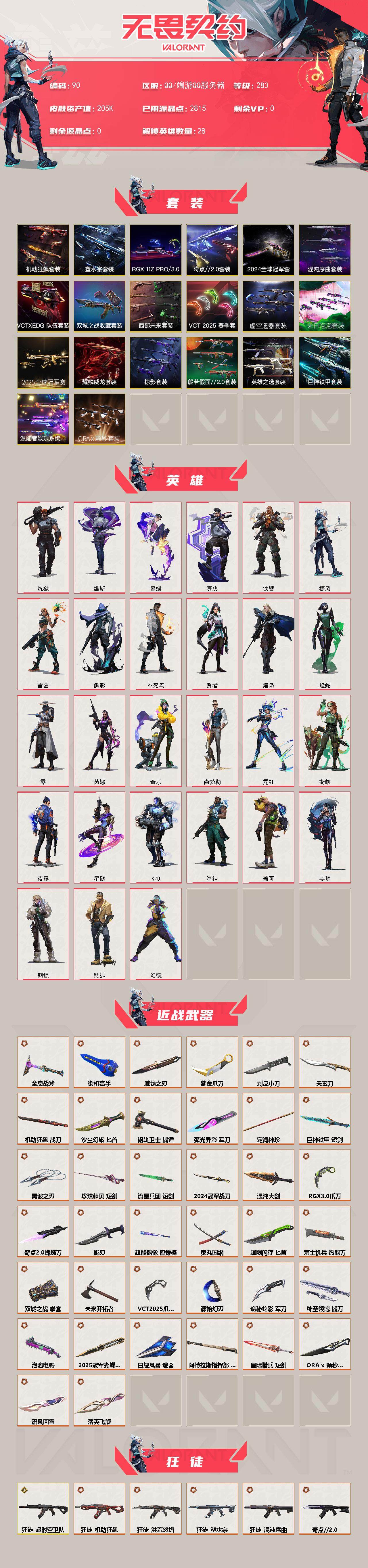 [14991542]【套装】:2025全球冠军赛套装,2024全球冠军赛套装,源能者娱乐系统套装,ORA x 颗秒套装,末日泡泡套装,虚空遗器套装,VCT 2025 赛季套装,西部未来套装,RGX 11z Pro//3.0套装,混沌序曲套装,塑水宗套装,《双城之战》收藏套装,奇点//2.0套装,机动狂飙套装,VCTxEDG 队伍套装,般若假面//2.0套装,掠影套装,耀鳞威龙套装,英雄之选套装,巨神铁甲套装 【英雄】:幻棱,炼狱,维斯,暮蝶,钛狐,壹决,铁臂,捷风,雷兹,幽影,不死鸟,贤者,猎枭,蝰蛇,零,芮娜,奇乐,尚勃勒,霓虹,斯凯,夜露,星礈,K/O,海神,盖可,黑梦,钢锁 【近战武器】:近战武器-2025全球冠军赛 蝴蝶刀,近战武器-2024全球冠军赛 战刀,近战武器-流风回雪,近战武器-ORA x 颗秒 军刀,近战武器-泡泡电锯,近战武器-剥皮小刀,近战武器-奇点//2.0 蝴蝶刀,近战武器-VCT 2025 爪刀,近战武器-紫金爪刀,近战武器-RGX 11z Pro//3.0 爪刀,近战武器-黑波之刃,近战武器-落英飞旋,近战武器-威龙之刃,近战武器-鬼丸国纲,近战武器-双城之战 拳套,近战武器-源始幻刃,近战武器-未来开拓者,近战武器-巨神铁甲 短剑,近战武器-珍珠棘贝 短剑,近战武器-混沌大剑,近战武器-流星兵团 短剑,近战武器-超能偶像 应援棒,近战武器-超限闪存 匕首,近战武器-定海神珍,近战武器-钢轨卫士 战锤,近战武器-弧光异彩 军刀,近战武器-荒土机兵 热能刀,近战武器-机动狂飙 战刀,近战武器-街机高手,近战武器-全息战斧,近战武器-沙尘幻旅 匕首,近战武器-天玄刀,近战武器-影刃,近战武器-诡秘蛇影 军刀,近战武器-神圣领域 战刀,近战武器-日耀风暴 遗器,近战武器-阿特拉斯指挥部 甩棍,近战武器-星际猎兵 短剑 【狂徒】:狂徒-超时空卫队,狂徒-2025全球冠军赛,狂徒-洪荒怒焰,狂徒-混沌序曲,狂徒-机动狂飙,狂徒-奇点//2.0,狂徒-双城之战,狂徒-塑水宗,狂徒-创·纪元,狂徒-虚空遗器,狂徒-RGX 11z Pro,狂徒-光荣异象,狂徒-多弥尔的复仇,狂徒-ORA x 颗秒,狂徒-般若假面//2.0,狂徒-掠影,狂徒-盖世英雄,狂徒-盖亚的复仇,狂徒-海洋之星,狂徒-耀鳞威龙,狂徒-紫阙金琅,狂徒-离子武器//2.0,狂徒-超能偶像,狂徒-钢轨