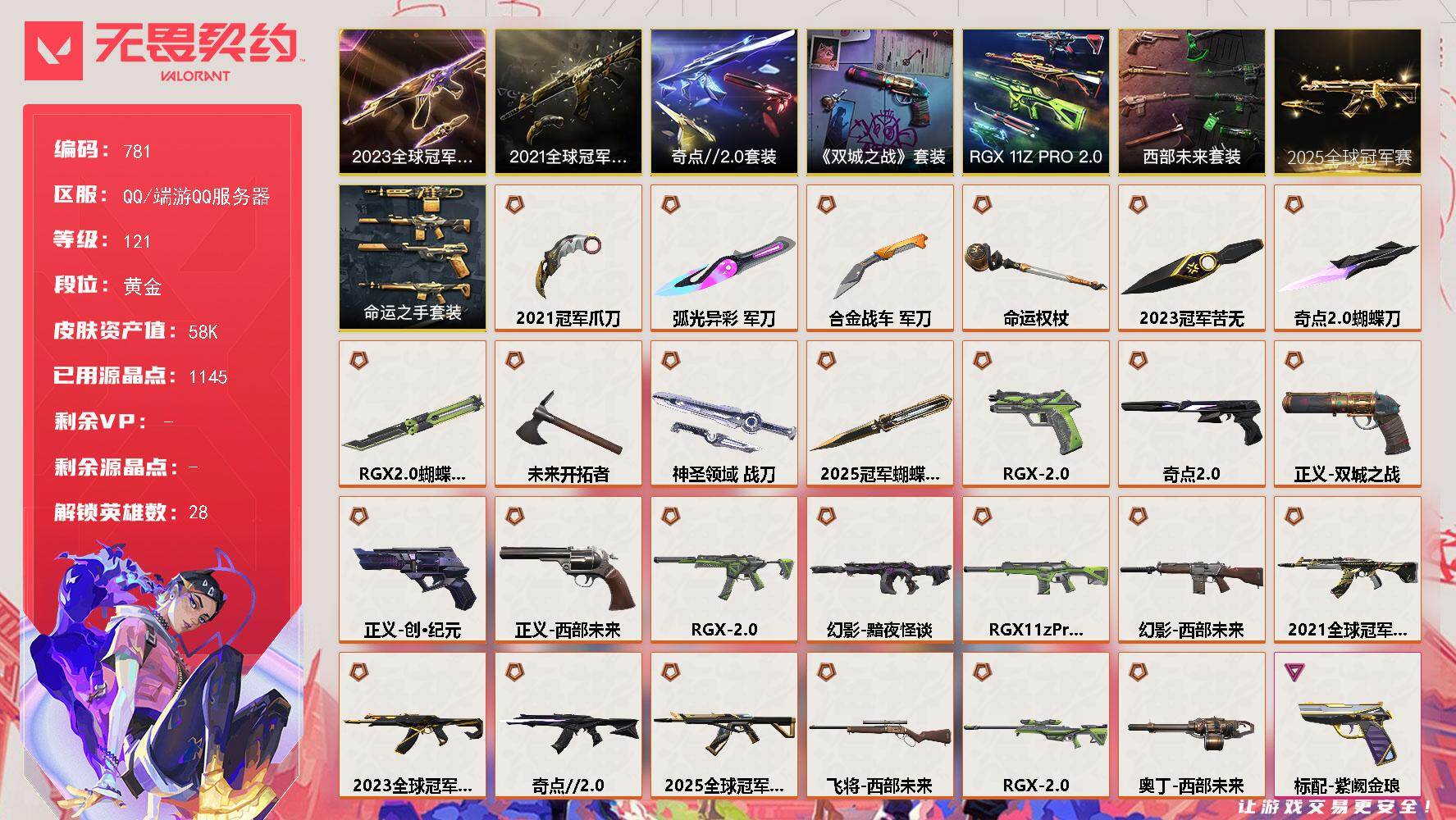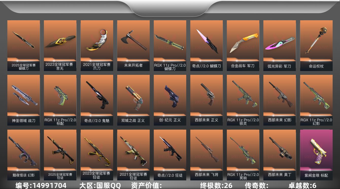 [14991704]【套装】:2025全球冠军赛套装,2023全球冠军赛套装,2021全球冠军赛套装,西部未来套装,RGX 11z Pro//2.0套装,《英雄联盟:双城之战》套装,奇点//2.0套装,命运之手套装 【英雄】:幻棱,炼狱,维斯,暮蝶,钛狐,壹决,铁臂,捷风,雷兹,幽影,不死鸟,贤者,猎枭,蝰蛇,零,芮娜,奇乐,尚勃勒,霓虹,斯凯,夜露,星礈,K/O,海神,盖可,黑梦,钢锁 【近战武器】:近战武器-2025全球冠军赛 蝴蝶刀,近战武器-2023全球冠军赛 苦无,近战武器-2021全球冠军赛 爪刀,近战武器-RGX 11z Pro//2.0 蝴蝶刀,近战武器-奇点//2.0 蝴蝶刀,近战武器-未来开拓者,近战武器-合金战车 军刀,近战武器-弧光异彩 军刀,近战武器-命运权杖,近战武器-神圣领域 战刀 【狂徒】:狂徒-2025全球冠军赛,狂徒-2023全球冠军赛,狂徒-2021全球冠军赛,狂徒-奇点//2.0,狂徒-弧光异彩,狂徒-沙尘幻旅 【幻影】:幻影-黯夜怪谈,幻影-RGX 11z Pro//2.0,幻影-西部未来,幻影-侦察力量,幻影-合金战车,幻影-噬源兽防卫工程,幻影-神圣领域,幻影-命运之手,幻影-西部未来 【戍卫】:戍卫-彩梦之城,戍卫-花漾粉红,戍卫-萌彩剪影,戍卫-命运之手,戍卫-月球哨兵 【獠犬】:獠犬-弧光异彩,獠犬-神圣领域,獠犬-胡桃狂想,獠犬-数码咒术 【冥驹】:冥驹-RGX 11z Pro//2.0,冥驹-起源,冥驹-胡桃狂想,冥驹-花漾粉红,冥驹-星云暗涌 【飞将】:飞将-西部未来,飞将-合金战车,飞将-沙尘幻旅,飞将-信手涂鸦 【莽侠】:莽侠-月球哨兵 【战神】:战神-神圣领域,战神-萌彩剪影,战神-数码咒术 【奥丁】:奥丁-西部未来,奥丁-命运之手,奥丁-信手涂鸦 【判官】:判官-萌彩剪影,判官-数码咒术 【雄鹿】:雄鹿-起源,雄鹿-彩梦之城,雄鹿-月球哨兵 【骇灵】:骇灵-RGX 11z Pro//2.0,骇灵-沙尘幻旅,骇灵-花漾粉红,骇灵-信手涂鸦,骇灵-星云暗涌 【蜂刺】:蜂刺-合金战车,蜂刺-弧光异彩,蜂刺-胡桃狂想,蜂刺-星云暗涌 【标配】:标配-RGX 11z Pro//2.0,标配-紫阙金琅,标配-彩梦之城 【正义】:正义-双城之战,正义-创·纪元,正义-西部未来,正义-超限闪存,正义-合金战车,正义-月球哨兵 【鬼魅】