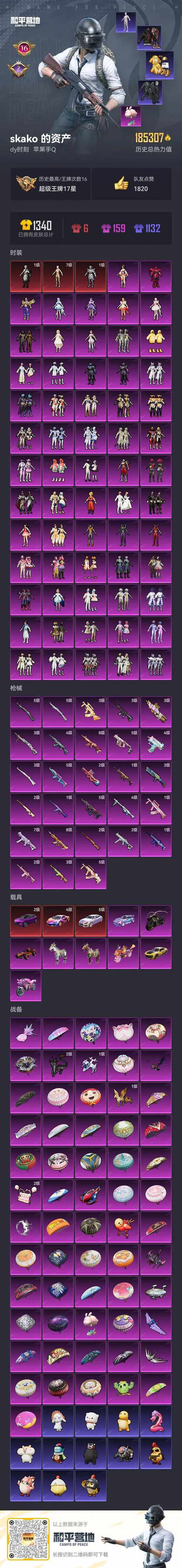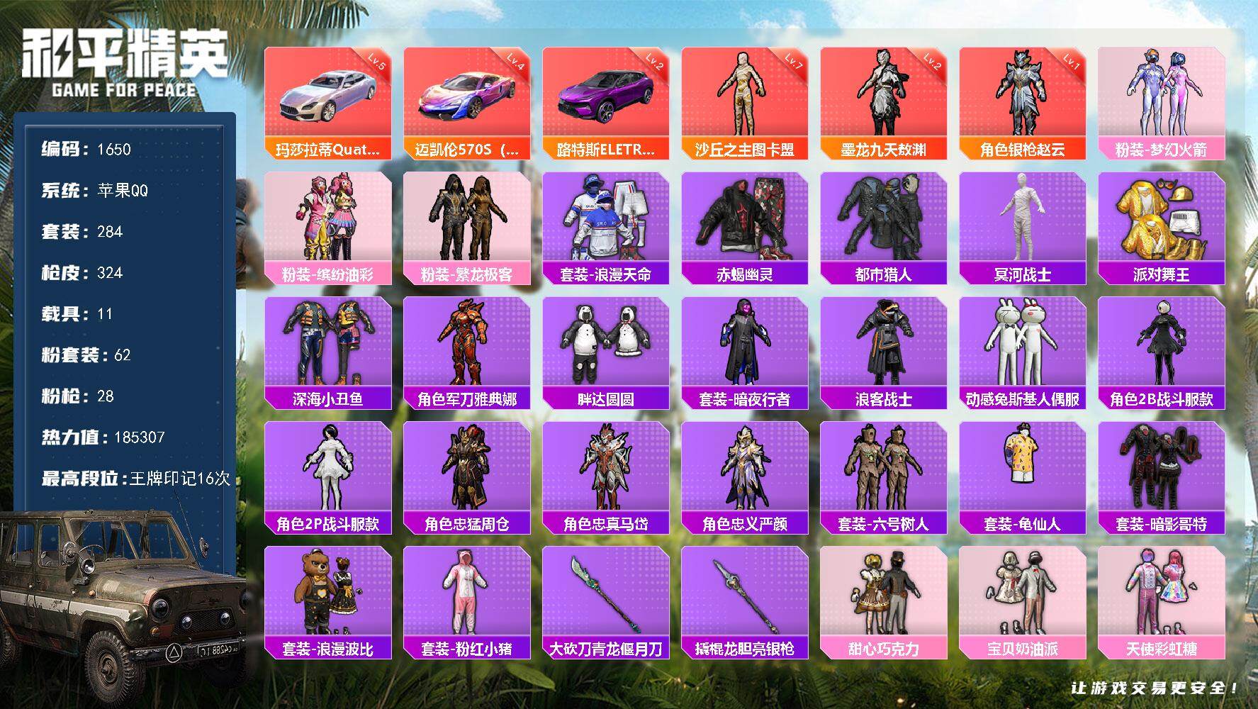 [14991767]苹果 手Q-3神装-62粉装-28特效枪-11载具-14粉色飞行器-185307热力值-16王牌印记-284套装-324枪皮