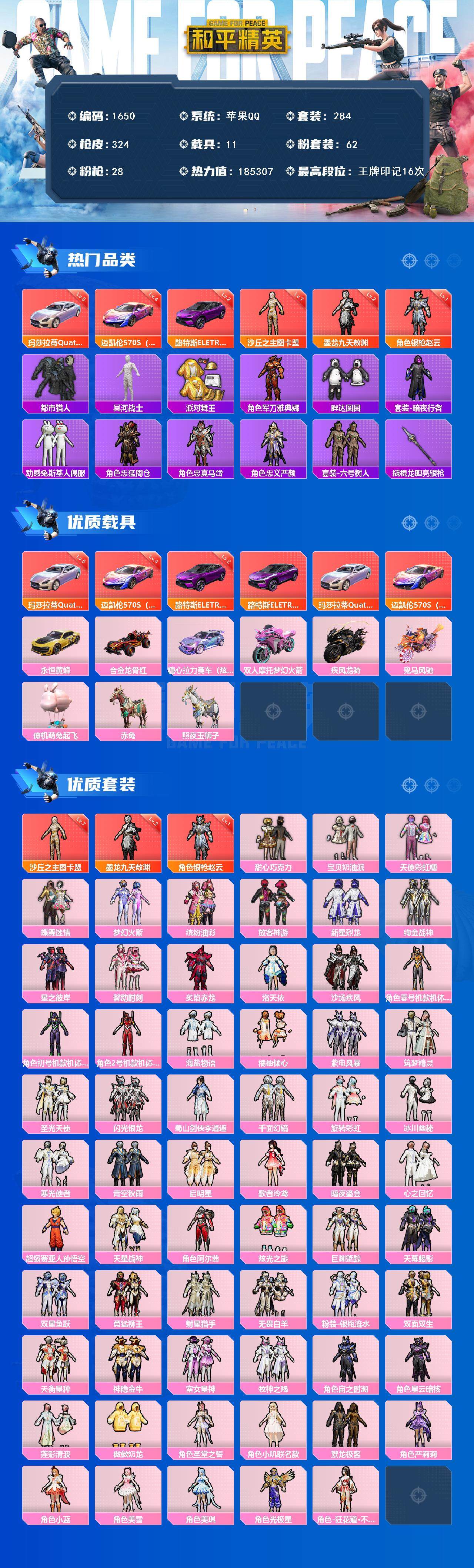 [14991767]苹果 手Q-3神装-62粉装-28特效枪-11载具-14粉色飞行器-185307热力值-16王牌印记-284套装-324枪皮 【红色载具】:路特斯ELETRE(电光紫)(二级),玛莎拉蒂Quattroporte(幻星粉)(五级),迈凯伦570S(镭射紫)(四级) 【红色神装等级】:墨龙九天-敖渊(二级),沙丘之主-图卡盟(七级),角色-银枪赵云(一级) 【红色角色神装】:墨龙九天-敖渊,沙丘之主-图卡盟,角色-银枪赵云 【热门品类】:粉装-梦幻火箭,粉装-缤纷油彩,粉装-繁龙极客,套装-浪漫天命,套装-赤蝎幽灵,套装-都市猎人,套装-冥河战士,套装-派对舞王,套装-深海小丑鱼,角色-军刀雅典娜,套装-胖达圆圆,套装-暗夜行者,套装-浪客战士,套装-动感兔斯基人偶服,角色-2B战斗服款,角色-2P战斗服款,角色-忠猛周仓,角色-忠真马岱,角色-忠义严颜,套装-六号树人,套装-龟仙人,套装-暗影哥特,套装-浪漫波比,套装-粉红小猪,大砍刀-青龙偃月刀,撬棍-龙胆亮银枪 【粉色套装】:粉装-甜心巧克力,粉装-宝贝奶油派,粉装-天使彩虹糖,粉装-蝶舞迷情,粉装-梦幻火箭,粉装-缤纷油彩,粉装-放客神游,粉装-新星烈龙,粉装-绚金战神,粉装-星之彼岸,粉装-馨动时刻,粉装-炙焰赤龙,角色-洛天依,粉装-沙场疾风,角色-零号机款机体服,角色-初号机款机体服,角色-2号机款机体服,粉装-海盐物语,粉装-橘柚倾心,粉装-紫电风暴,粉装-筑梦精灵,粉装-圣光天使,粉装-闪光银龙,蜀山剑侠-李逍遥,粉装-千面幻镜,粉装-旋转彩虹,粉装-冰川幽秘,粉装-寒光使者,粉装-青空秋雨,粉装-启明星,角色-歌者泠鸢,粉装-暗夜鎏金,粉装-心之回忆,超级赛亚人-孙悟空,粉装-天星战神,角色-阿尔茜,粉装-炫光之旅,粉装-巨渊蟹踪,粉装-天幕蝎影,粉装-双星鱼跃,粉装-勇猛狮王,粉装-射星猎手,粉装-无畏白羊,粉装-银瓶流水,粉装-双面双生,粉装-天衡星秤,粉装-神隐金牛,粉装-室女星神,粉装-牧神之羯,角色-宙之时溯,角色-星云暗核,粉装-莲影清波,粉装-傲傲奶龙,角色-圣堂之誓,角色-小叽联名款,粉装-繁龙极客,角色-严莉莉,角色-小蓝,角色-美雪,角色-美琪,角色-光极星,角色-狂花道·不知火舞 【粉色枪皮等级】:AKM-梦之光华(五级),AKM-星际浪客(一级),SCAR-L-青春物语(一