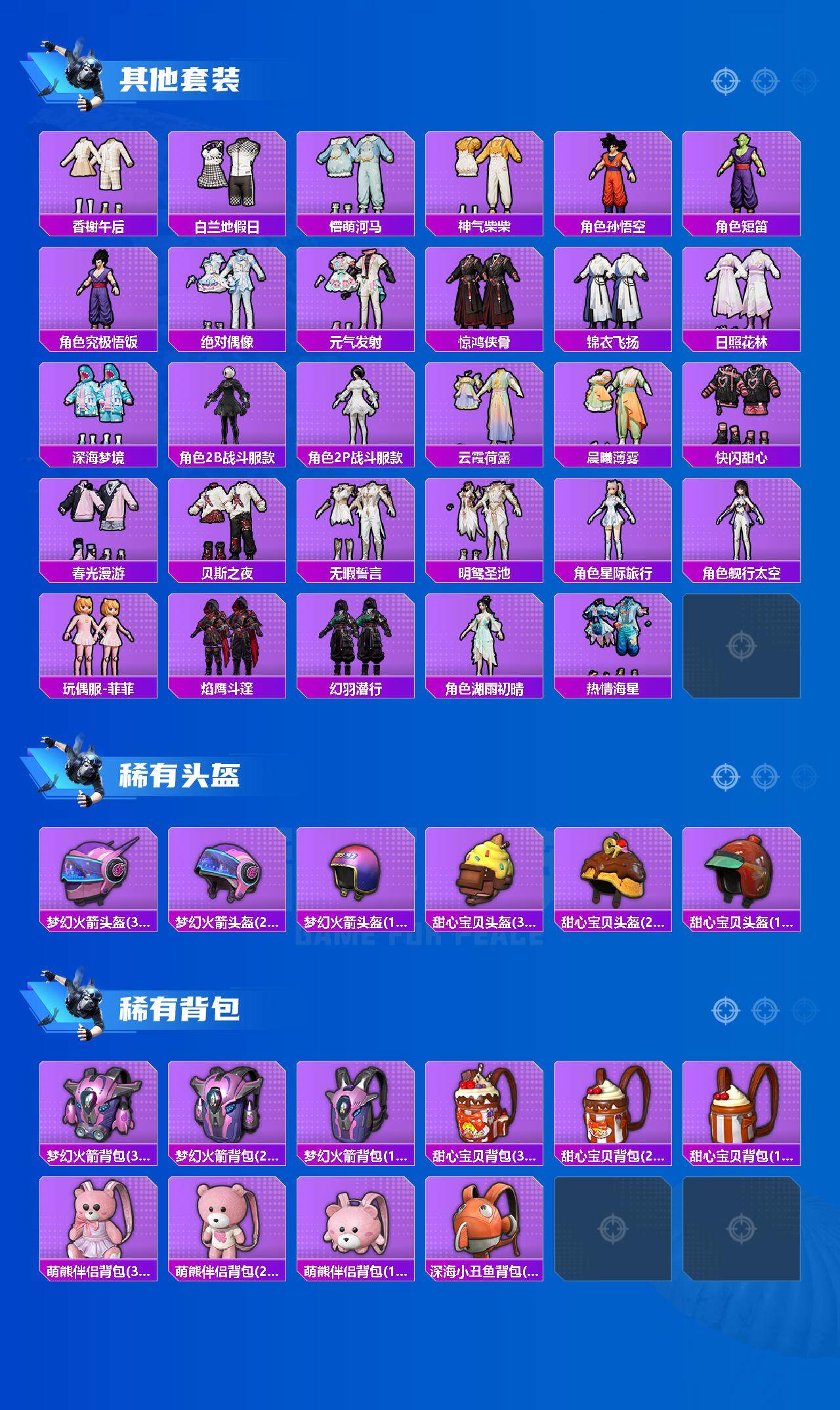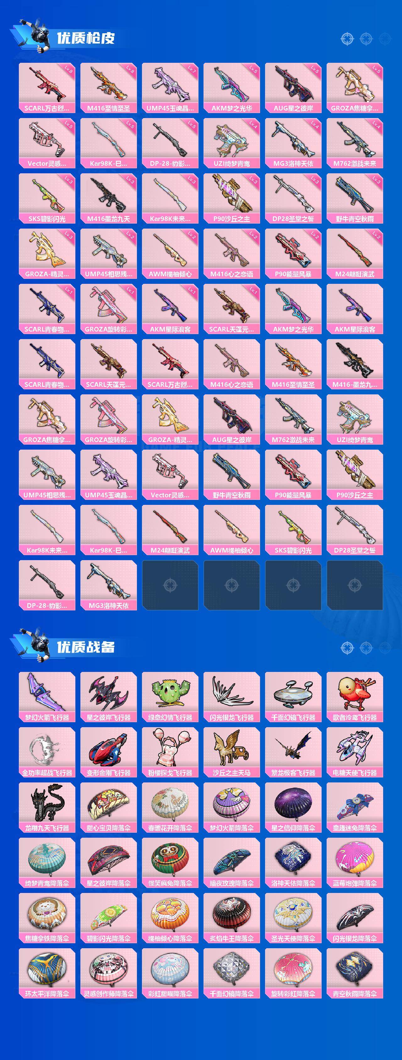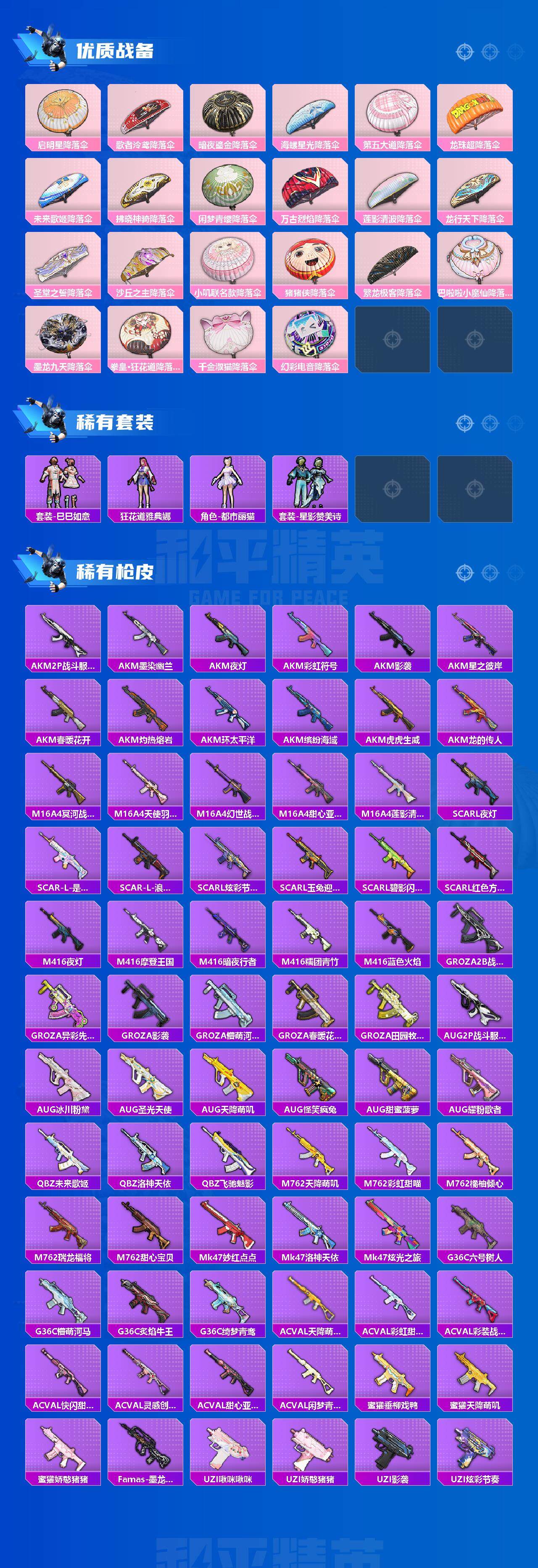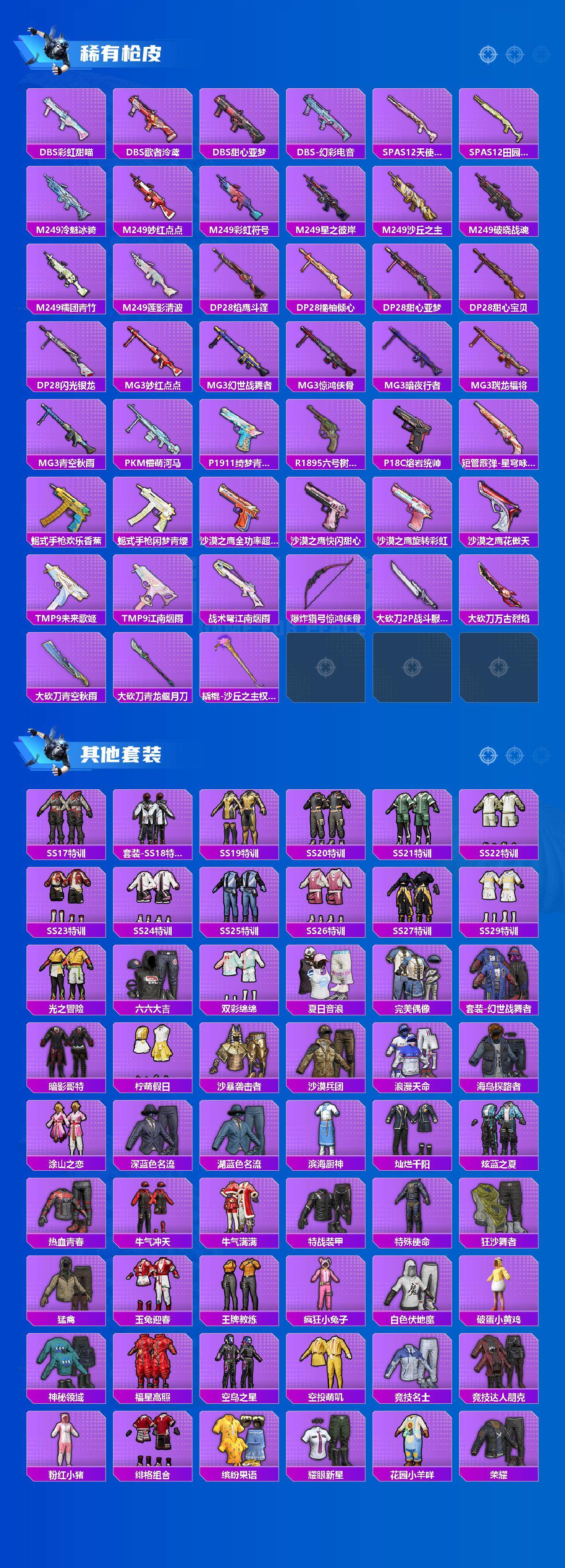 - [11604070]3粉装 7特效枪 6印记 可二次 可修改实名 优质装备:SCAR-L-锦绣绵绵,时空协奏·和音,SCAR-L-时空协奏,AUG-圣斗士星矢,星穹咏叹调,AKS-74U-星穹咏叹调,Mk14-爆裂游戏,Kar98K-巳巳如意 热门装扮:创世·救赎,迅捷狂鲨,呆萌铁蟹,深海小丑鱼 稀有枪皮:DP-28-豹影疾电 五级特效枪:五级Kar98K-巳巳如意,五级SCAR-L-锦绣绵绵 四级特效枪:四级Mk14-爆裂游戏,四级AUG-圣斗士星矢,四级AKS-74U-星穹咏叹调 三级特效枪:三级SCAR-L-时空协奏 一级特效枪:一级DP-28-豹影疾电 紫色装扮:SS22特训,娇憨猪猪,萌趣咩咩,SS21特训,引力深渊,SS31特训套装,虚空漩涡,冰川特警,冷焰舞者,霓虹热舞,旭日情侣,SS30特训套装,云朵鹅,雪绒豹,SS33特训套装,顶瓜瓜,吉莉礼服,酒红色名流,长空猛禽,青年教官,缤纷果语,耀眼新星,蓝彩潮人,飞行日记,魅力单车,鹤鸣,麻辣教官,黄色名流,黄色运动,黑色伏地魔,龙的传人,龟仙人,冰河战士,龙魂突击队,蝶变,沙漠毒蛇,极地朋克,橘黑制服,暗金炫舞,海岛探路者,深蓝色名流,清新柠檬,绮丽涂鸦,白色伏地魔,破晓战魂,破蛋小黄鸡,牛气冲天,热血青春,热血骑手,小熊娃娃,雏菊兔兔,萝兰蝴蝶,SS29特训,星途旅人,SS28特训,异域银装,鱼渊荷华,燕燕于飞,镭金极速,巳巳如意,森林游猎者,青团波波,糖糖葫芦,棉花软糖,竞技名士,摩登魅猫,街头风暴,惊鸿侠骨,SS24特训(SS24特训套装),SS25特训,绝对偶像,锦衣飞扬,焰鹰斗篷,幻羽潜行,幽夜迷踪,SS27特训,童真绒兔,萌趣绒叽,Alan Walker,小丑鱼,SS26特训,智谋强哥,大橘大利,星渊小夜曲,星影赞美诗,小鸟芋圆,春日漫步,粉恋花,蓝冰羽,紫幽梦,SS32特训服(SS32特训套装),荧光绘影,青玉碎影,绯格组合,闪电轻猫,漫步者,冰冻风暴,弄潮海豚,光之冒险,半糖蓝莓 优质战备:霓虹漫游飞行器,精灵梦叶罗丽降落伞,星途旅人降落伞,千金淑猫降落伞,繁龙极客飞行器,幻彩电音降落伞,幻影飞狐降落伞,旋转彩虹降落伞,炫光之旅降落伞