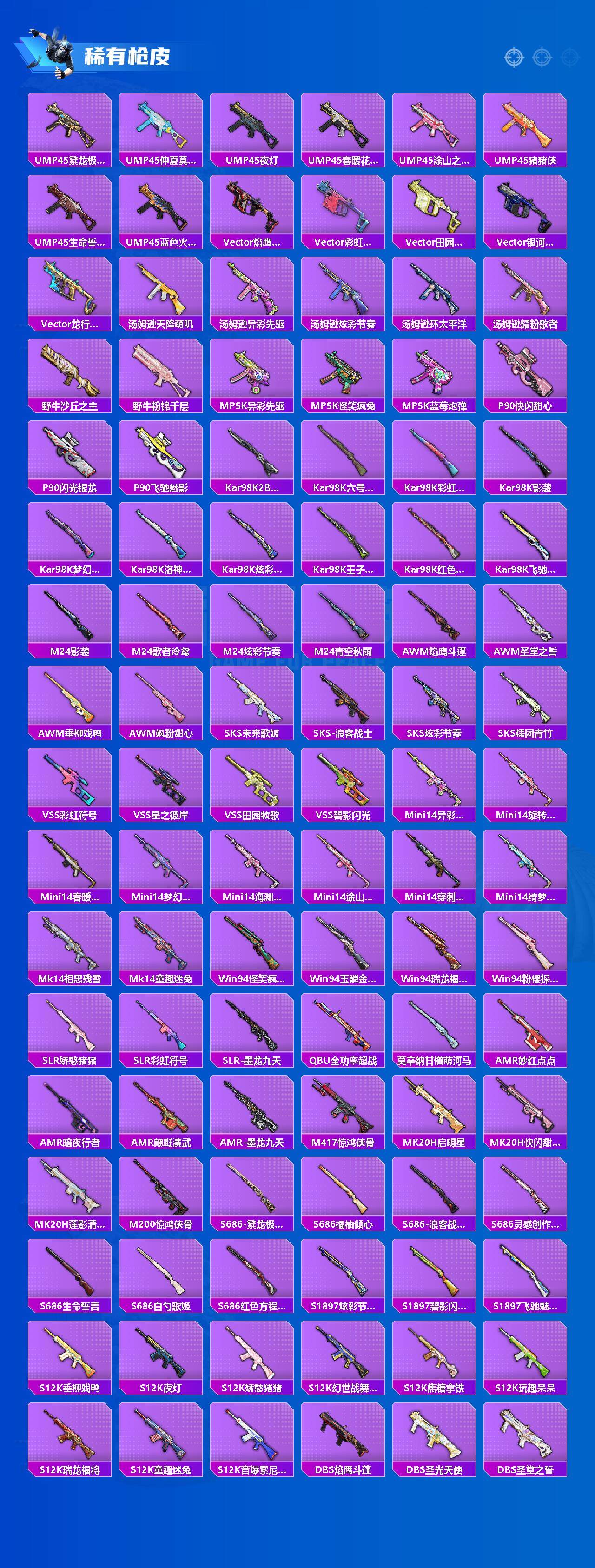 AKM-梦之光华,AKM-星际浪客,SCAR-L-青春物语,SCAR-L-天蓬元帅,M416-心之恋语,M416-至情至圣,M416-墨龙九天,GROZA-焦糖拿铁,GROZA-旋转彩虹,GROZA-精灵之光,AUG-星之彼岸,M762-激战未来,UZI-绮梦青鸾,UMP45-相思残雪,UMP45-玉魂晶魄,Vector-灵感创作师,野牛-青空秋雨,P90-能量风暴,P90-沙丘之主,Kar98K-未来歌姬,Kar98K-巳巳如意,M24-翩跹演武,AWM-橘柚倾心,SKS-碧影闪光,DP-28-圣堂之誓,MG3-洛神天依