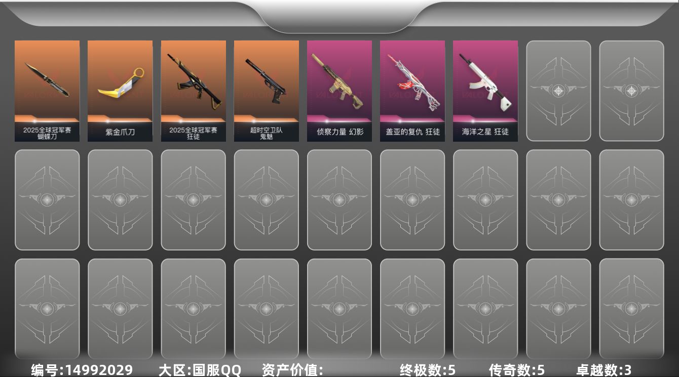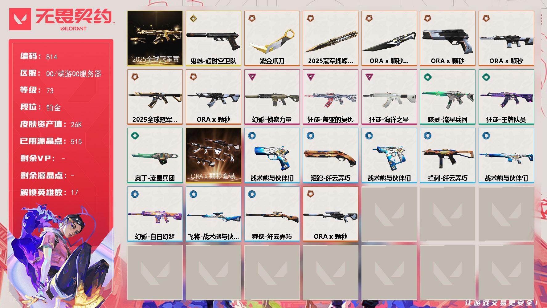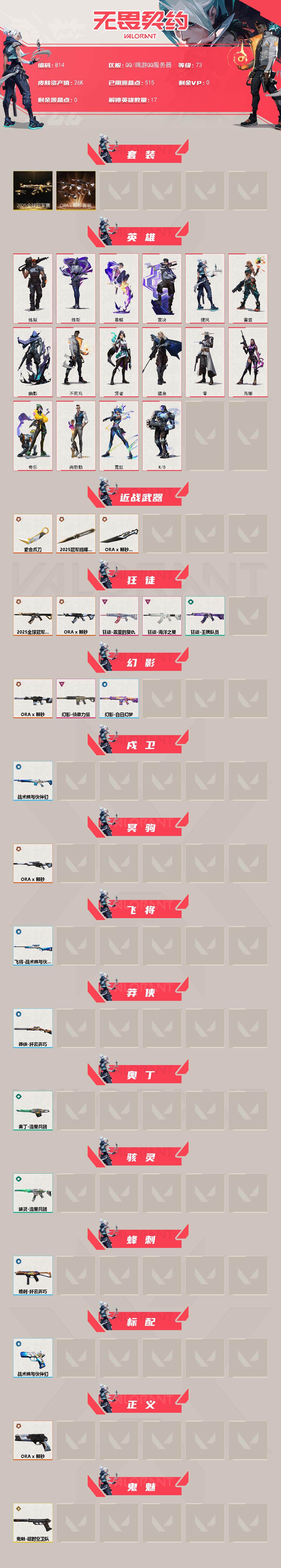 [14992029]【套装】:2025全球冠军赛套装,ORA x 颗秒套装 【英雄】:炼狱,维斯,暮蝶,壹决,捷风,雷兹,幽影,不死鸟,贤者,猎枭,零,芮娜,奇乐,尚勃勒,霓虹,K/O 【近战武器】:近战武器-2025全球冠军赛 蝴蝶刀,近战武器-ORA x 颗秒 军刀,近战武器-紫金爪刀 【狂徒】:狂徒-2025全球冠军赛,狂徒-ORA x 颗秒,狂徒-盖亚的复仇,狂徒-海洋之星,狂徒-王牌队员 【幻影】:幻影-ORA x 颗秒,幻影-侦察力量,幻影-白日幻梦 【戍卫】:戍卫-战术熊与伙伴们 【冥驹】:冥驹-ORA x 颗秒 【飞将】:飞将-战术熊与伙伴们 【莽侠】:莽侠-纤云弄巧 【奥丁】:奥丁-流星兵团 【骇灵】:骇灵-流星兵团 【蜂刺】:蜂刺-纤云弄巧 【标配】:标配-战术熊与伙伴们 【正义】:正义-ORA x 颗秒 【鬼魅】:鬼魅-超时空卫队 【狂怒】:狂怒-战术熊与伙伴们 【短炮】:短炮-纤云弄巧 【卡面】:声感陷阱设计图 卡面,梦幻奶茶 卡面,暮蝶工牌 卡面,战术熊与伙伴们 卡面,源能反应 卡面,流星兵团 卡面,纤云弄巧 卡面,暂别喧嚣 卡面,打造专属狂徒 卡面,零点嗅探设计图 卡面,清除名单 卡面,无畏契约GO!第一卷:零 卡面,无畏契约GO!第一卷:贤者 卡面,代号红色 卡面,新兵报到 卡面,V契约 卡面,无畏契约 卡面 【喷漆】:拼一枪 喷漆,头号粉丝 喷漆,吸一口快乐 喷漆,永远的答案 喷漆,再来一次? 喷漆,别挡我的路! 喷漆,我的刀呢? 喷漆,当然可以 喷漆,流星兵团 喷漆,战术熊与伙伴们 喷漆,禁止喷漆 喷漆,纤云弄巧 喷漆,买装还是存钱 喷漆,胜利属于无畏契约 喷漆,GLHF 喷漆,无畏契约 喷漆 【挂饰】:薰衣草之心 挂饰,第九季//第一幕 纪念币 挂饰,迷你机甲 挂饰,荧光棒 挂饰,章鱼烧先生 挂饰,流星兵团 挂饰,云开见日 挂饰,第八季//第三幕 纪念币 挂饰,第八季//第二幕 纪念币 挂饰 ,天外飞客 挂饰,《双城之战》魄罗 挂饰,无畏契约 纪念币 挂饰