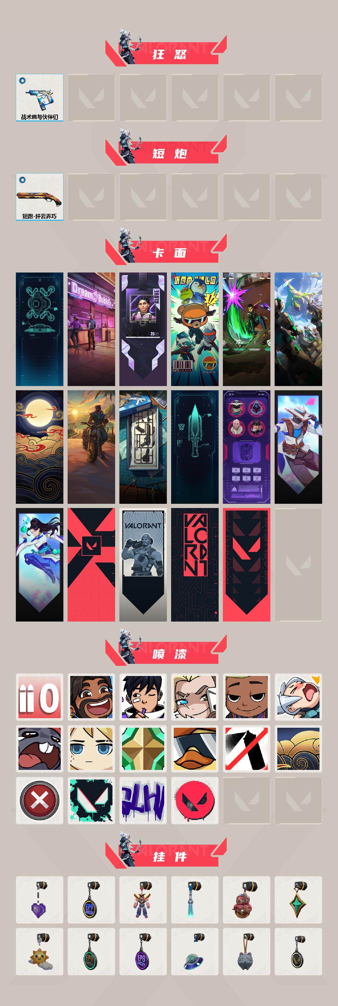 【喷漆】:拼一枪 喷漆,头号粉丝 喷漆,吸一口快乐 喷漆,永远的答案 喷漆,再来一次? 喷漆,别挡我的路! 喷漆,我的刀呢? 喷漆,当然可以 喷漆,流星兵团 喷漆,战术熊与伙伴们 喷漆,禁止喷漆 喷漆,纤云弄巧 喷漆,买装还是存钱 喷漆,胜利属于无畏契约 喷漆,GLHF 喷漆,无畏契约 喷漆