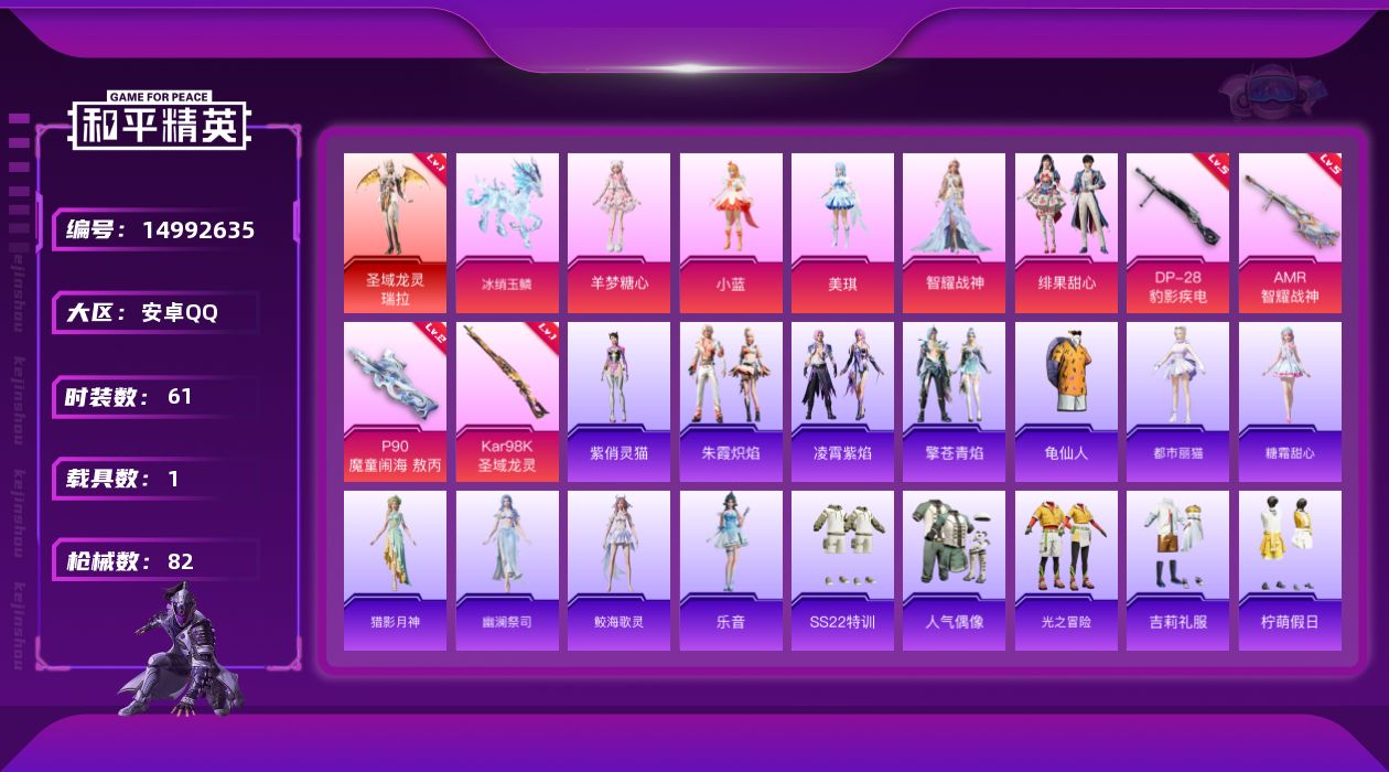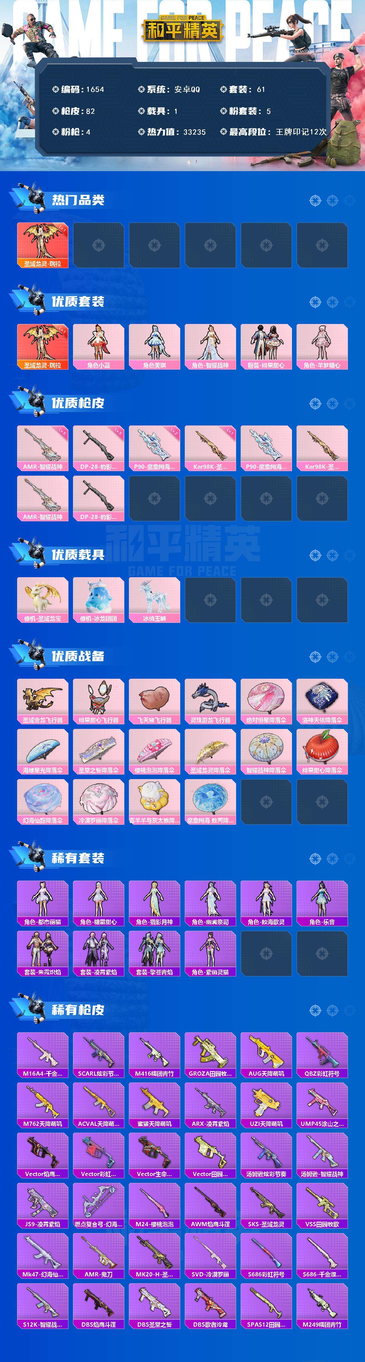 [14992635]安卓 手Q-1神装-5粉装-4特效枪-1载具-6粉色飞行器-33235热力值-12王牌印记-61套装-82枪皮 【红色神装等级】:圣域龙灵-瑞拉(一级) 【红色角色神装】:圣域龙灵-瑞拉 【热门品类】:套装-龟仙人 【粉色套装】:角色-小蓝,角色-美琪,角色-智耀战神,粉装-绯果甜心,角色-羊梦糖心 【粉色枪皮等级】:P90-魔童闹海 敖丙(二级),Kar98K-圣域龙灵(一级),AMR-智耀战神(五级),DP-28-豹影疾电(五级) 【粉色载具】:僚机-圣域龙宝,僚机-冰龙团团,冰绡玉鳞 【粉色枪皮】:P90-魔童闹海 敖丙,Kar98K-圣域龙灵,AMR-智耀战神,DP-28-豹影疾电 【粉色飞行器】:圣域金龙飞行器,绯果甜心飞行器,飞天猪飞行器,灵珠游龙飞行器 【粉色降落伞】:绝对恒星降落伞,洛神天依降落伞,海螺星光降落伞,圣堂之誓降落伞,樱桃泡泡降落伞,圣域龙灵降落伞,智耀战神降落伞,绯果甜心降落伞,幻海仙踪降落伞,冷漠罗丽降落伞,喜羊羊与灰太狼降落伞,魔童闹海 敖丙降落伞 【稀有套装】:套装-龟仙人,角色-都市丽猫,角色-糖霜甜心,角色-猎影月神,角色-幽澜祭司,角色-鲛海歌灵,角色-乐音,套装-朱霞炽焰,套装-凌霄紫焰,套装-擎苍青焰,角色-紫俏灵猫,套装-炫彩糖果 【稀有枪皮】:M16A4-千金淑猫,SCAR-L-炫彩节奏,M416-糯团青竹,GROZA-田园牧歌,AUG-天降萌叽,QBZ-彩虹符号,M762-天降萌叽,AC-VAL-天降萌叽,蜜獾-天降萌叽,ARX-凌霄紫焰,UZI-天降萌叽,UMP45-涂山之恋,Vector-焰鹰斗篷,Vector-彩虹符号,Vector-生命誓言,Vector-田园牧歌,汤姆逊-炫彩节奏,汤姆逊-智耀战神,JS9-凌霄紫焰,燃点复合弓-幻海仙踪,M24-樱桃泡泡,AWM-焰鹰斗篷,SKS-圣域龙灵,VSS-田园牧歌,Mk47-幻海仙踪,AMR-鬼刀,MK20-H-圣域龙灵,SVD-冷漠罗丽,S686-彩虹符号,S686-千金淑猫,S12K-智耀战神,DBS-焰鹰斗篷,DBS-圣堂之誓,DBS-歌者泠鸢,SPAS-12-田园牧歌,M249-糯团青竹,DP-28-焰鹰斗篷,MG3-幻世战舞者,MG-36-绯果甜心,MG-36-凌霄紫焰,P92-凌霄紫焰,短管霰弹-圣域龙灵,TMP-9-江南烟雨,爆炸猎弓-喜羊羊与灰
