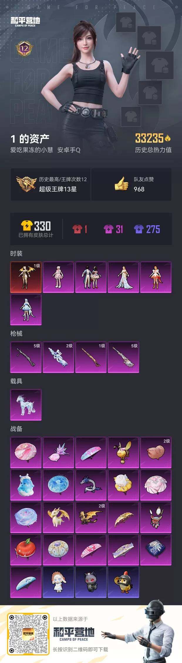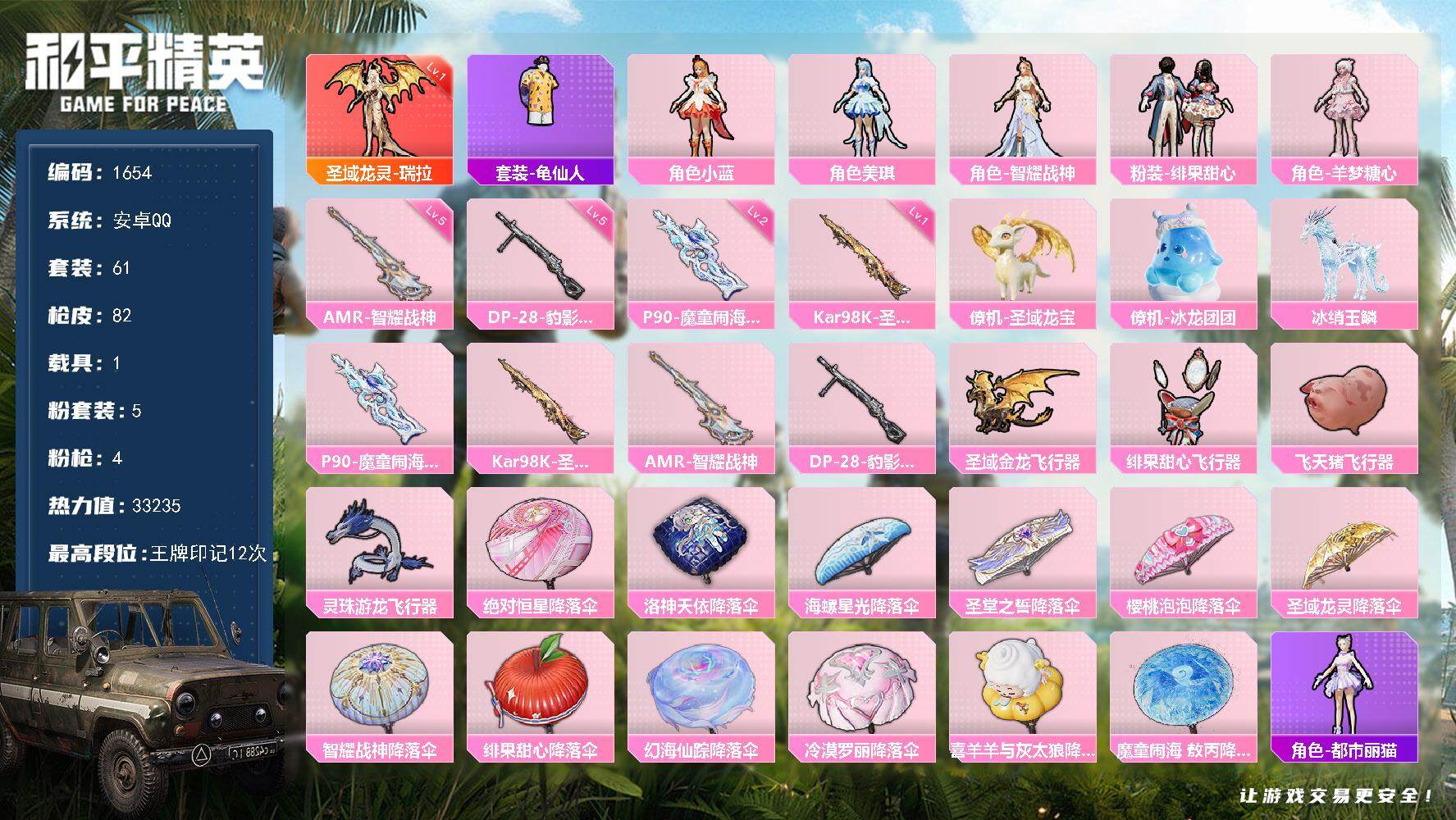 [14992635]安卓 手Q-1神装-5粉装-4特效枪-1载具-6粉色飞行器-33235热力值-12王牌印记-61套装-82枪皮