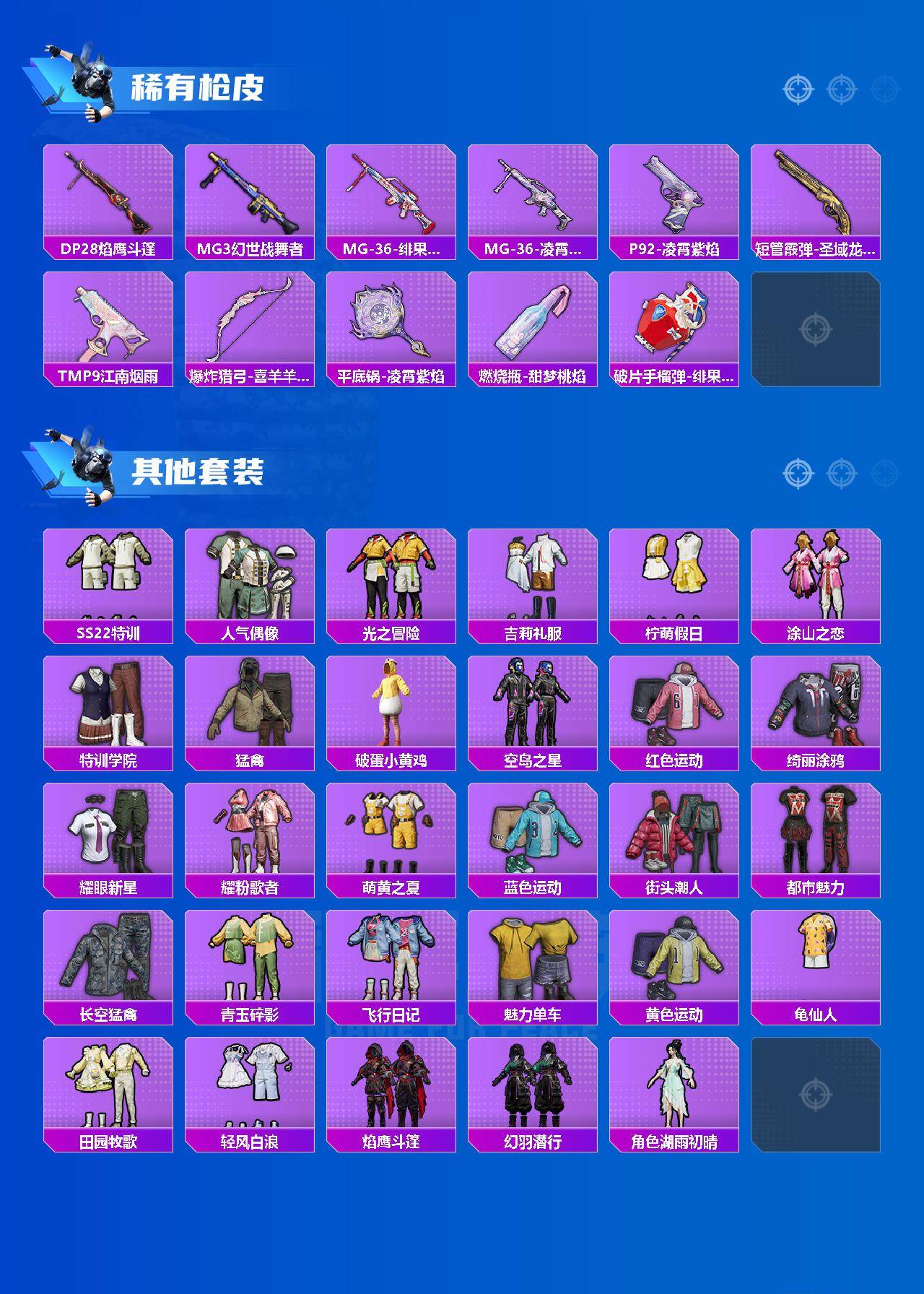 【稀有枪皮】:M16A4-千金淑猫,SCAR-L-炫彩节奏,M416-糯团青竹,GROZA-田园牧歌,AUG-天降萌叽,QBZ-彩虹符号,M762-天降萌叽,AC-VAL-天降萌叽,蜜獾-天降萌叽,ARX-凌霄紫焰,UZI-天降萌叽,UMP45-涂山之恋,Vector-焰鹰斗篷,Vector-彩虹符号,Vector-生命誓言,Vector-田园牧歌,汤姆逊-炫彩节奏,汤姆逊-智耀战神,JS9-凌霄紫焰,燃点复合弓-幻海仙踪,M24-樱桃泡泡,AWM-焰鹰斗篷,SKS-圣域龙灵,VSS-田园牧歌,Mk47-幻海仙踪,AMR-鬼刀,MK20-H-圣域龙灵,SVD-冷漠罗丽,S686-彩虹符号,S686-千金淑猫,S12K-智耀战神,DBS-焰鹰斗篷,DBS-圣堂之誓,DBS-歌者泠鸢,SPAS-12-田园牧歌,M249-糯团青竹,DP-28-焰鹰斗篷,MG3-幻世战舞者,MG-36-绯果甜心,MG-36-凌霄紫焰,P92-凌霄紫焰,短管霰弹-圣域龙灵,TMP-9-江南烟雨,爆炸猎弓-喜羊羊与灰