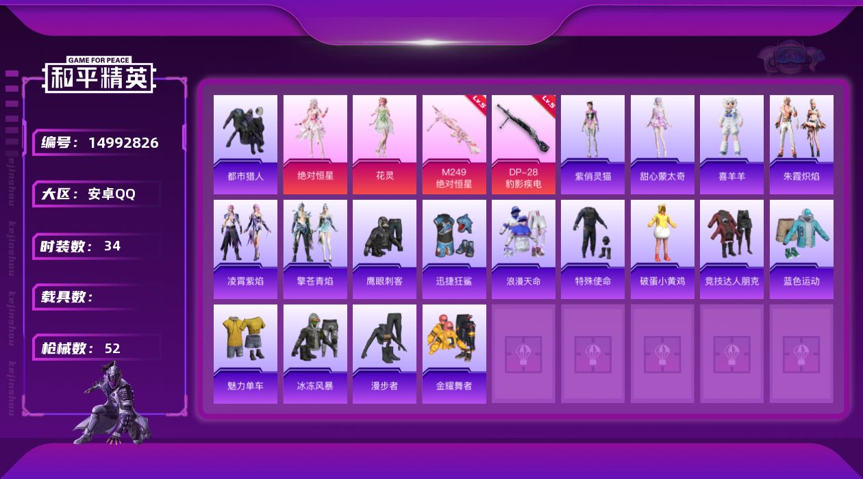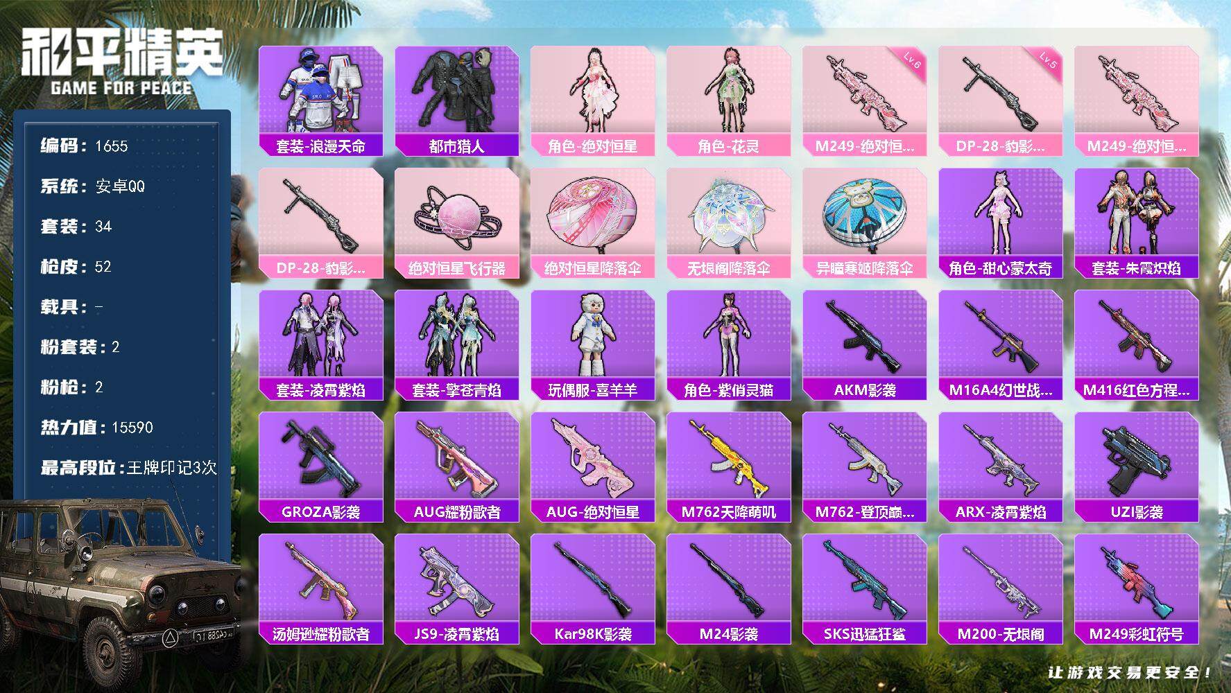 [14992826]安卓 手Q-2粉装-2特效枪-0载具-3粉色飞行器-15590热力值-3王牌印记-34套装-52枪皮