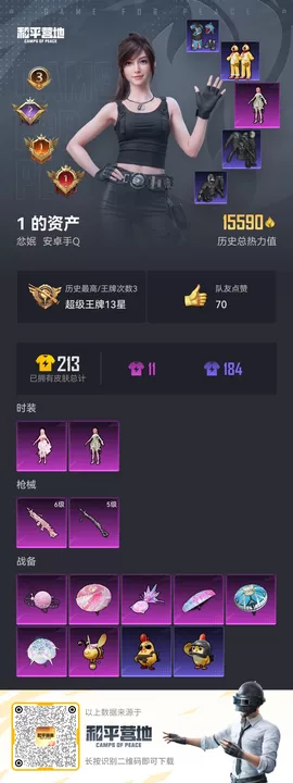 [14992826]安卓 手Q-2粉装-2特效枪-0载具-3粉色飞行器-15590热力值-3王牌印记-34套装-52枪皮 【热门品类】:套装-浪漫天命,套装-都市猎人 【粉色套装】:角色-绝对恒星,角色-花灵 【粉色枪皮等级】:M249-绝对恒星(六级),DP-28-豹影疾电(五级) 【粉色枪皮】:M249-绝对恒星,DP-28-豹影疾电 【粉色飞行器】:绝对恒星飞行器 【粉色降落伞】:绝对恒星降落伞,无垠阁降落伞,异瞳寒姬降落伞 【稀有套装】:角色-甜心蒙太奇,套装-雪国风尚,套装-朱霞炽焰,套装-凌霄紫焰,套装-擎苍青焰,玩偶服-喜羊羊,角色-紫俏灵猫,套装-炫彩糖果 【稀有枪皮】:AUG-冰晶雪宝,AKM-影袭,M16A4-幻世战舞者,M416-红色方程式,GROZA-影袭,AUG-耀粉歌者,AUG-绝对恒星,M762-天降萌叽,M762-登顶巅峰,ARX-凌霄紫焰,UZI-影袭,汤姆逊-耀粉歌者,JS9-凌霄紫焰,Kar98K-影袭,M24-影袭,SKS-迅猛狂鲨,M200-无垠阁,M249-彩虹符号,MG3-幻世战舞者,MG-36-凌霄紫焰,P92-凌霄紫焰,突击盾牌-绝对恒星,平底锅-凌霄紫焰 【其他套装】:套装-浪漫天命,套装-特殊使命,套装-破蛋小黄鸡,套装-竞技达人朋克,套装-蓝色运动,套装-魅力单车,套装-鹰眼刺客,套装-冰冻风暴,套装-漫步者,套装-金耀舞者,套装-迅捷狂鲨 【营地ID】:1002338197