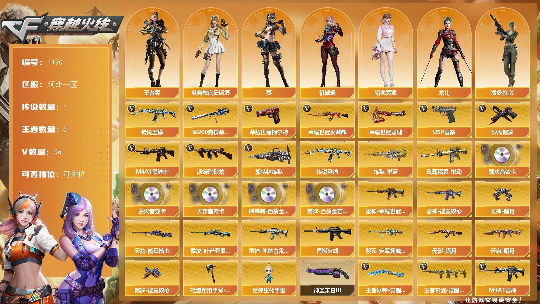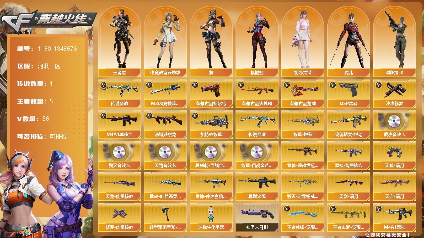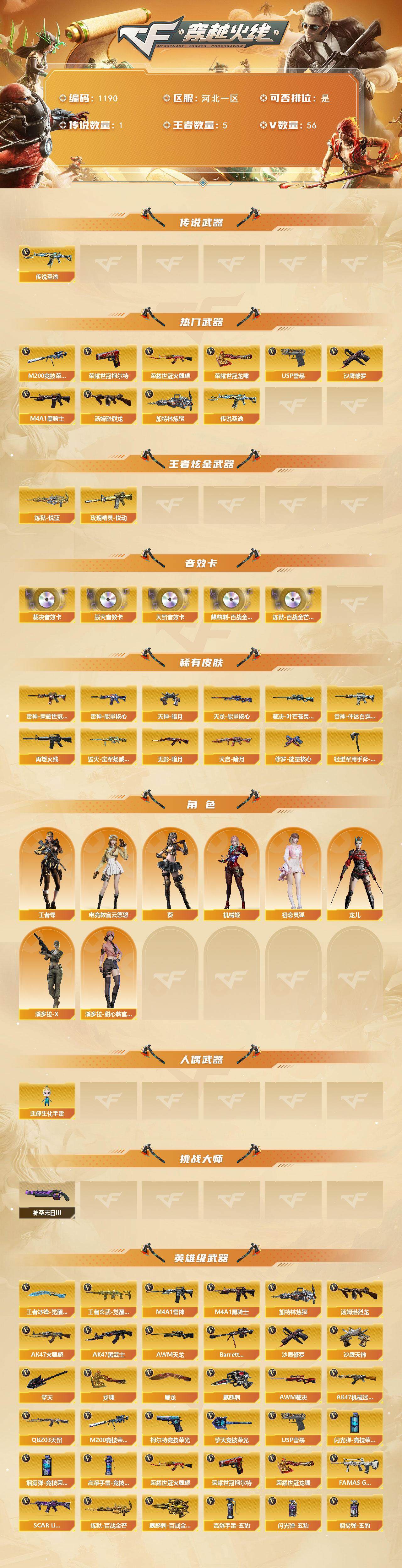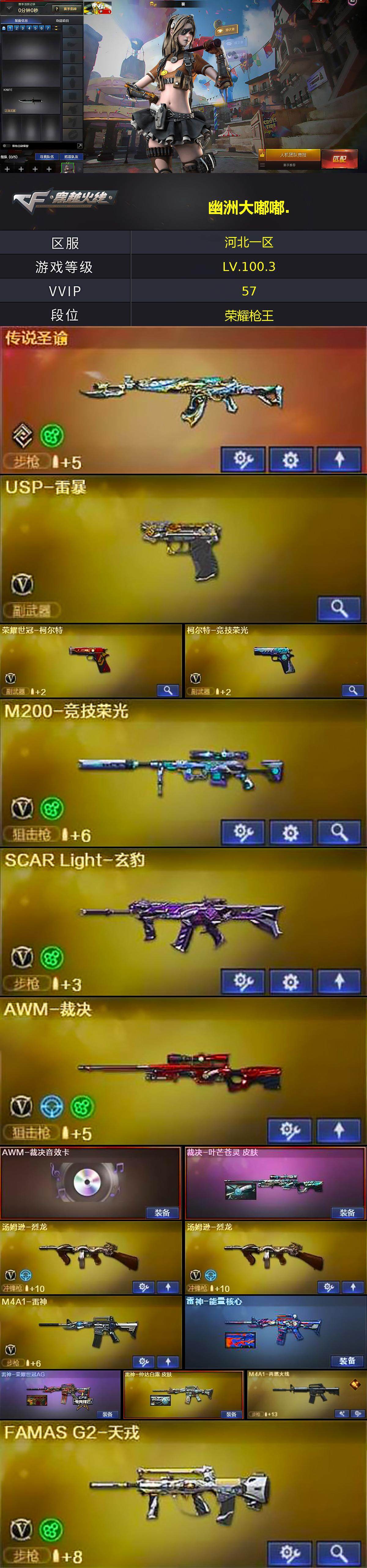 [14992928]河北一区-56V-5王者-0炫金 【传说武器】:传说圣谕 【热门武器】:传说圣谕,M200-竞技荣光,荣耀世冠-火麒麟,荣耀世冠-柯尔特,M4A1-黑骑士,汤姆逊-烈龙*2,加特林-炼狱,USP-雷暴,沙鹰-修罗*3,荣耀世冠-龙啸 【王者炫金武器】:玫瑰精灵-悦动,炼狱-悦蓝*2 【音效卡】:Barrett-毁灭音效卡,AWM-裁决音效卡,QBZ03-天罚音效卡,麒麟刺-百战金芒-盛典舞曲音