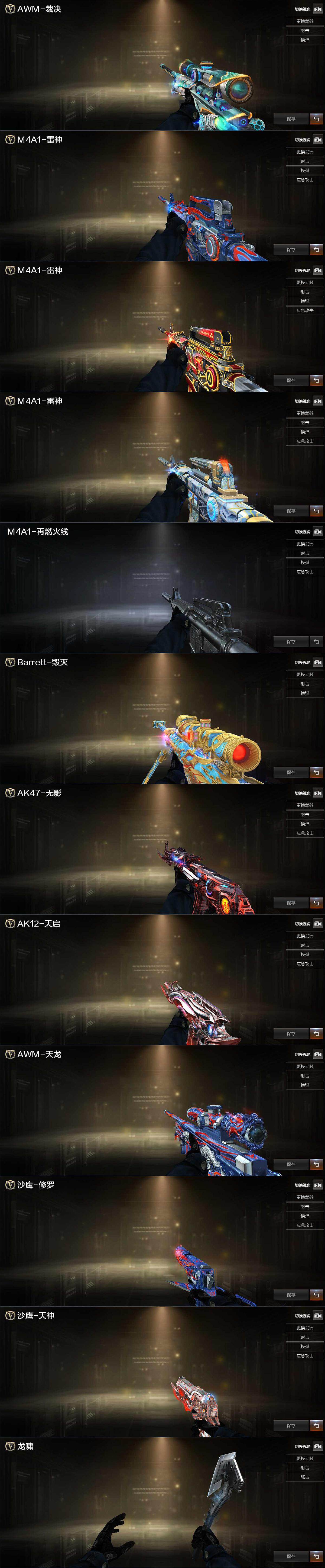 【热门武器】:传说圣谕,M200-竞技荣光,荣耀世冠-火麒麟,荣耀世冠-柯尔特,M4A1-黑骑士,汤姆逊-烈龙*2,加特林-炼狱,USP-雷暴,沙鹰-修罗*3,荣耀世冠-龙啸