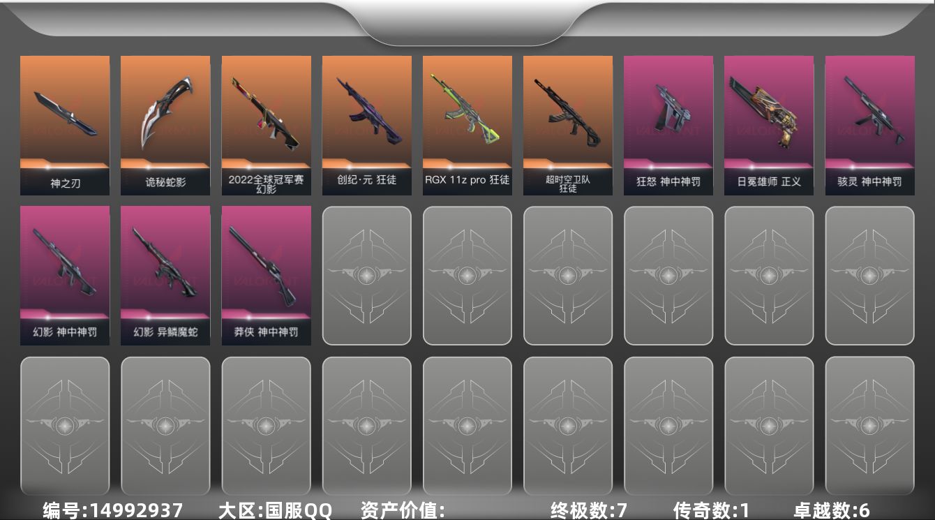 - [12090517]8橙皮 1金皮 3紫皮 26皮肤 9英雄 54卡面 430已用源晶 黄金 优质装备:幻影-天界神兵2.0,鬼魅-源能者娱乐系统,苍龙之刃,飞将-奇幻朋克 亮点皮肤:幻影-2022全球冠军赛,2022全球冠军赛 蝴蝶刀 套装:2022全球冠军赛 佩枪皮肤:标配-VCT25xLEV,正义-西部未来 步枪皮肤:RGX 11z pro 狂徒,狂徒-离子武器2.0 狙击枪皮肤:莽侠-RGX 11z Pro 3.0