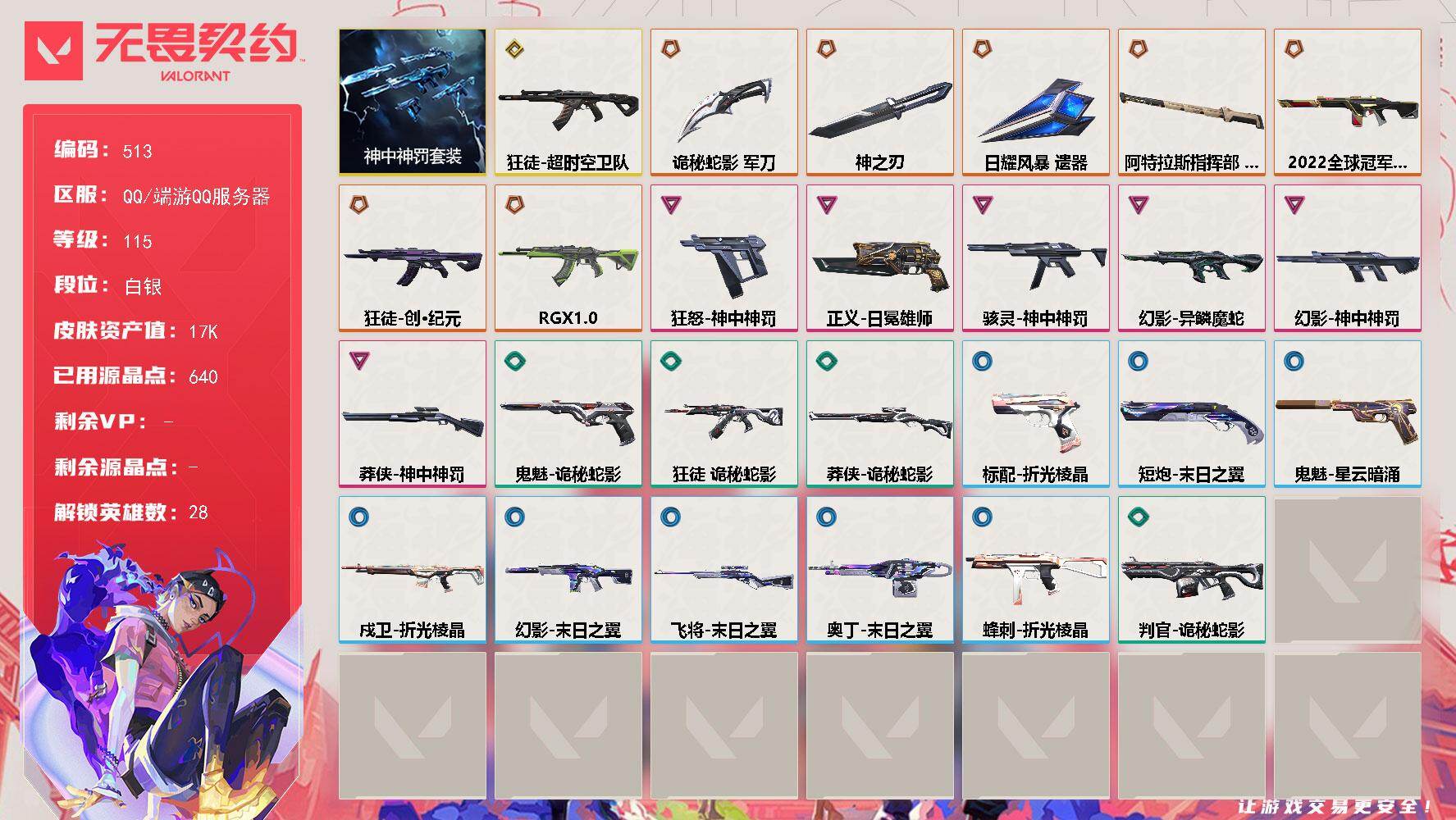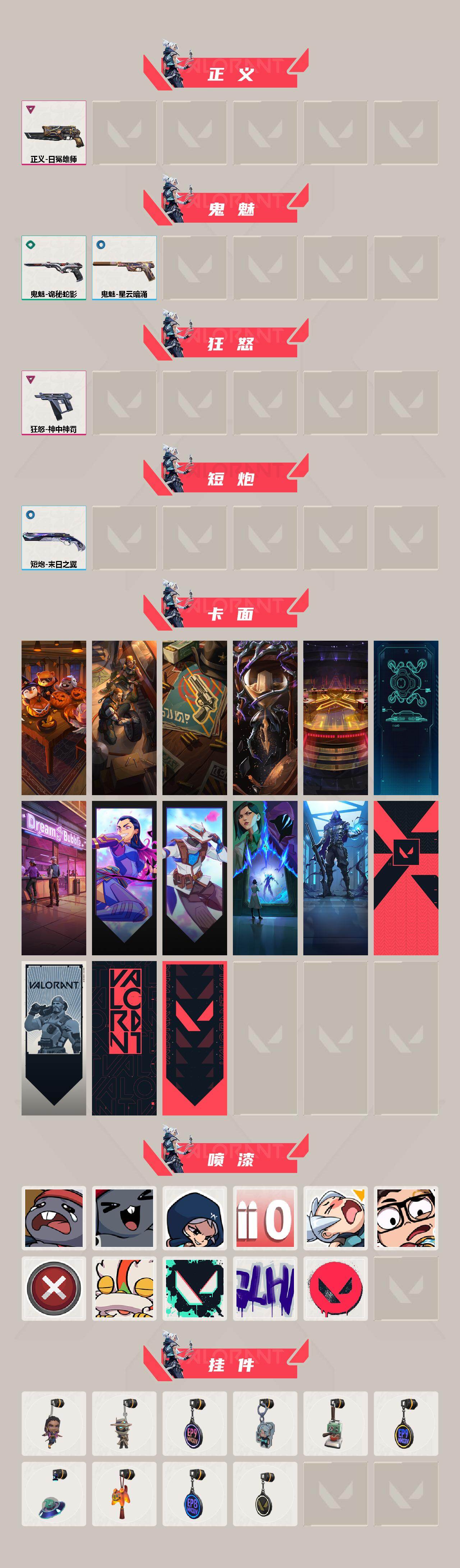 [14992937]【套装】:神中神罚套装 【英雄】:幻棱,炼狱,维斯,暮蝶,钛狐,壹决,铁臂,捷风,雷兹,幽影,不死鸟,贤者,猎枭,蝰蛇,零,芮娜,奇乐,尚勃勒,霓虹,斯凯,夜露,星礈,K/O,海神,盖可,黑梦,钢锁 【近战武器】:近战武器-神之刃,近战武器-诡秘蛇影 军刀,近战武器-日耀风暴 遗器,近战武器-阿特拉斯指挥部 甩棍 【狂徒】:狂徒-超时空卫队,狂徒-创·纪元,狂徒-RGX 11z Pro,狂徒-诡秘蛇影 【幻影】:幻影-2022全球冠军赛,幻影-异鳞魔蛇,幻影-神中神罚,幻影-末日之翼 【戍卫】:戍卫-折光棱晶 【飞将】:飞将-末日之翼 【莽侠】:莽侠-神中神罚,莽侠-诡秘蛇影 【奥丁】:奥丁-末日之翼 【判官】:判官-诡秘蛇影 【骇灵】:骇灵-神中神罚 【蜂刺】:蜂刺-折光棱晶 【标配】:标配-折光棱晶 【正义】:正义-日冕雄师 【鬼魅】:鬼魅-诡秘蛇影,鬼魅-星云暗涌 【狂怒】:狂怒-神中神罚 【短炮】:短炮-末日之翼 【卡面】:南瓜盛典 卡面,修车达人 卡面,正义的化身 卡面,时间到 卡面,最高舞台 卡面,声感陷阱设计图 卡面,梦幻奶茶 卡面,无畏契约GO!第一卷:芮娜 卡面,无畏契约GO!第一卷:零 卡面,蝰蛇vs幽影 卡面,暗枪 卡面,代号红色 卡面,新兵报到 卡面,V契约 卡面,无畏契约 卡面 【喷漆】:熊抱 喷漆,超级粉丝 喷漆,捷风差距 喷漆,拼一枪 喷漆,别挡我的路! 喷漆,新潮流 喷漆,买装还是存钱 喷漆,醒狮贺春 喷漆,胜利属于无畏契约 喷漆,GLHF 喷漆,无畏契约 喷漆 【挂饰】:无畏契约GO!第一卷 芮娜 挂饰,无畏契约GO!第一卷 零 挂饰,第九季//第二幕 纪念币 挂饰,袖珍捷风 挂饰,迷你浓缩 挂饰,第九季//第一幕 纪念币 挂饰,天外飞客 挂饰,好运福爪 挂饰,第八季//第一幕 纪念币 挂饰,无畏契约 纪念币 挂饰