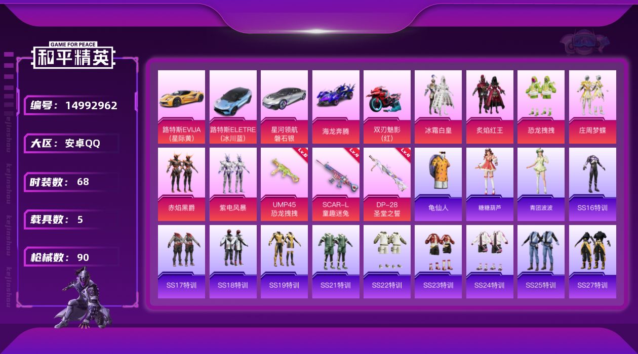 [14992962]安卓 手Q-6粉装-3特效枪-5载具-2粉色飞行器-37722热力值-2王牌印记-68套装-90枪皮 【热门品类】:套装-龟仙人 【粉色载具】:路特斯EVIJA(星际黄),路特斯ELETRE(冰川蓝),星河领航(磐石银),海龙奔腾,双人摩托-双刃魅影(红) 【粉色套装】:粉装-冰霜白皇,粉装-炙焰红王,粉装-恐龙拽拽,粉装-庄周梦蝶,粉装-赤焰黑爵,粉装-紫电风暴 【粉色枪皮等级】:SCAR-L-童趣迷兔(四级),UMP45-恐龙拽拽(六级),DP-28-圣堂之誓(四级) 【粉色枪皮】:SCAR-L-童趣迷兔,UMP45-恐龙拽拽,DP-28-圣堂之誓 【粉色飞行器】:暗翼战神飞行器,庄周梦蝶飞行器 【粉色降落伞】:凝视深渊降落伞,至尊龙雀降落伞,梦幻火箭降落伞,童趣迷兔降落伞,暗翼战神降落伞,绮梦青鸾降落伞,林间仙鹿降落伞,恐龙拽拽降落伞,庄周梦蝶降落伞,冷魅冰骑降落伞,环太平洋降落伞,未来歌姬降落伞 【稀有套装】:套装-龟仙人,套装-糖糖葫芦,套装-青团波波 【稀有枪皮】:AKM-彩虹符号,AKM-恐龙拽拽,AKM-虎虎生威,AKM-霓虹街区,SCAR-L-红色方程式,M416-糯团青竹,M416-红色方程式,GROZA-异彩先驱,GROZA-彩虹符号,GROZA-恐龙拽拽,GROZA-林间仙鹿,AUG-天降萌叽,AUG-怪笑疯兔,AUG-耀粉歌者,QBZ-暗翼战神,QBZ-飞驰魅影,M762-天降萌叽,M762-瑞龙福将,Mk47-林间仙鹿,G36C-冷魅冰骑,AC-VAL-天降萌叽,蜜獾-天降萌叽,蜜獾-娇憨猪猪,UZI-啾咪啾咪,UZI-娇憨猪猪,UZI-炫彩节奏,UMP45-蓝色火焰,Vector-夜灯,Vector-暗夜玫瑰,Vector-风花雪月,汤姆逊-庄周梦蝶,汤姆逊-异彩先驱,MP5K-异彩先驱,P90-飞驰魅影,Kar98K-炫彩节奏,Kar98K-红色方程式,Kar98K-飞驰魅影,AWM-庄周梦蝶,AWM-恐龙拽拽,SKS-炫彩节奏,VSS-彩虹符号,Mini14-异彩先驱,Mk14-童趣迷兔,Win94-瑞龙福将,SLR-娇憨猪猪,S686-暗翼战神,S686-生命誓言,S1897-碧影闪光,S1897-飞驰魅影,S12K-瑞龙福将,S12K-童趣迷兔,S12K-娇憨猪猪,DBS-彩虹符号,DP-28-彩虹符号,MG3-幻世战舞者,M