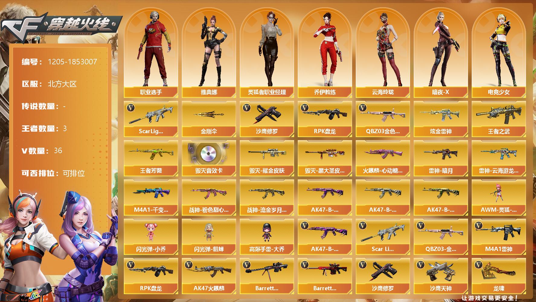 [14993111]北方大区-36V-3王者-1炫金 【热门武器】:QBZ03-金色蔷薇,Scar Light-白虎,RPK-盘龙,沙鹰-修罗,金刚伞 【王者炫金武器】:王者之武,王者芳薇,炫金雷神 【音效卡】:Barrett-毁灭音效卡 【皮肤】:雷神-暗月,雷神-云海游龙皮肤,火麒麟-心动糖果,毁灭耀金皮肤,毁灭-黑大圣皮肤,M4A1-千变-孔明皮肤,战神-粉色甜心皮肤,战神-流金岁月皮肤,AK47-B-常胜