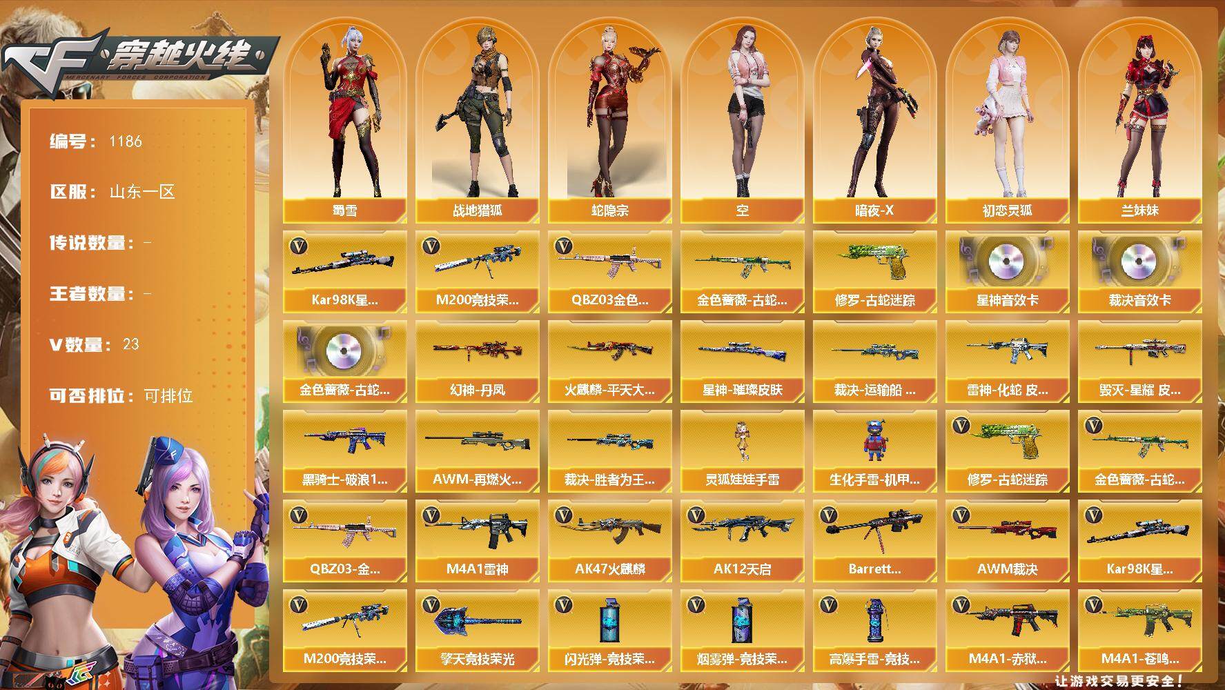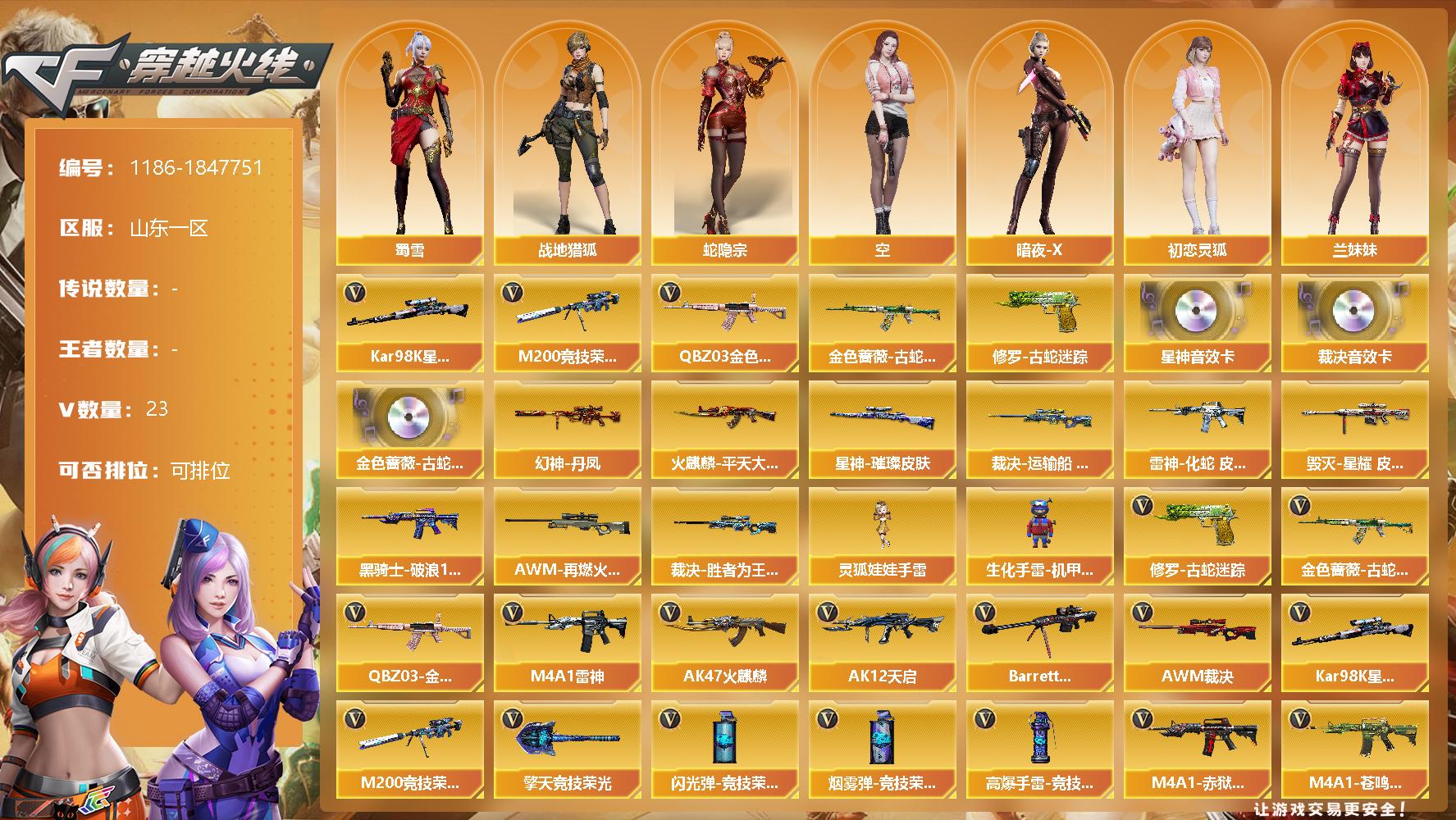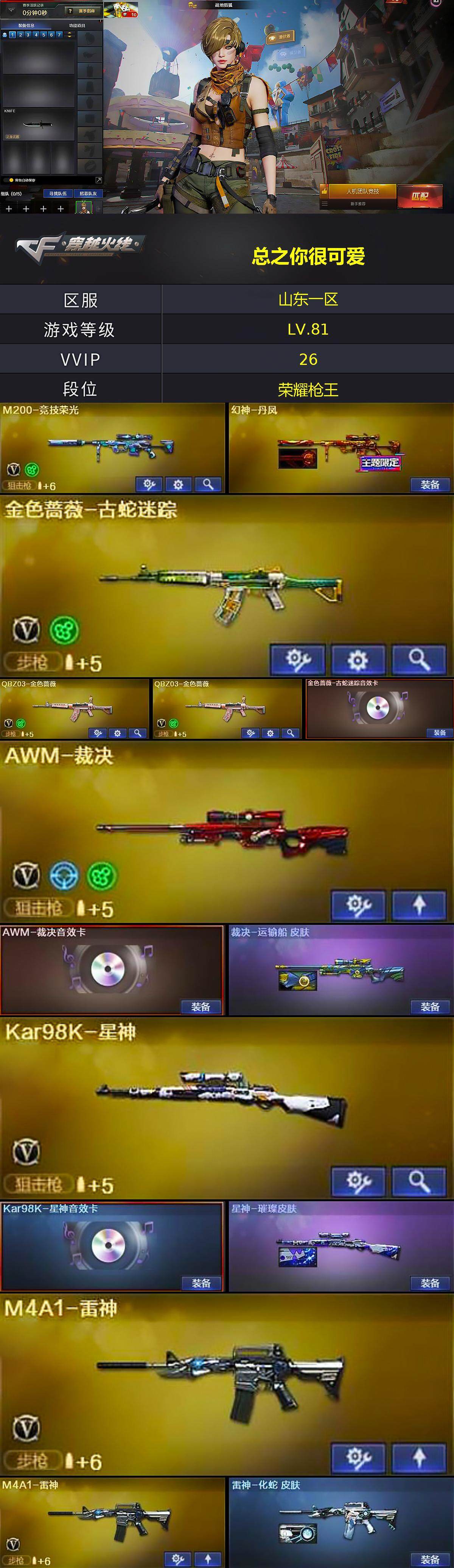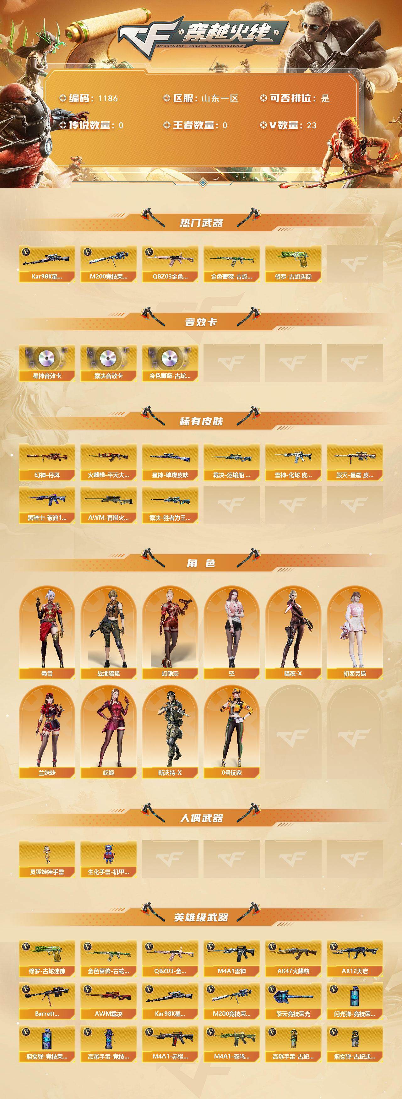[14994514]山东一区-23V-0王者-0炫金 【热门武器】:QBZ03-金色蔷薇*2,金色蔷薇-古蛇迷踪,修罗-古蛇迷踪,M200-竞技荣光,Kar98K-星神 【音效卡】:金色蔷薇-古蛇迷踪音效卡,AWM-裁决音效卡,Kar98K-星神音效卡 【皮肤】:幻神-丹凤,裁决-运输船 皮肤,裁决-胜者为王 皮肤,星神-璀璨皮肤,雷神-化蛇 皮肤,火麒麟-平天大圣,毁灭-星耀 皮肤,黑骑士-破浪10年皮肤,AW