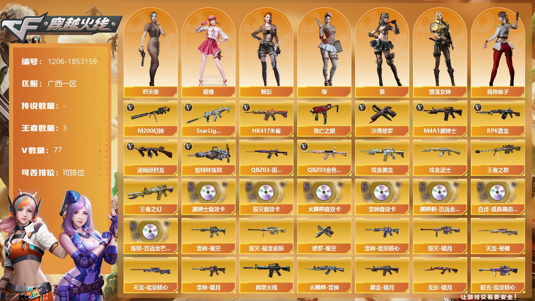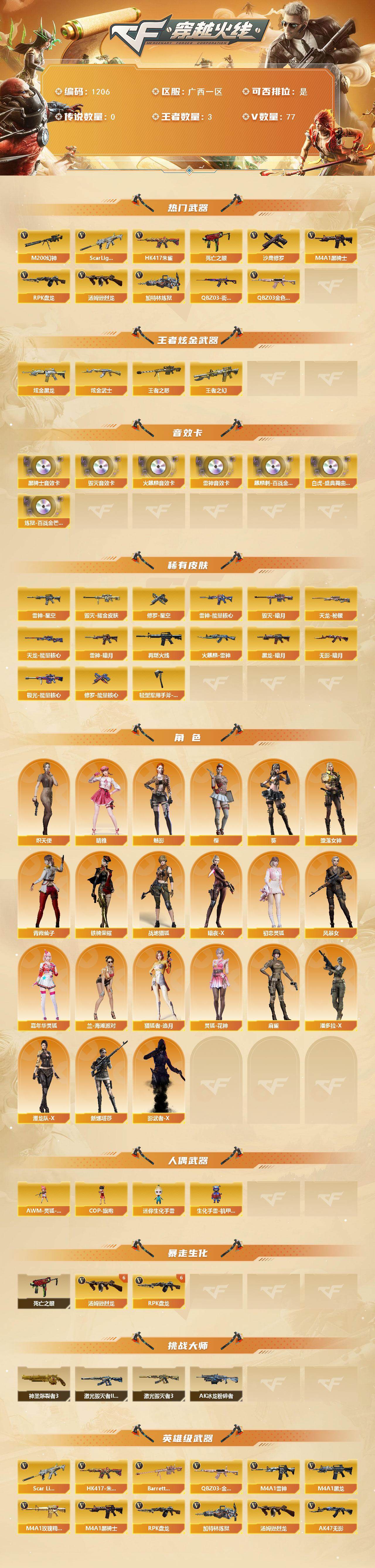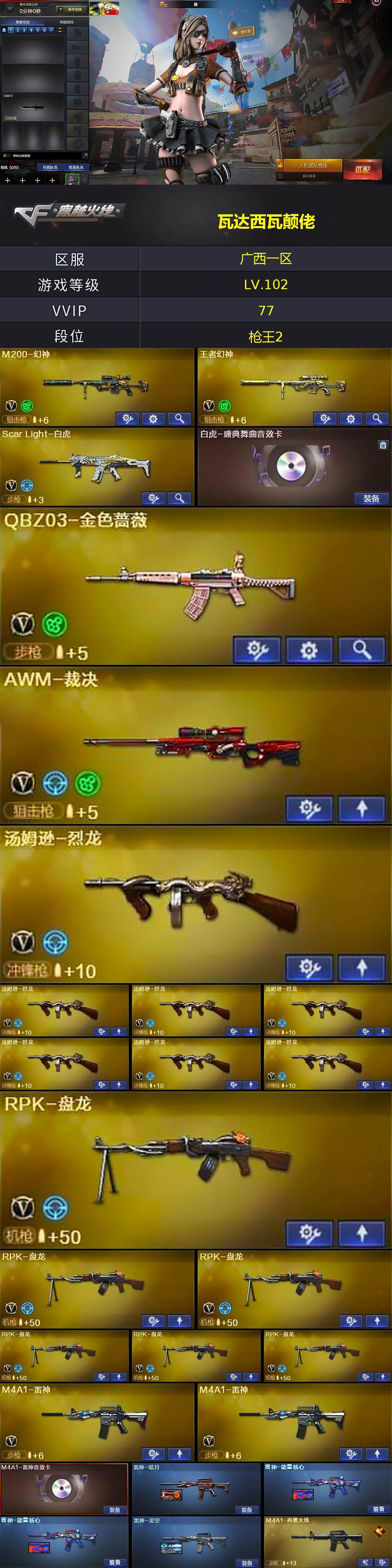 [14996508]广西一区-77V-3王者-2炫金 【热门武器】:QBZ03-金色蔷薇,Scar Light-白虎,HK417-朱雀,M200-幻神,死亡之眼*4,QBZ03-街机,M4A1-黑骑士,汤姆逊-烈龙*7,RPK-盘龙*6,加特林-炼狱,沙鹰-修罗*3 【王者炫金武器】:王者之幻,王者之怒,炫金黑龙,炫金武士 【音效卡】:AK47-火麒麟音效卡,M4A1-雷神音效卡,M4A1-黑骑士音效卡*2,Ba