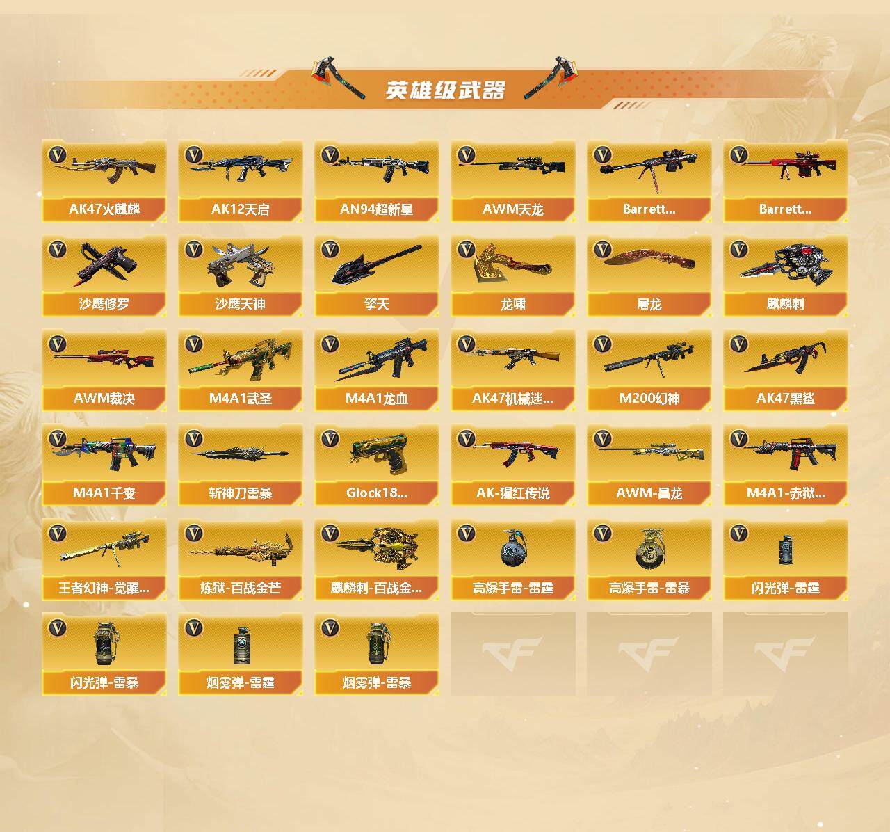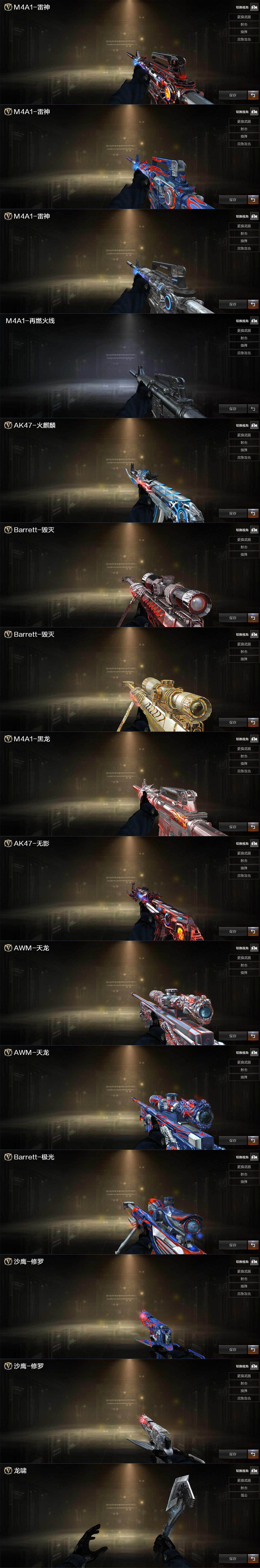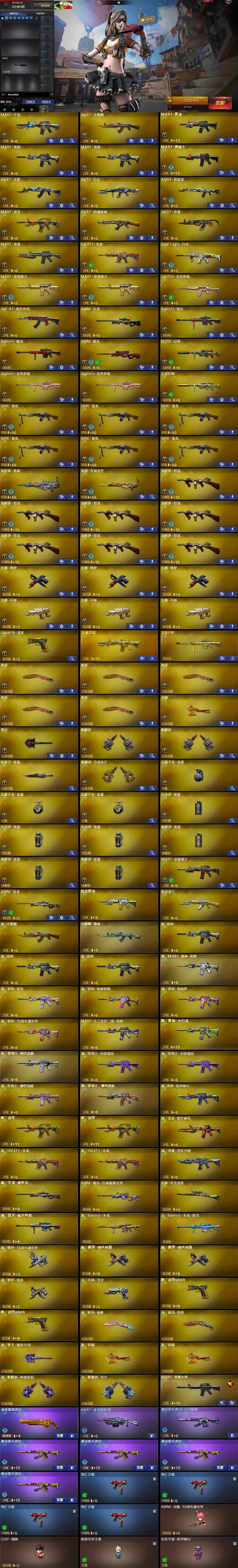 【热门武器】:QBZ03-金色蔷薇,Scar Light-白虎,HK417-朱雀,M200-幻神,死亡之眼*4,QBZ03-街机,M4A1-黑骑士,汤姆逊-烈龙*7,RPK-盘龙*6,加特林-炼狱,沙鹰-修罗*3