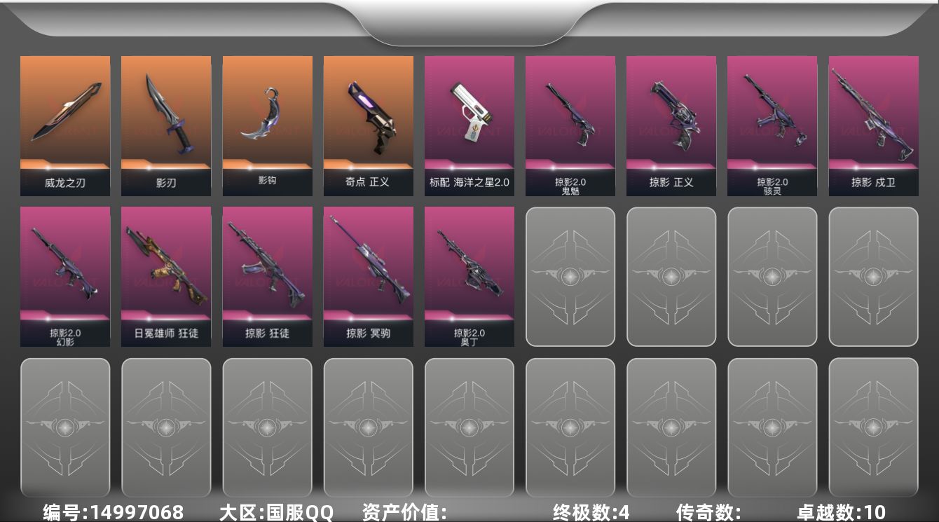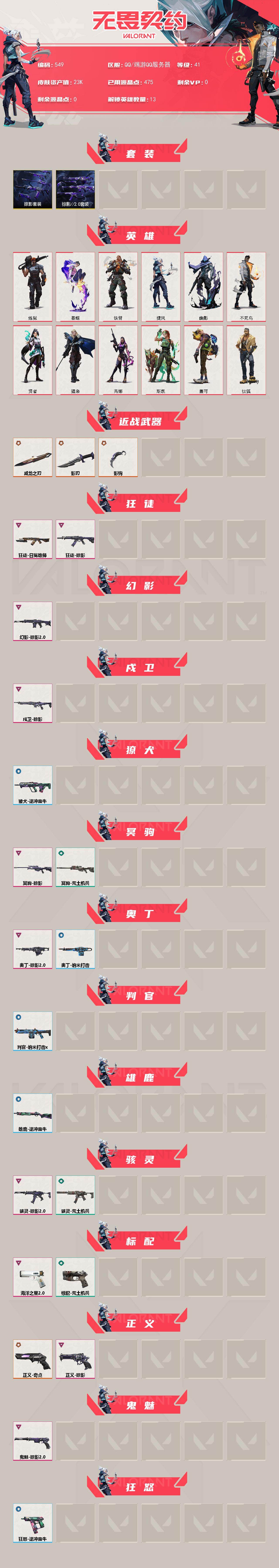[14997068]【套装】:掠影套装,掠影//2.0套装 【英雄】:炼狱,暮蝶,钛狐,铁臂,捷风,幽影,不死鸟,贤者,猎枭,芮娜,斯凯,盖可 【近战武器】:近战武器-影钩,近战武器-威龙之刃,近战武器-影刃 【狂徒】:狂徒-掠影,狂徒-日冕雄师 【幻影】:幻影-掠影//2.0 【戍卫】:戍卫-掠影 【獠犬】:獠犬-逆冲蛮牛 【冥驹】:冥驹-掠影,冥驹-荒土机兵 【奥丁】:奥丁-掠影//2.0,奥丁-纳米打击 【判官】:判官-纳米打击x 【雄鹿】:雄鹿-逆冲蛮牛 【骇灵】:骇灵-掠影//2.0,骇灵-荒土机兵 【标配】:标配-海洋之星//2.0,标配-荒土机兵 【正义】:正义-奇点,正义-掠影 【鬼魅】:鬼魅-掠影//2.0 【狂怒】:狂怒-逆冲蛮牛 【卡面】:纳米打击 卡面,抑制技术 卡面,激斗汉堡 卡面,瓦娃脸雪糕 P2 卡面,荒土机兵 卡面,银弹猎手 卡面,《双城之战》拥抱 卡面,精灵大战 卡面,欢迎来到底城 卡面,南瓜盛典 卡面,正义的化身 卡面,无畏契约GO!第一卷:芮娜 卡面,无畏契约GO!第一卷:零 卡面,《双城之战》金克丝 卡面,无畏契约GO!第一卷:贤者 卡面,代号红色 卡面,新兵报到 卡面,V契约 卡面,无畏契约 卡面 【喷漆】:请求重启 喷漆,纳米打击 喷漆,简笔画黯兽 喷漆,独守蝰腹 喷漆,他们将落荒而逃 喷漆,通缉:战术企鹅 喷漆,荒土机兵 喷漆,别挡我吃球! 喷漆,嘭! 喷漆,都算到了 喷漆,控场勿近 喷漆,买装还是存钱 喷漆,无畏契约GO!第一卷:芮娜 喷漆,无畏契约GO!第一卷:零 喷漆,无畏契约GO!第一卷:贤者 喷漆,暴走萝莉 喷漆,辣得好下饭 喷漆,飓刃涂鸦 喷漆 ,胜利属于无畏契约 喷漆,GLHF 喷漆,无畏契约 喷漆 【挂饰】:猫猫木乃伊 挂饰,水壶 挂饰,纳米打击 挂饰,伞绳 挂饰,第九季//第三幕 纪念币 挂饰,无畏契约GO!第一卷 芮娜 挂饰,鱼骨头 挂饰,薰衣草之心 挂饰,Z世代特饮 挂饰,天外飞客 挂饰,《双城之战》魄罗 挂饰,海豹的认可 挂饰,无畏契约 纪念币 挂饰