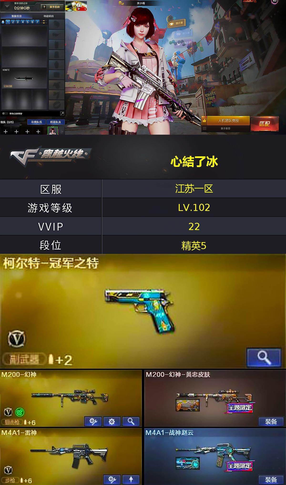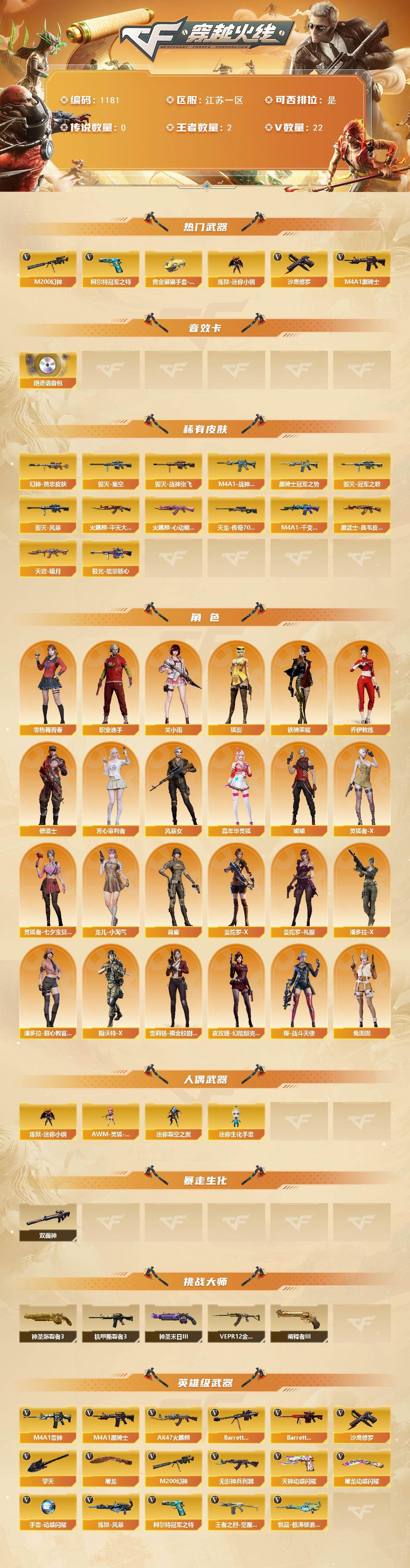 [14997230]江苏一区-22V-2王者-0炫金 【热门武器】:M200-幻神,柯尔特-冠军之特,炼狱-迷你小钢,M4A1-黑骑士*2,沙鹰-修罗*2,黄金猫猫手套-白鲨 【音效卡】:绝迹语音包 【皮肤】:M200-幻神-黄忠皮肤,M4A1-战神赵云,火麒麟-平天大圣,火麒麟-心动糖果,毁灭-星空,毁灭-冠军之怒,毁灭-战神张飞,毁灭-风暴*2,M4A1-千变-孔明皮肤,黑骑士-冠军之势,黑武士-典韦皮肤,天启-暗月,AWM-天龙-传奇70KG,极光-能量核心 【角色】:关小雨,狐影,乔伊教练,修道士,芳心审判者,风暴女,嘉年华灵狐,娟娟,零-热舞青春,灵狐者-X,灵狐者-七夕宝贝,龙儿-小淘气,麻雀,曼陀罗-X,曼陀罗-礼服,潘多拉-X,潘多拉-甜心教官,斯沃特-X,铁骑荣耀,兔囡囡,雪莉杨-摸金校尉,夜玫瑰-幻能朋克,樱-战斗天使,职业选手 【人偶武器】:炼狱-迷你小钢,AWM-灵狐-15周年嘉年华,迷你裂空之翼*2,迷你生化手雷 【暴走生化】:双面神 【挑战大师】:神圣爆裂者III,VEPR-12-金魔,机甲撕裂者III,神圣爆裂者-末日III,阐释者III 【英雄级武器】:AK47-火麒麟*3,M4A1-雷神,M4A1-黑骑士*2,无影-神兵利器,王者之烈-觉醒版,Barrett-毁灭*3,Barrett-极光,M200-幻神,炼狱-风暴,悦蓝-惊涛骇浪-觉醒版,沙鹰-修罗*2,柯尔特-冠军之特,天神-动感闪耀,屠龙,擎天,屠龙-动感闪耀,手雷-动感闪耀 【道具】:EDG炫彩背包,炫彩背包,背包-洛丽塔,超级背包,救世主-黑桃战神,绿色巨人,灵魂忍者,迷雾幽灵,生化弹匣,夺命之镰,防化服*2,金色流光-枪王排位*2,星辰流光-枪王排位,枪王排位28赛季金色流光,C4-沙漠,防弹头盔*4,防弹衣*4,C4工具钳*4,手雷包*4 【特殊枪械】:2黑骑士