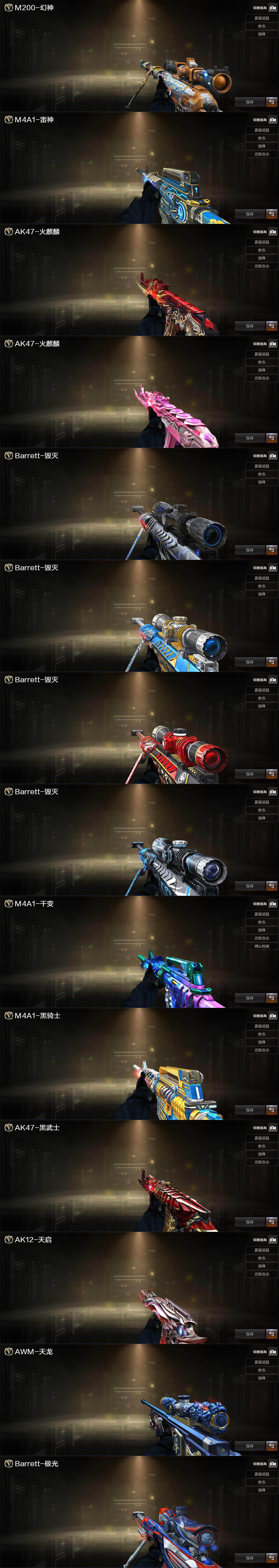 【英雄级武器】:AK47-火麒麟*3,M4A1-雷神,M4A1-黑骑士*2,无影-神兵利器,王者之烈-觉醒版,Barrett-毁灭*3,Barrett-极光,M200-幻神,炼狱-风暴,悦蓝-惊涛骇浪-觉醒版,沙鹰-修罗*2,柯尔特-冠军之特,天神-动感闪耀,屠龙,擎天,屠龙-动感闪耀,手雷-动感闪耀