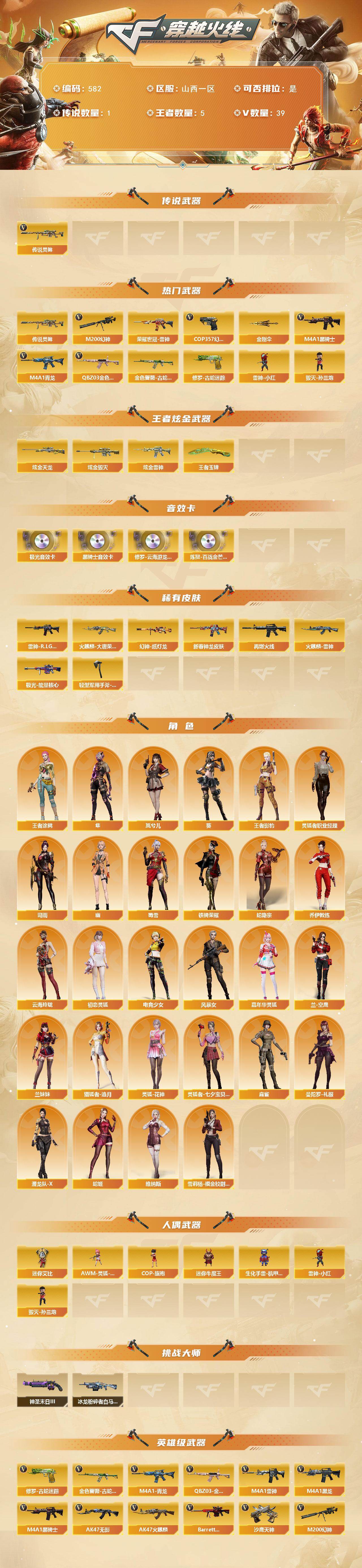 [14998630]山西一区-39V-5王者-3炫金 【传说武器】:传说灵眸 【热门武器】:传说灵眸,QBZ03-金色蔷薇,M4A1-青龙,M200-幻神,金色蔷薇-古蛇迷踪,修罗-古蛇迷踪,荣耀世冠-雷神,M4A1-黑骑士,雷神-小红,毁灭-孙三炮,COP 357-幻灵,金刚伞 【王者炫金武器】:王者玉锋,炫金雷神,炫金毁灭,炫金天龙 【音效卡】:修罗-云海游龙音效卡,M4A1-黑骑士音效卡,Barrett-极光音效卡,炼狱-百战金芒-庆典舞曲音效卡 【皮肤】:幻神-纸灯龙皮肤,雷神-R.LGD-CFPLS18冠军,M4A1-雷神-新春神龙皮肤,M4A1-再燃火线,火麒麟-雷神,火麒麟-大唐荣光,极光-能量核心,轻型军用手斧-再燃火线 【角色】:葵,岚兮儿,隼,司雨,王者涂鸦,王者影豹,蛇隐宗,乔伊教练,云海玲珑,初恋灵狐,电竞少女,风暴女,嘉年华灵狐,兰-空鹰,兰妹妹,猎狐者-追月,灵狐-花神,灵狐者-七夕宝贝,灵狐者-职业经理,麻雀,曼陀罗-礼服,潜龙队-X,蛇姬,蜀雪,铁骑荣耀,维纳斯,雪莉杨-摸金校尉,幽 【人偶武器】:雷神-小红,毁灭-孙三炮,AWM-灵狐-15周年嘉年华,COP-旗袍,迷你牛魔王,生化手雷-机甲核心*3,迷你艾比 【挑战大师】:冰龙粉碎者-白马银枪*3,神圣爆裂者-末日III 【英雄级武器】:AK47-火麒麟,M4A1-黑龙,M4A1-雷神,M4A1-黑骑士,AK47-无影,AK47-黑鲨,M4A1-青龙,金色蔷薇-古蛇迷踪,QBZ03-金色蔷薇,烈火-动感闪耀,王者火魄-觉醒版,荣耀世冠-雷神,Barrett-极光,M200-幻神,王者蔷薇-觉醒版,王者风神-觉醒版,炼狱-百战金芒,烈龙-云海游龙,沙鹰-天神*2,COP 357-幻灵,天神-动感闪耀,修罗-古蛇迷踪,幻灵之锋,屠龙-动感闪耀,擎天-云海游龙,麒麟刺-百战金芒,王者之啸-觉醒版,高爆手雷-幻灵*2,手雷-动感闪耀,手雷-云海游龙,高爆手雷-古蛇迷踪,高爆手雷-玄豹,闪光弹-幻灵,闪光弹-玄豹*2,烟雾弹-幻灵,烟雾弹-古蛇迷踪 【道具】:BS战队炫彩背包,云海游龙炫彩背包,全能枪王背包,古蛇迷踪炫彩背包,炫彩背包-诺拉,百战金芒炫彩背包,超级背包,女皇终结者-魔龙之吻,绿色巨人,灵魂忍者,变异宝贝,迷雾幽灵*2,夺命之镰,防化服,金色流光-枪王排位*2,星辰流光-枪王排位,流光-鎏金之域