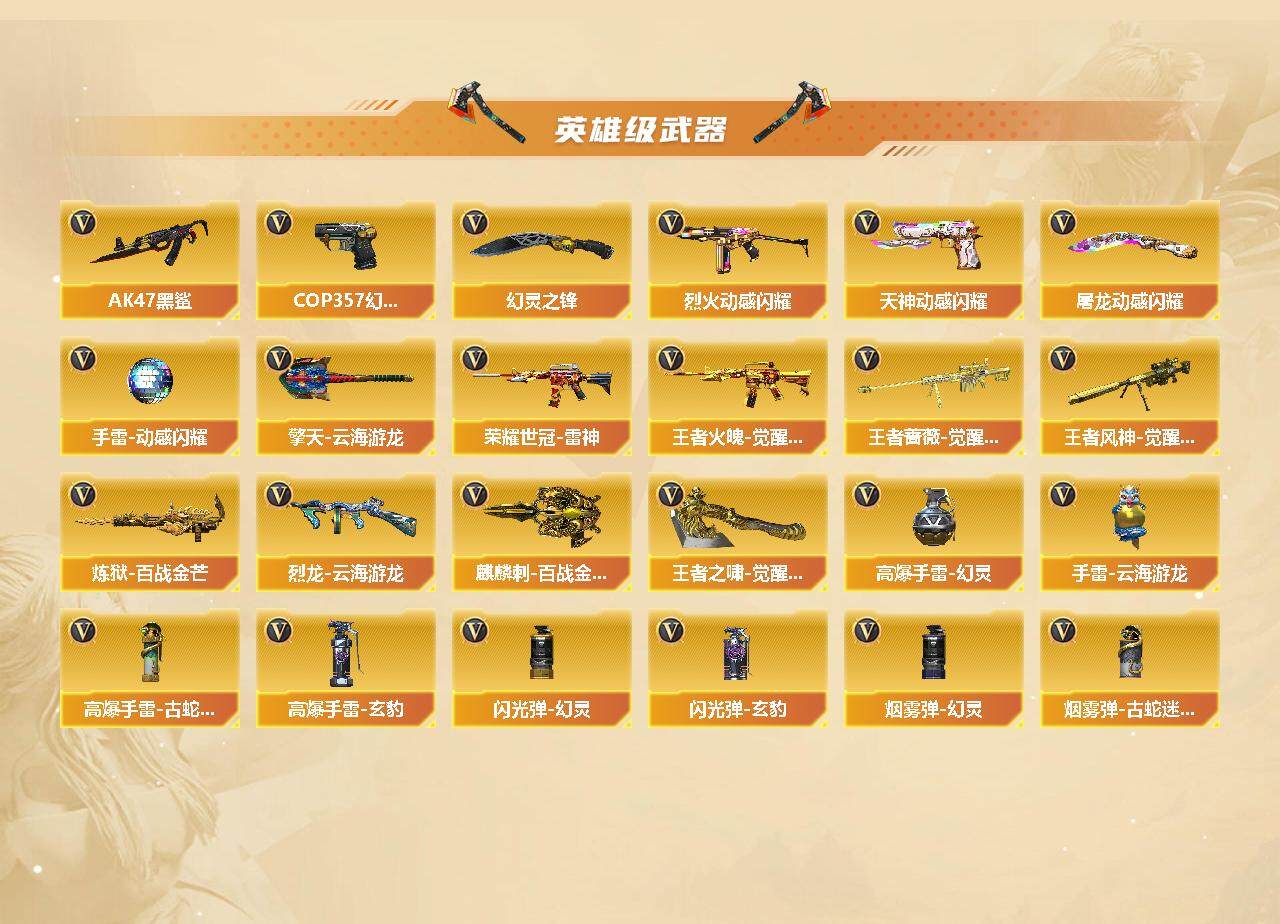 【英雄级武器】:AK47-火麒麟,M4A1-黑龙,M4A1-雷神,M4A1-黑骑士,AK47-无影,AK47-黑鲨,M4A1-青龙,金色蔷薇-古蛇迷踪,QBZ03-金色蔷薇,烈火-动感闪耀,王者火魄-觉醒版,荣耀世冠-雷神,Barrett-极光,M200-幻神,王者蔷薇-觉醒版,王者风神-觉醒版,炼狱-百战金芒,烈龙-云海游龙,沙鹰-天神*2,COP 357-幻灵,天神-动感闪耀,修罗-古蛇迷踪,幻灵之锋,屠龙-动感闪耀,擎天-云海游龙,麒麟刺-百战金芒,王者之啸-觉醒版,高爆手雷-幻灵*2,手雷-动感闪耀,手雷-云海游龙,高爆手雷-古蛇迷踪,高爆手雷-玄豹,闪光弹-幻灵,闪光弹-玄豹*2,烟雾弹-幻灵,烟雾弹-古蛇迷踪