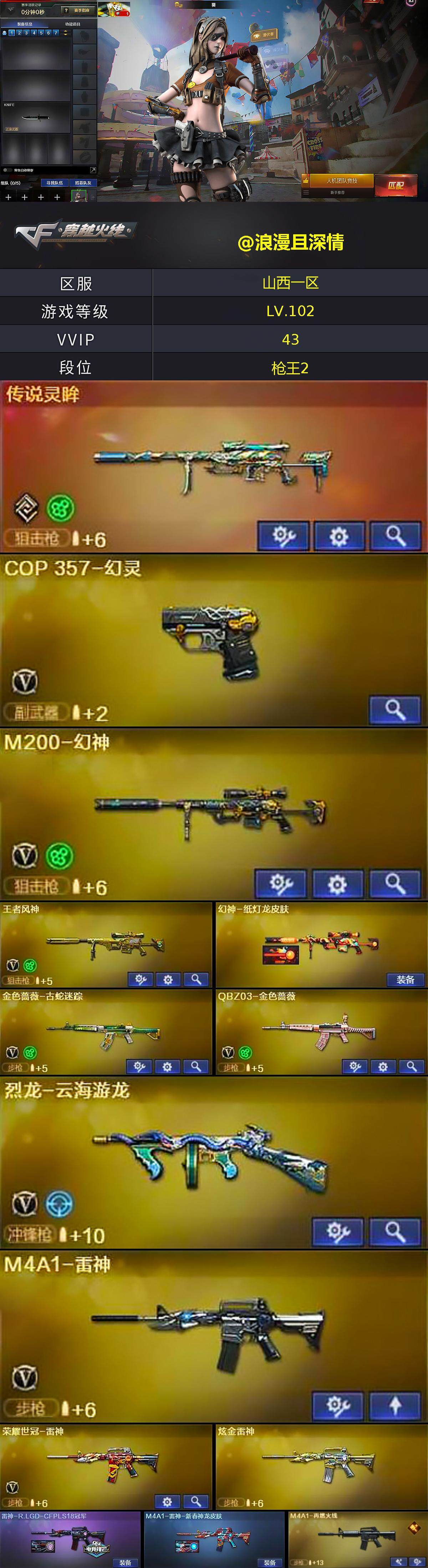 【热门武器】:传说灵眸,QBZ03-金色蔷薇,M4A1-青龙,M200-幻神,金色蔷薇-古蛇迷踪,修罗-古蛇迷踪,荣耀世冠-雷神,M4A1-黑骑士,雷神-小红,毁灭-孙三炮,COP 357-幻灵,金刚伞
