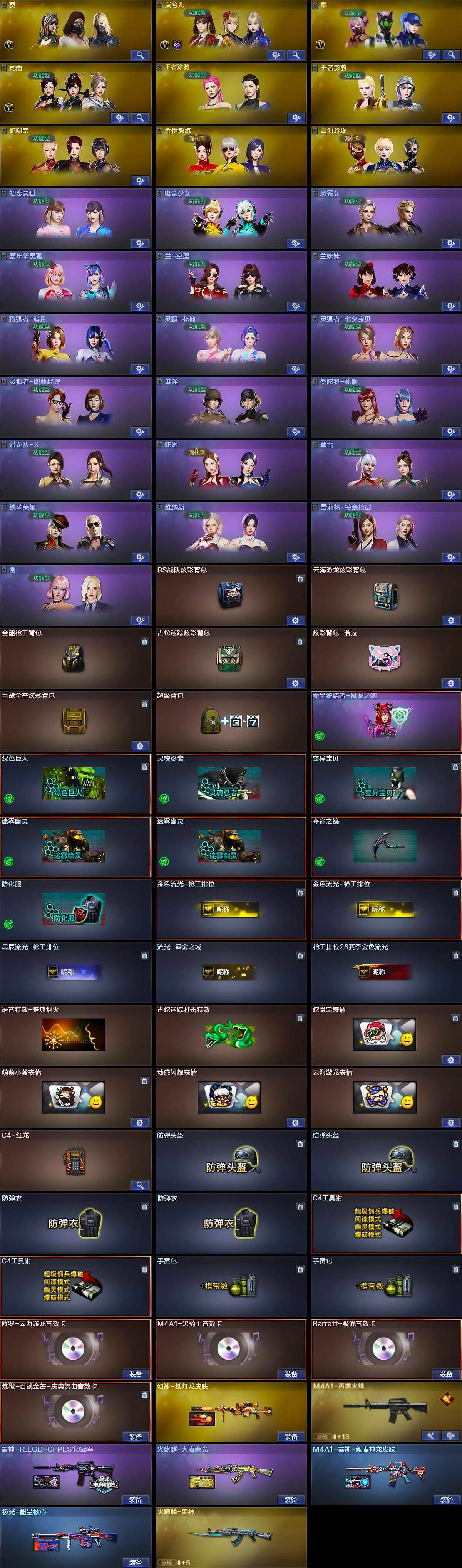 - [15247673]山西一区-51V-3王者-2炫金 【热门武器】:QBZ03-金色蔷薇*2,金色蔷薇-古蛇迷踪,修罗-古蛇迷踪,M200-竞技荣光,汤姆逊-烈龙,裁决-雪莉杨,沙鹰-修罗*4 【王者炫金武器】:王者之心,炼狱-悦蓝,炫金黑龙,炫金修罗 【皮肤】:雷神-暗月,雷神-源计划2.0专属 皮肤,雷神-化蛇 皮肤,毁灭-暗月,黑骑士-暗月*2,无影-暗月,天启-暗月,天龙-能量核心,极光-能量核心,修罗-能量核心,天神-暗月 【角色】:零,电竞教官-云悠悠,蛇隐宗,云海玲珑,暗夜-X,电竞少女,风暴女,疾风,0号玩家,灵狐-花神,玫瑰花神,蛇姬,铁骑荣耀,智影 【人偶武器】:裁决-雪莉杨,Barrett-云海玲珑,生化手雷-机甲核心*2 【暴走生化】:超级对讲机 【英雄级武器】:AK47-火麒麟,M4A1-雷神,AK12-天启,AK47-机械迷城,黑武士-锦绣游龙,金色蔷薇-古蛇迷踪,QBZ03-金色蔷薇*2,王者之魄-觉醒版,AWM-天龙,Barrett-极光,M200-竞技荣光,汤姆逊-烈龙,沙鹰-修罗*4,沙鹰-天神*2,柯尔特-竞技荣光,修罗-古蛇迷踪,屠龙*2,龙啸,擎天,麒麟刺*3,擎天-竞技荣光,高爆手雷-竞技荣光*7,高爆手雷-古蛇迷踪,闪光弹-竞技荣光*7,烟雾弹-竞技荣光*7,烟雾弹-古蛇迷踪,M4A1-赤狱骑士 【道具】:AG战队炫彩背包,CFS限定背包,云山科技背包,亚洲杯纪念炫彩背包,古蛇迷踪炫彩背包,炫彩背包,超级背包,救世主-黑桃战神,绿色巨人,灵魂忍者*2,变异宝贝,迷雾幽灵*2,夺命之镰,防化服*3,金色流光-枪王排位,星辰流光-枪王排位,枪王排位28赛季金色流光,枪王排位29赛季金色流光,古蛇迷踪打击特效,蛇隐宗表情,EP战队名片,EP战队喷图,EP战队击杀图标,防弹头盔*3,防弹衣*3,C4工具钳*3,手雷包*3 【特殊枪械】:1烈龙