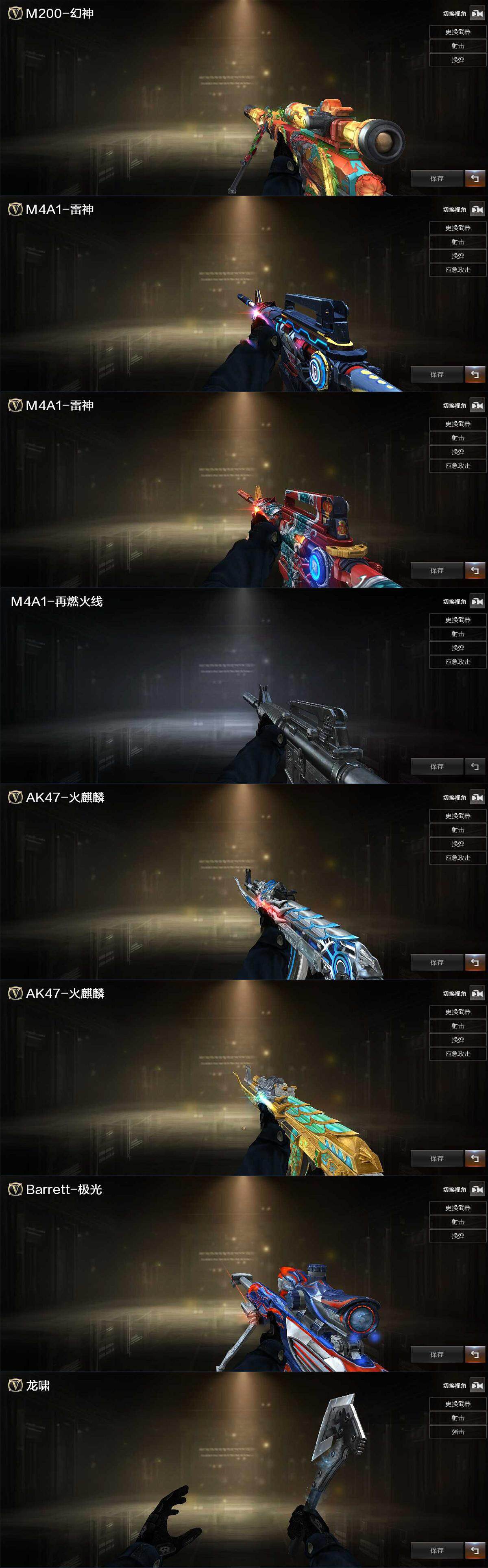 【皮肤】:幻神-纸灯龙皮肤,雷神-R.LGD-CFPLS18冠军,M4A1-雷神-新春神龙皮肤,M4A1-再燃火线,火麒麟-雷神,火麒麟-大唐荣光,极光-能量核心,轻型军用手斧-再燃火线