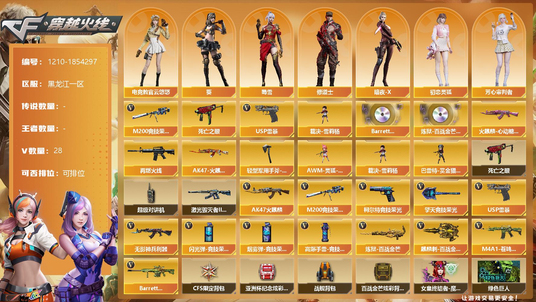[14998716]黑龙江区-28V-0王者-0炫金 【热门武器】:M200-竞技荣光,死亡之眼,裁决-雪莉杨,USP-雷暴 【音效卡】:Barrett-碧霄极光音效卡,炼狱-百战金芒-庆典舞曲音效卡 【皮肤】:M4A1-再燃火线,火麒麟-心动糖果,AK47-火麒麟-百城23冠军皮肤,轻型军用手斧-再燃火线 【角色】:葵,电竞教官-云悠悠,修道士,暗夜-X,初恋灵狐,芳心审判者,嘉年华灵狐,灵狐者-X,麻雀,潘多