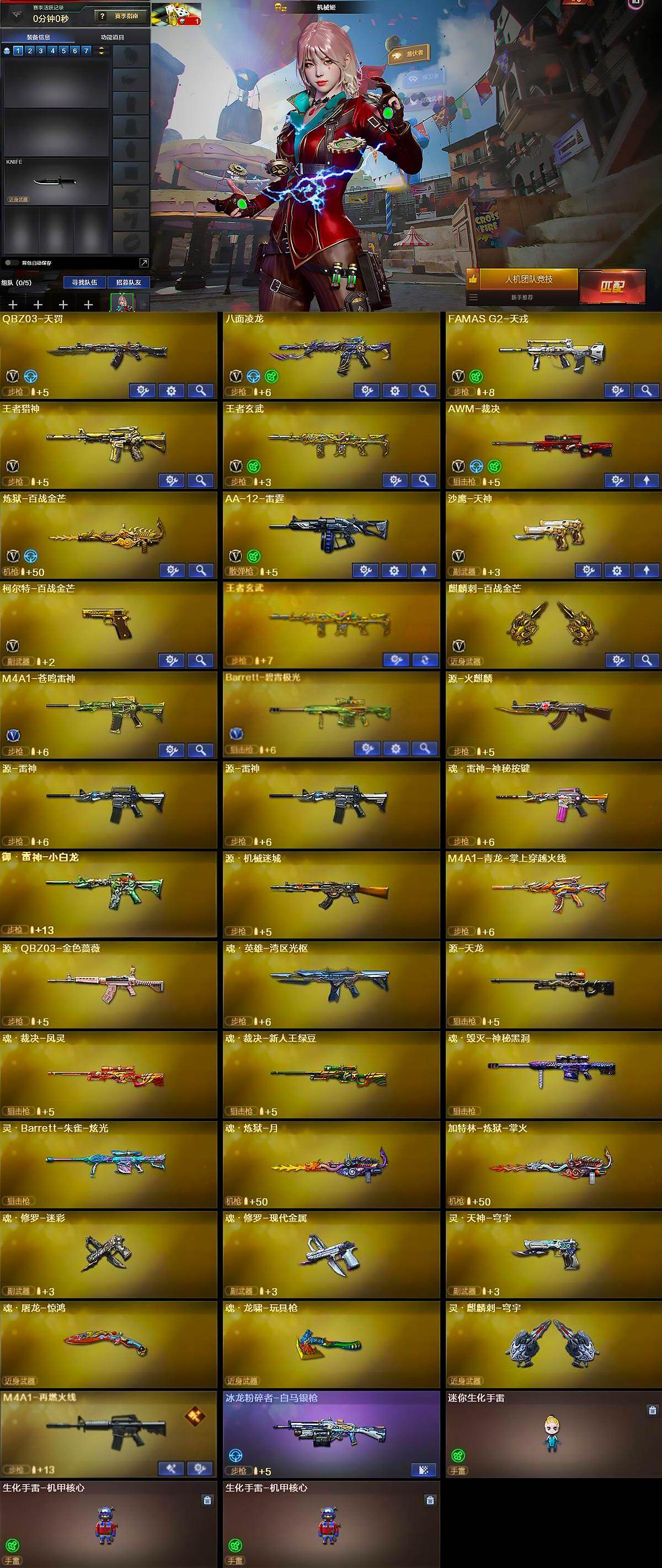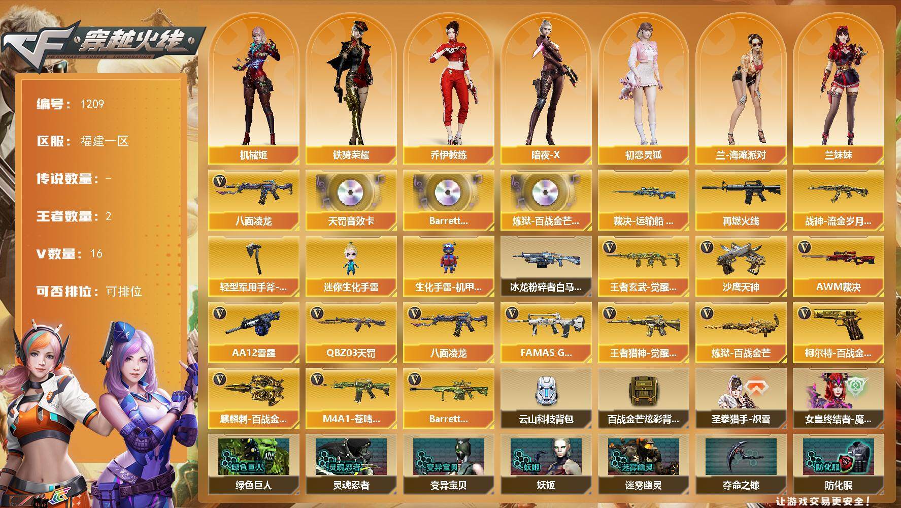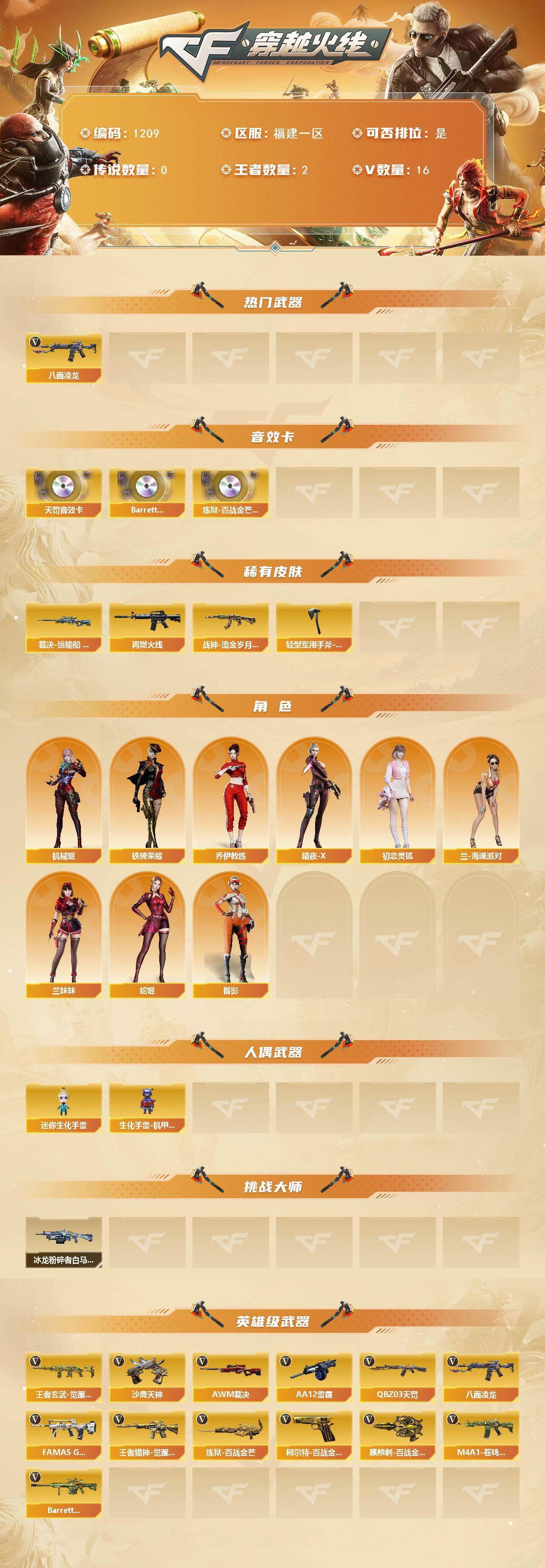 [15000003]福建一区-16V-2王者-0炫金 【热门武器】:八面凌龙 【音效卡】:QBZ03-天罚音效卡,Barrett-碧霄极光音效卡,炼狱-百战金芒-庆典舞曲音效卡 【皮肤】:裁决-运输船 皮肤,M4A1-再燃火线,战神-流金岁月皮肤,轻型军用手斧-再燃火线 【角色】:机械姬,乔伊教练,暗夜-X,初恋灵狐,兰-海滩派对,兰妹妹,蛇姬,铁骑荣耀,智影 【人偶武器】:迷你生化手雷,生化手雷-机甲核心*2