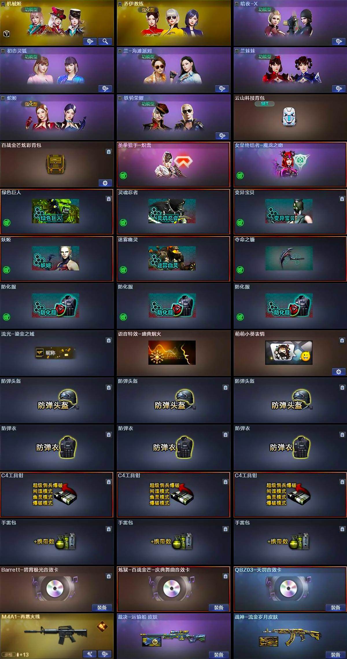 - [9796325]战神框🌟红螳螂 蓝螳螂 木乃伊 小丑🤡 冰雪❄️ 天网 都市猎人 Y2634/赤蝎 小金鞋 巧克力 2B战斗服 熊大熊二 极限特训 粉色回忆 粉糯咩咩🐑 LED眼罩 第五大道 🈵级暖熊萌萌M4 布尔玛摩托🏍️ 23👗14🔫3🈵️1🚗实名: 可修改 时装数: 960 载具数: 1 枪械数: 296 战备数: 203 热门装扮: 奇异狩猎者,梦幻火箭(新101),蝶舞迷情,极限特训,甜心巧克力,呆萌铁蟹,数码大师,怪诞乔克,深海小丑鱼,星之信仰,宝贝奶油派,天使彩虹糖,梦魇先生,放客神游,万圣娃娃,迅捷狂鲨,鹰眼刺客,智能音符,好奇恐龙,粉色回忆,都市猎人,香水柠檬,炙焰红王,雪国幻梦,冥河战士,2号机款机体服,赤蝎幽灵,派对舞王,第五大道,小可学妹,呆萌星弥,未来歌姬,炫光之旅,宙之时溯,圣堂之誓,幻彩电音 载具: 布尔玛摩托车 稀有枪皮: M416心之恋语,Groza香水柠檬,AKM梦之光华,UMP45恐龙拽拽,UZI筑梦精灵,M416暖熊萌萌,MG3梦幻舞会,Kar98K未来歌姬,P90能量风暴,P90粉樱探戈,AMR炫光之旅,SCAR-L彩装战姬,Kar98K-巳巳如意,AUG-暖羊咩咩