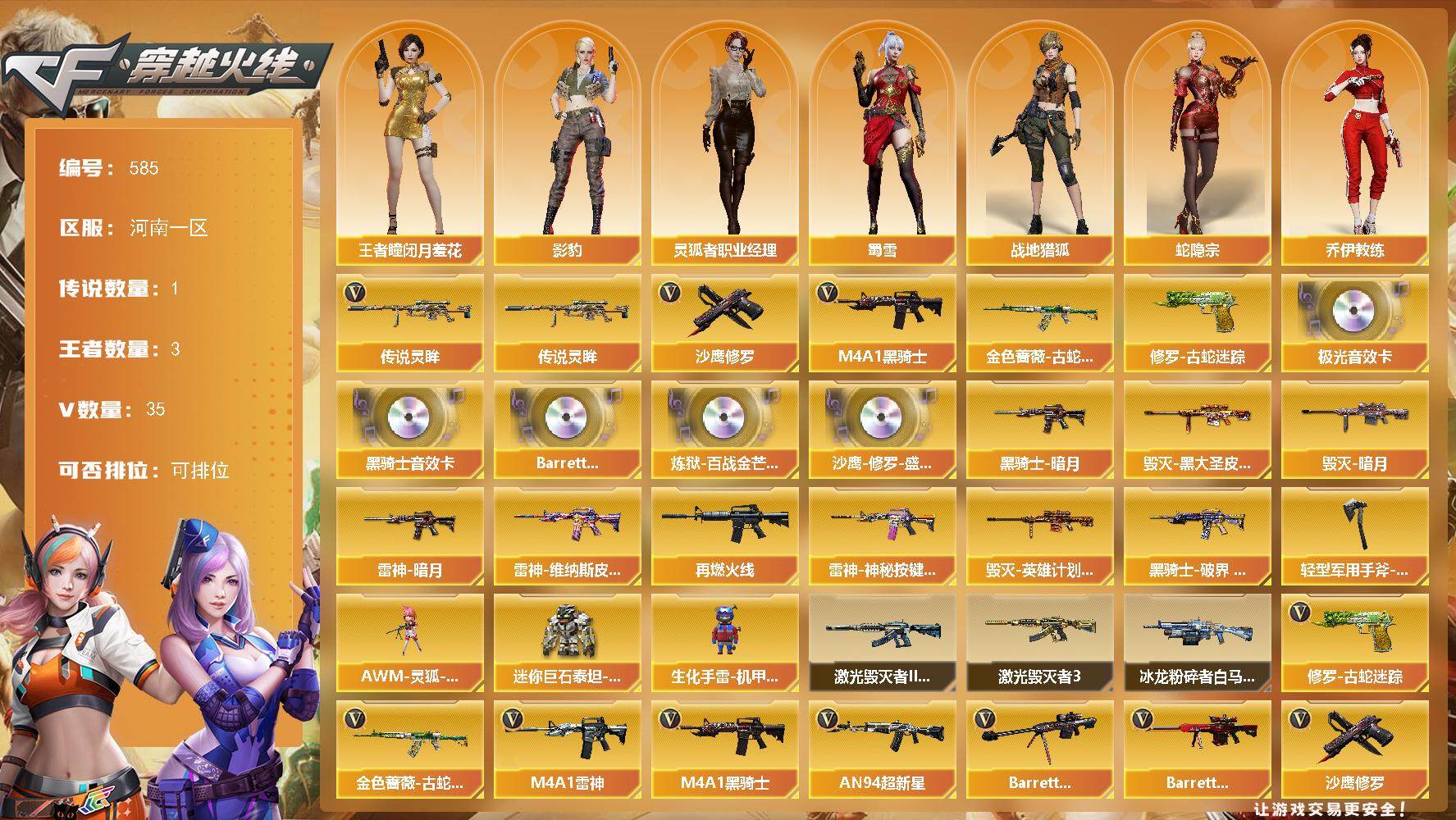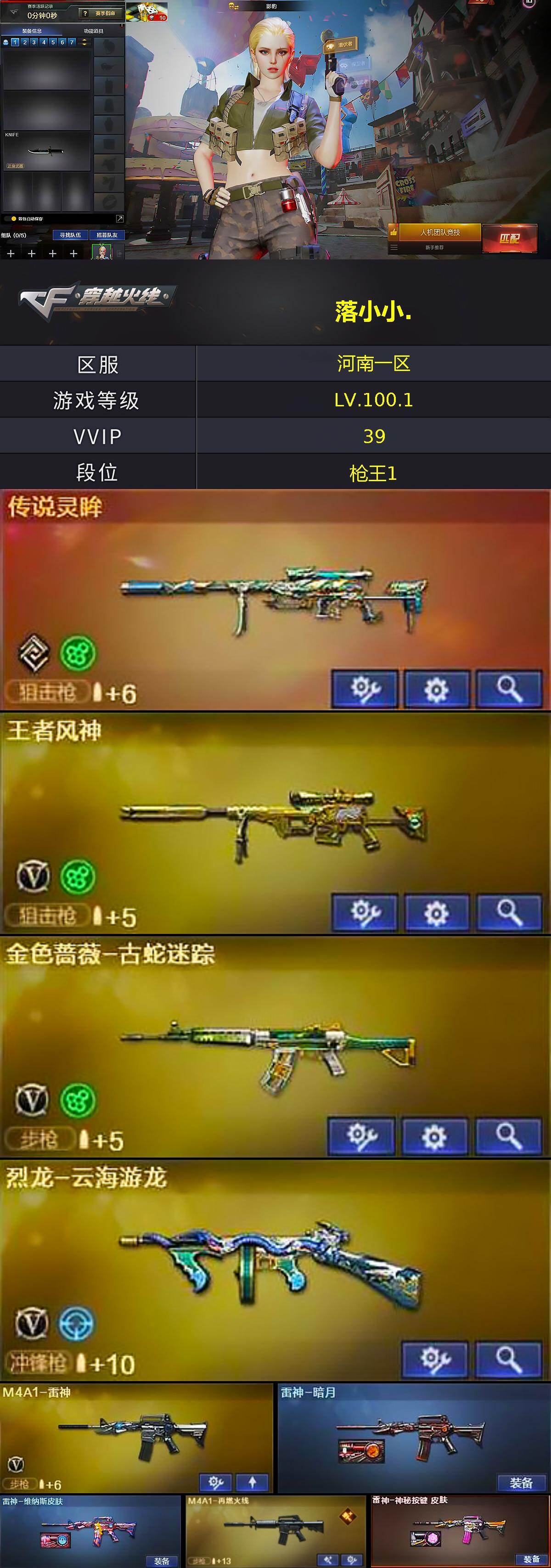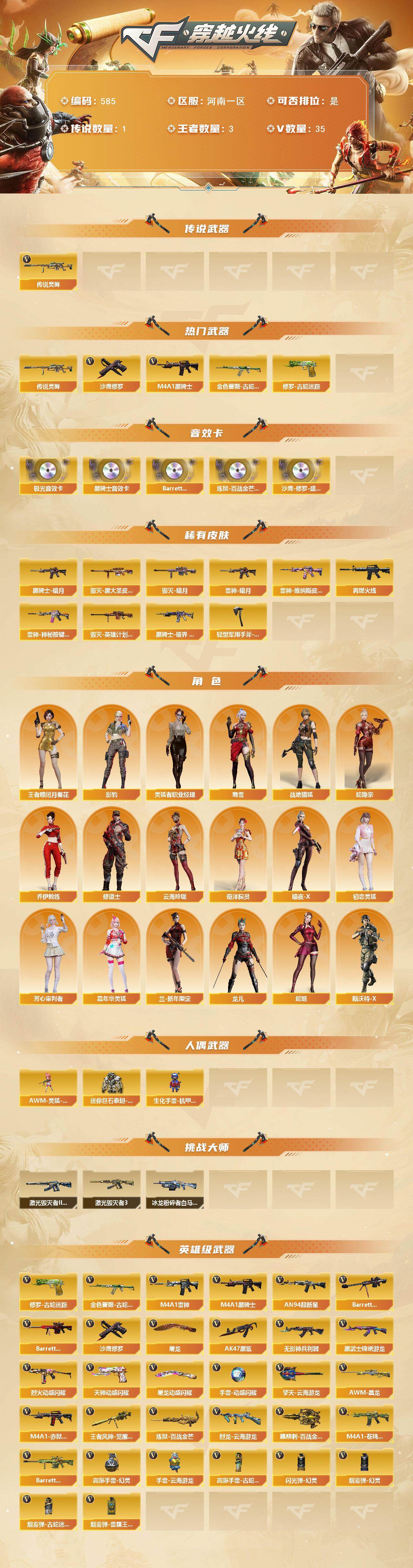 [15001701]河南一区-35V-3王者-0炫金 【传说武器】:传说灵眸 【热门武器】:传说灵眸,金色蔷薇-古蛇迷踪,修罗-古蛇迷踪,M4A1-黑骑士,沙鹰-修罗*3 【音效卡】:M4A1-黑骑士音效卡,Barrett-极光音效卡,Barrett-碧霄极光音效卡,炼狱-百战金芒-庆典舞曲音效卡,沙鹰-修罗-盛典舞曲音效卡 【皮肤】:雷神-暗月,雷神-维纳斯皮肤,M4A1-再燃火线,雷神-神秘按键 皮肤,毁灭-暗月,毁灭-黑大圣皮肤,毁灭-英雄计划 皮肤,黑骑士-暗月,黑骑士-破界 皮肤,轻型军用手斧-再燃火线 【角色】:影豹,战地猎狐,王者-瞳-闭月羞花,蛇隐宗,奇洋探员,乔伊教练,修道士,云海玲珑,暗夜-X,初恋灵狐,芳心审判者,嘉年华灵狐,兰-新年限定,灵狐者-职业经理,龙儿,蛇姬,斯沃特-X,蜀雪 【人偶武器】:AWM-灵狐-15周年嘉年华,生化手雷-机甲核心*4,迷你巨石泰坦-魔花研究所 【挑战大师】:冰龙粉碎者-白马银枪*2,激光毁灭者III-白马银枪,激光毁灭者III 【英雄级武器】:M4A1-雷神,M4A1-黑骑士,AN94-超新星,AK47-黑鲨,无影-神兵利器,黑武士-锦绣游龙,金色蔷薇-古蛇迷踪,烈火-动感闪耀,Barrett-毁灭,Barrett-极光,王者风神-觉醒版,炼狱-百战金芒,烈龙-云海游龙,沙鹰-修罗*3,天神-动感闪耀,修罗-古蛇迷踪,屠龙,屠龙-动感闪耀,擎天-云海游龙,麒麟刺-百战金芒,高爆手雷-幻灵*2,手雷-动感闪耀,手雷-云海游龙,高爆手雷-古蛇迷踪,闪光弹-幻灵*2,烟雾弹-幻灵*3,烟雾弹-古蛇迷踪,烟雾弹-雷霆王者-觉醒版,M4A1-赤狱骑士,M4A1-苍鸣雷神,AWM-昌龙,Barrett-碧霄极光 【道具】:BS战队炫彩背包,CFS限定背包,云山科技背包,云海游龙炫彩背包,全能枪王背包,古蛇迷踪炫彩背包,女皇终结者-背包,牛魔王背包-至尊黄金,百战金芒炫彩背包,超级背包,哔哩哔哩名片,女皇终结者-魔龙之吻,救世主-黑桃战神,绿色巨人,灵魂忍者*2,变异宝贝,迷雾幽灵*2,生化弹匣,夺命之镰,防化服*3,金色流光-枪王排位*2,星辰流光-枪王排位,流光-鎏金之域,枪王排位28赛季金色流光,枪王排位29赛季金色流光,语音特效-盛典烟火,古蛇迷踪打击特效,蛇隐宗表情,萌萌小葵表情,动感闪耀表情,云海游龙表情,EP战队名片,EP战队